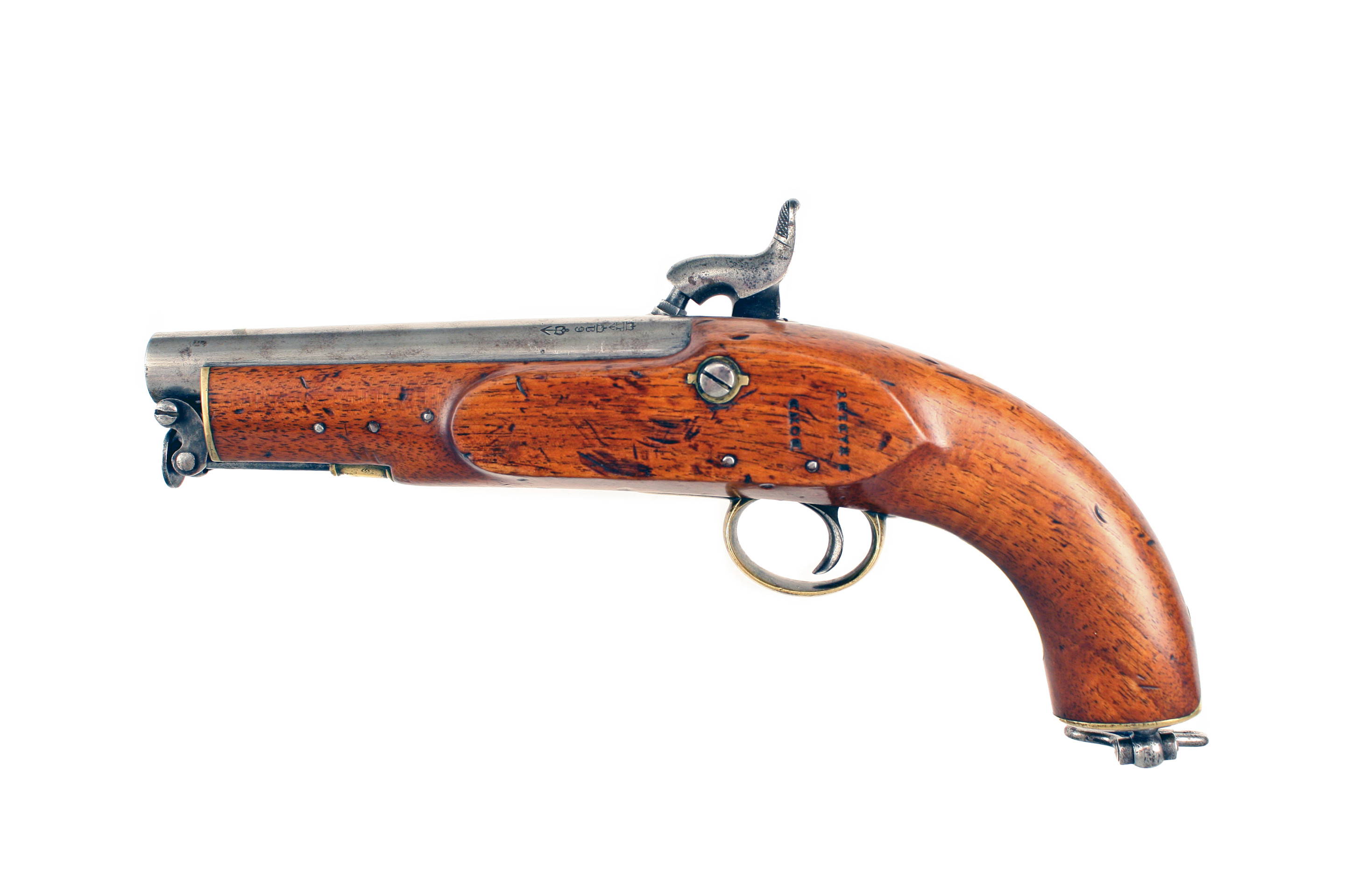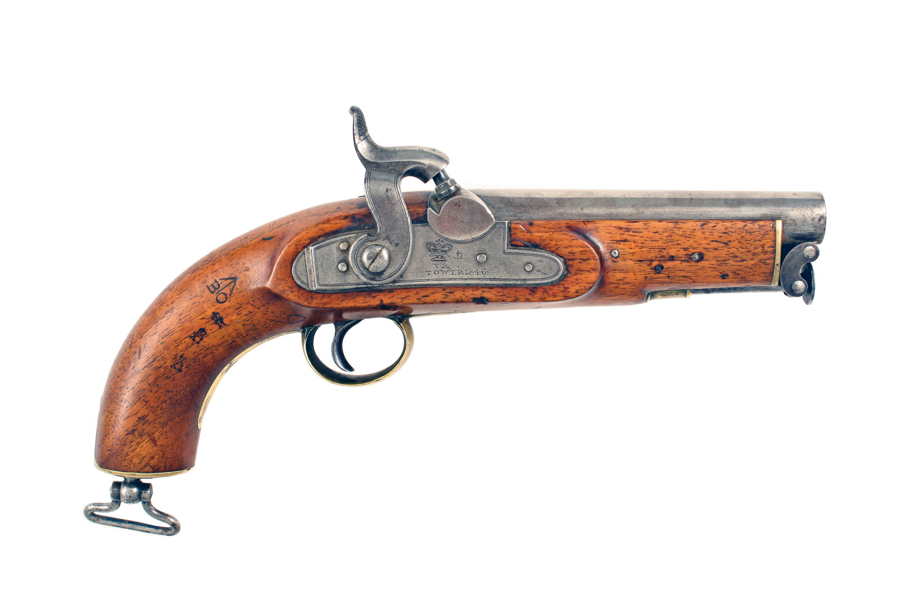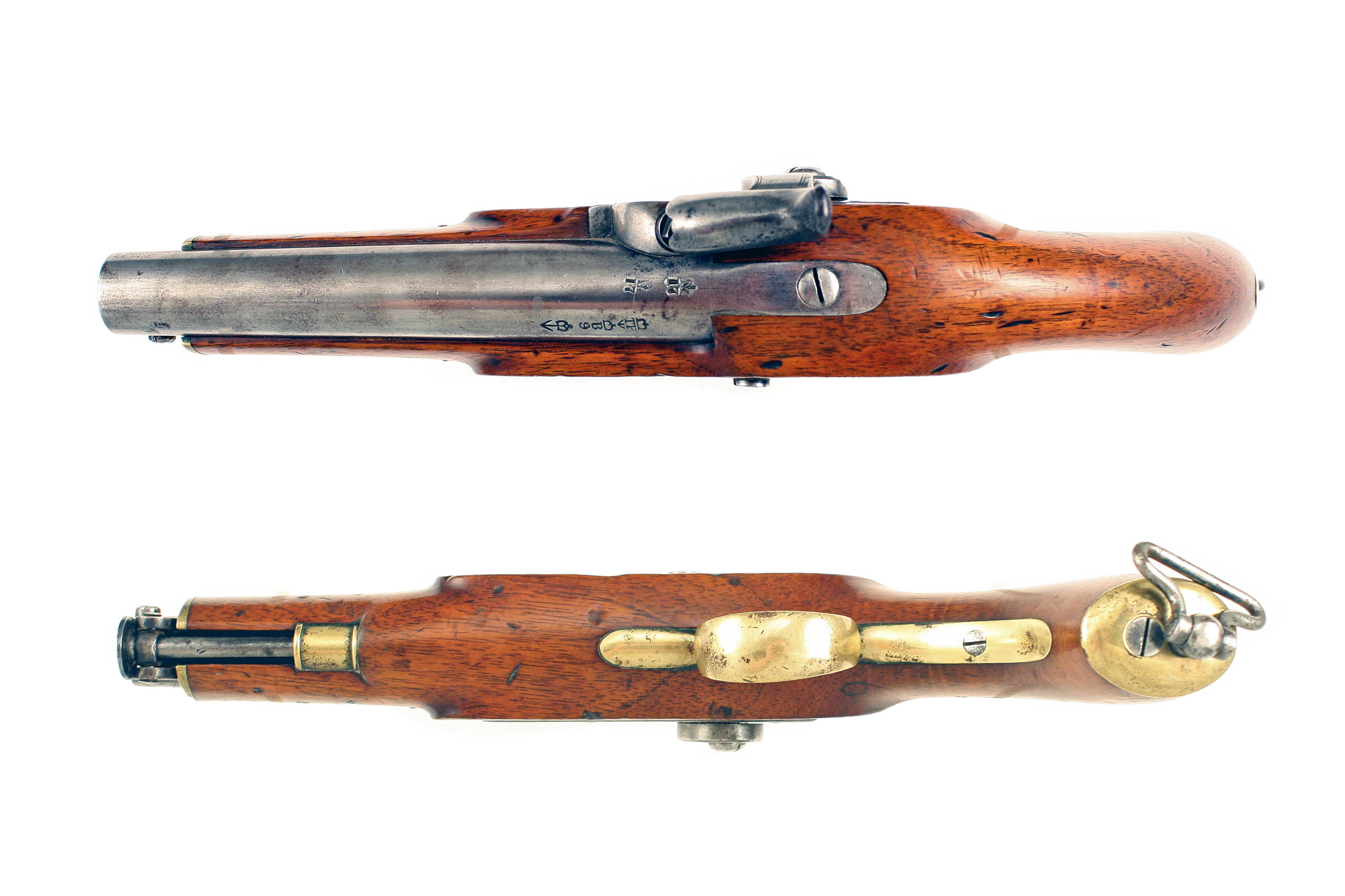 A Good Percussion Sea Service Pistol, Dated 1846. With round barrel struck with numerous Government viewing and proofs marks, border engraved lock, stamped with crowned VR and TOWER 1846, full-stocked in walnut, stamped with Ordnance marks, regulation brass mounts comprising trigger guard, buttons cap and lanyard ring, and captive ramrod pipe fitted with captive ramrod. In nice clean working condition and order.