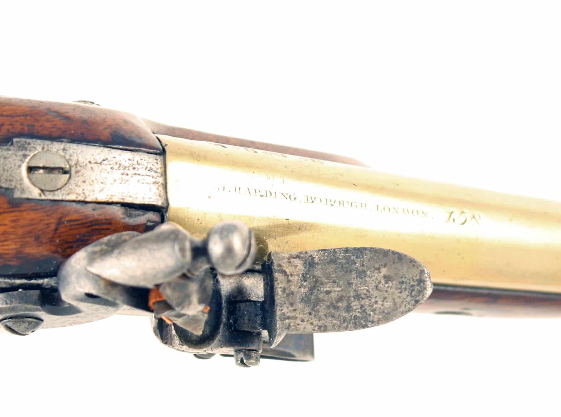 A Flintlock Mail Coach Pistol by J. Harding, No. 158. With brass barrel signed in full and numbered along the top flat towards the breech, J HARDING BOROUGH LONDON 158, stamped with Hardings proofs and London proofs and engraved FOR HIS MAJESTYS MAIL COACHES around the muzzle, plain steel tang, signed flat bevelled lock fitted with sliding safety catch, dated 1800 on the tail and stamped with Hardings proof, figured walnut full-stock (spliced rapid to fore-end) with rounded butt, brass mounts of regulation type, with scrolling side-plate, butt cap and trigger guard, brass ramrod pipes with brass tipped ramrod.