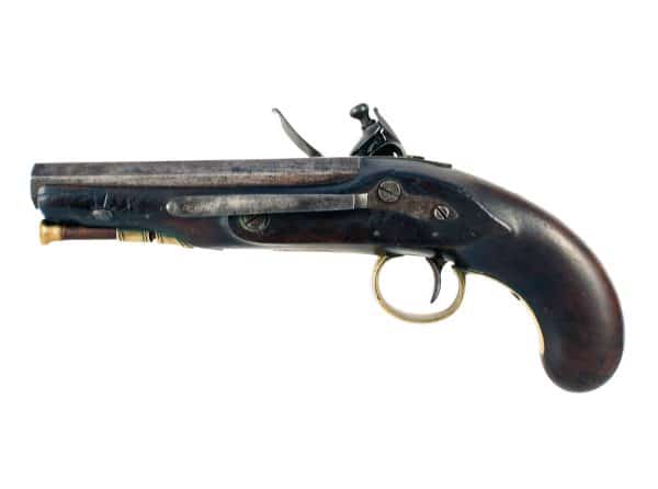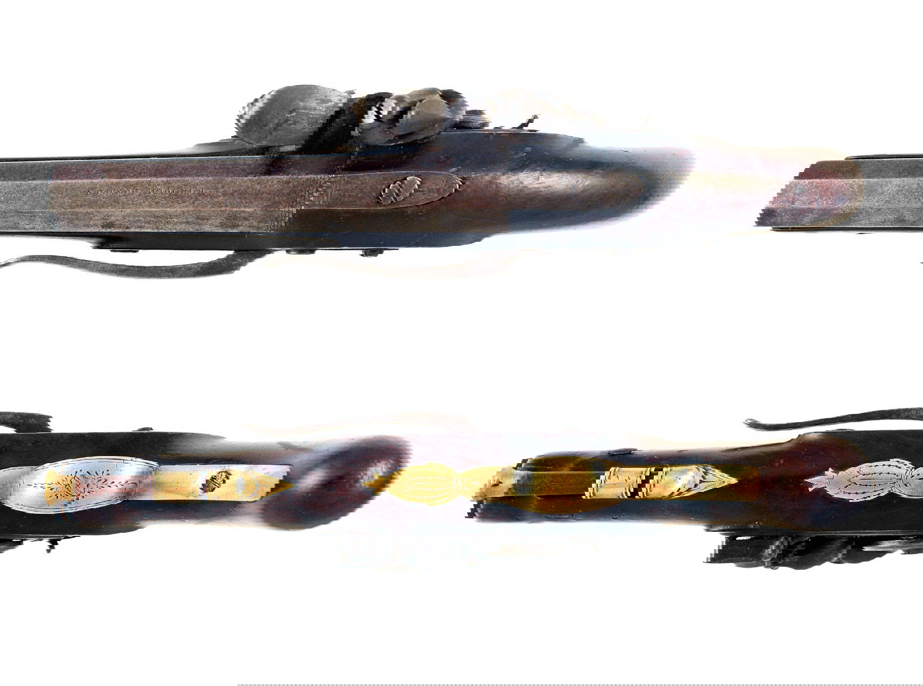 An untouched flintlock overcoat pistol with belt hook by J. Harding of Mail Coach pattern, either for Inspectors of Mail Coaches or Post Boys. With octagonal barrel stamped ‘BOROUGH LONDON’ along the top flat, decorated with a band of geometric design toward the breech, border engraved tang and screw, stepped bevelled lock, fitted with a sliding safety catch and signed ‘HARDING’, full-stocked in walnut with brass furniture including trigger guard decorated with a shield on the bow and pineapple finial, brass ramrod pipes and brass tipped ramrod. With steel belt hook fitted to the side. An interesting pistol.