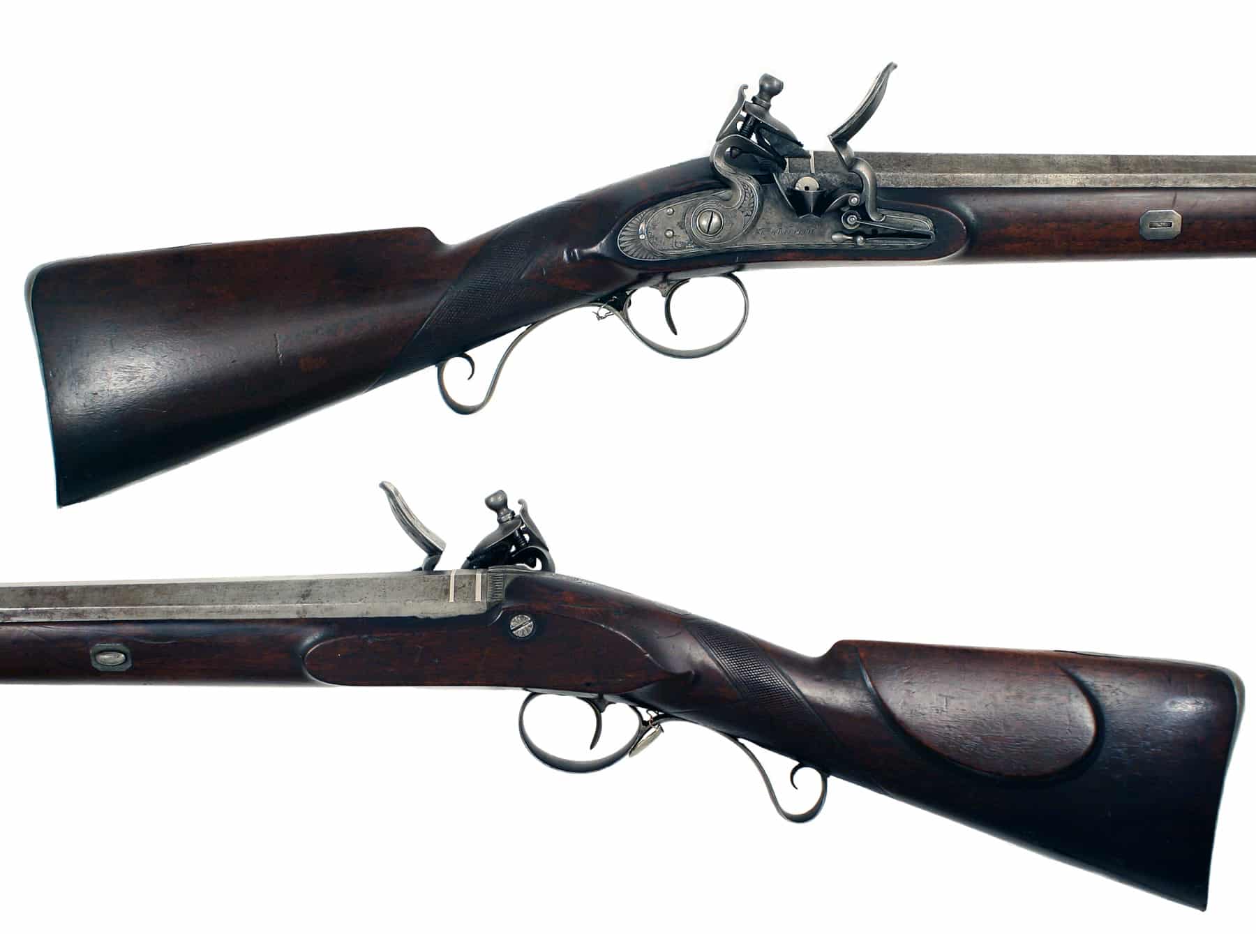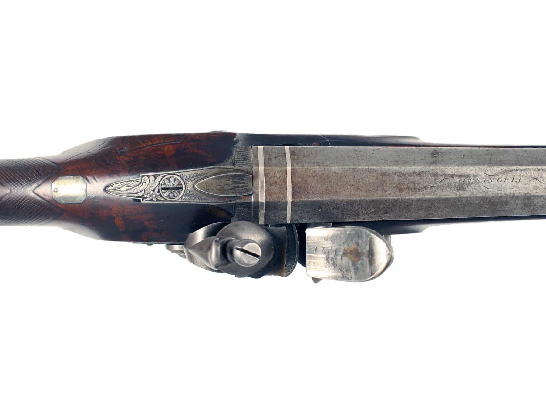 A Rare 8-Bore Flintlock Duck Gun, K. Griffith, Alexandria, Circa 1835. With swamped twist tel-stage barrel with silver bead fore-sight, inscribed Alexandria on the octagonal breech and with two platinum lines at the rear and platinum-line touch-hole, engraved grooved tang, signed case-hardened border engraved flat bevelled lock with stepped tail, roller, rainproof pan, and forward cutting comb on the cob, figured walnut half-stock, chequered grip, engraved iron mounts in the English manner, silver escutcheon, horn fore-end cap, and original horn-tipped ramrod with worm.