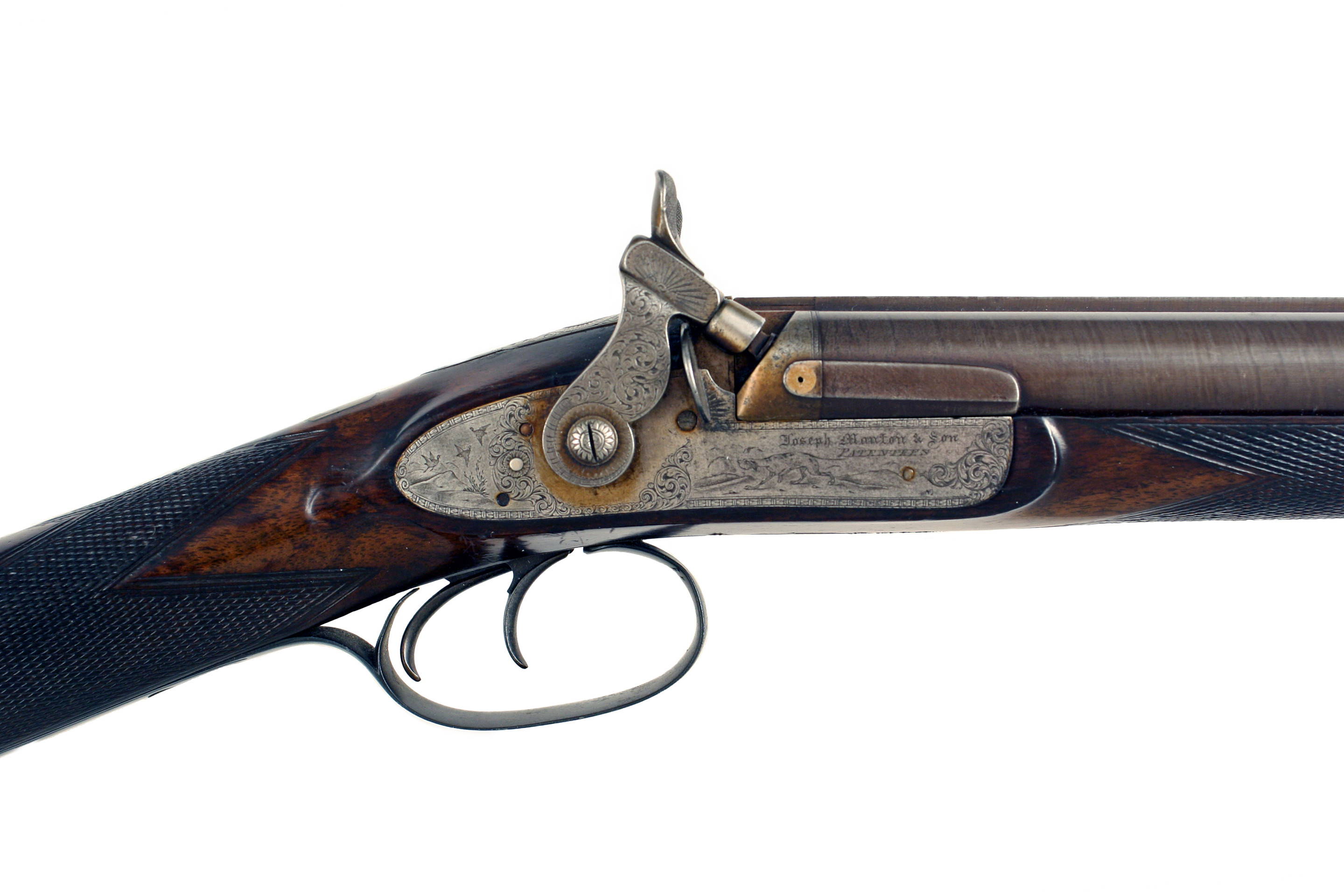 A Percussion Sporting Gun by Joseph Manton & Son. With a sighted barrels engraved, ‘Joseph Manton & Son Patent 6 HOLLES STREET Cavendish Square LONDON’ (small surface scuff to one side of the barrel) numbered ‘9506’ underneath the barrels and stamped with London proofs, profusely engraved tang cut with a shallow sighting groove, beautifully border engraved locks, both signed ‘Joseph Manton & Son PATENTEES’ decorated with game and shooting scenes and decorated with scrolling foliage throughout, half stocked in walnut cut with chequering at the the wrist and fore-end, engraved re-blued mounts comprising butt plate, numbered trigger guard and ramrod throat pipes, brass tipped ramrod with concealed worm.