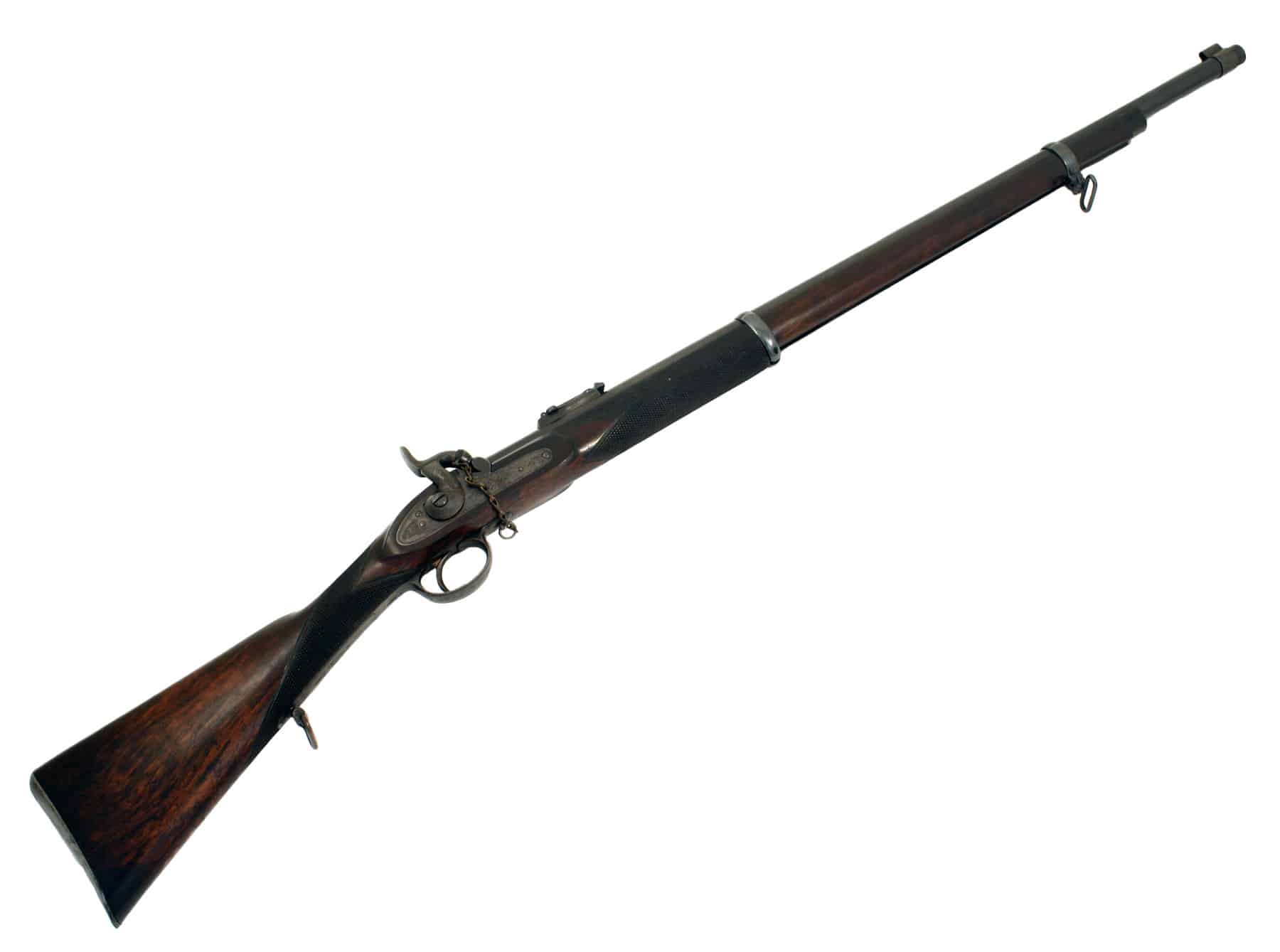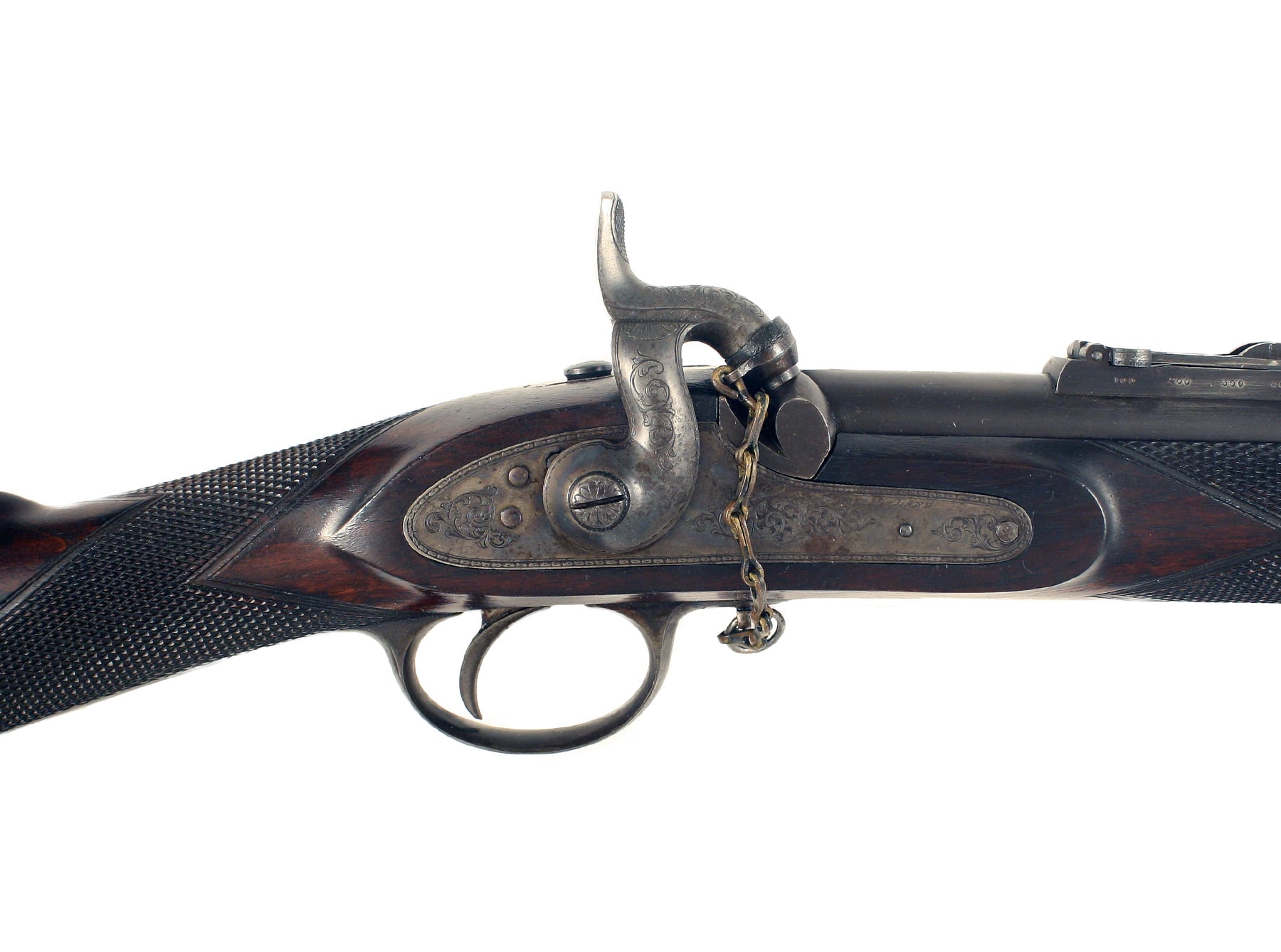A Fine .451 Percussion Military Match Rifle by William Lane. With sighted blued Whitworth Patent barrel, graduated sight engraved H C, plain tang, border engraved lock decorated with scrolling foliage and signed William Lane the lock and cock retaining all of their original finish, full stocked in walnut cut with a band of chequering at the grip and fore-end, beautifully engraved butt-plate retaining all of its original finish, scroll engraved trigger guard, the gun retaining all of its original finish. In superb condition overall.
