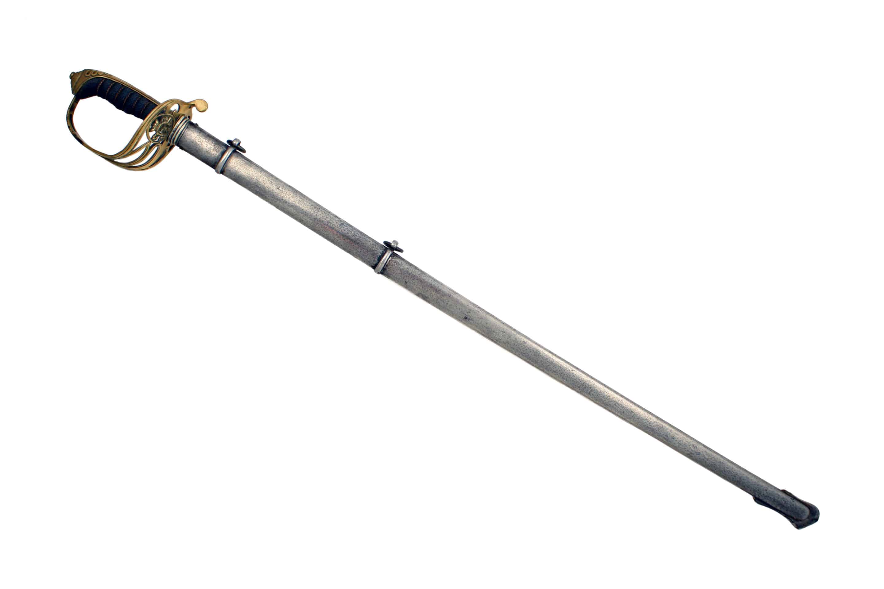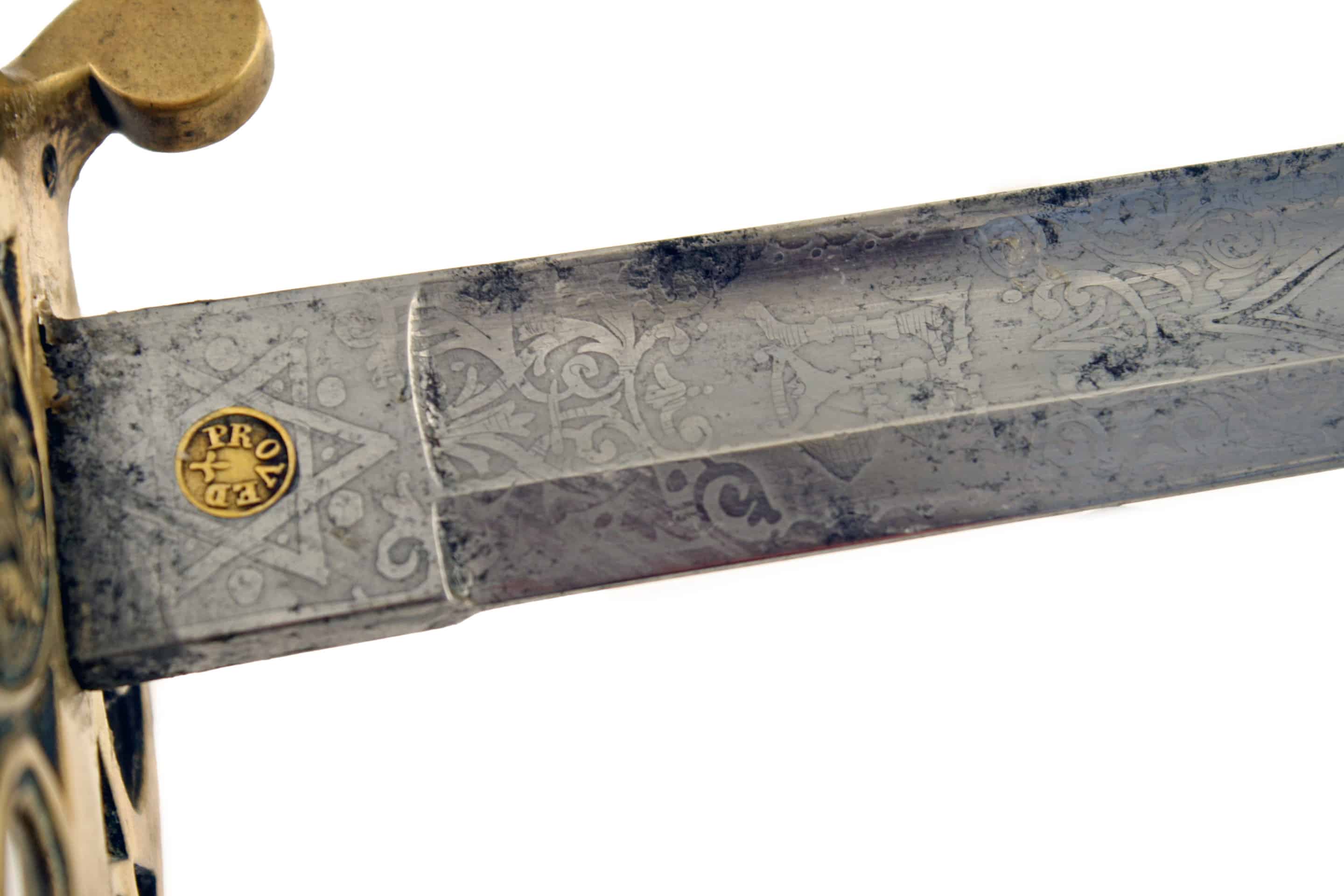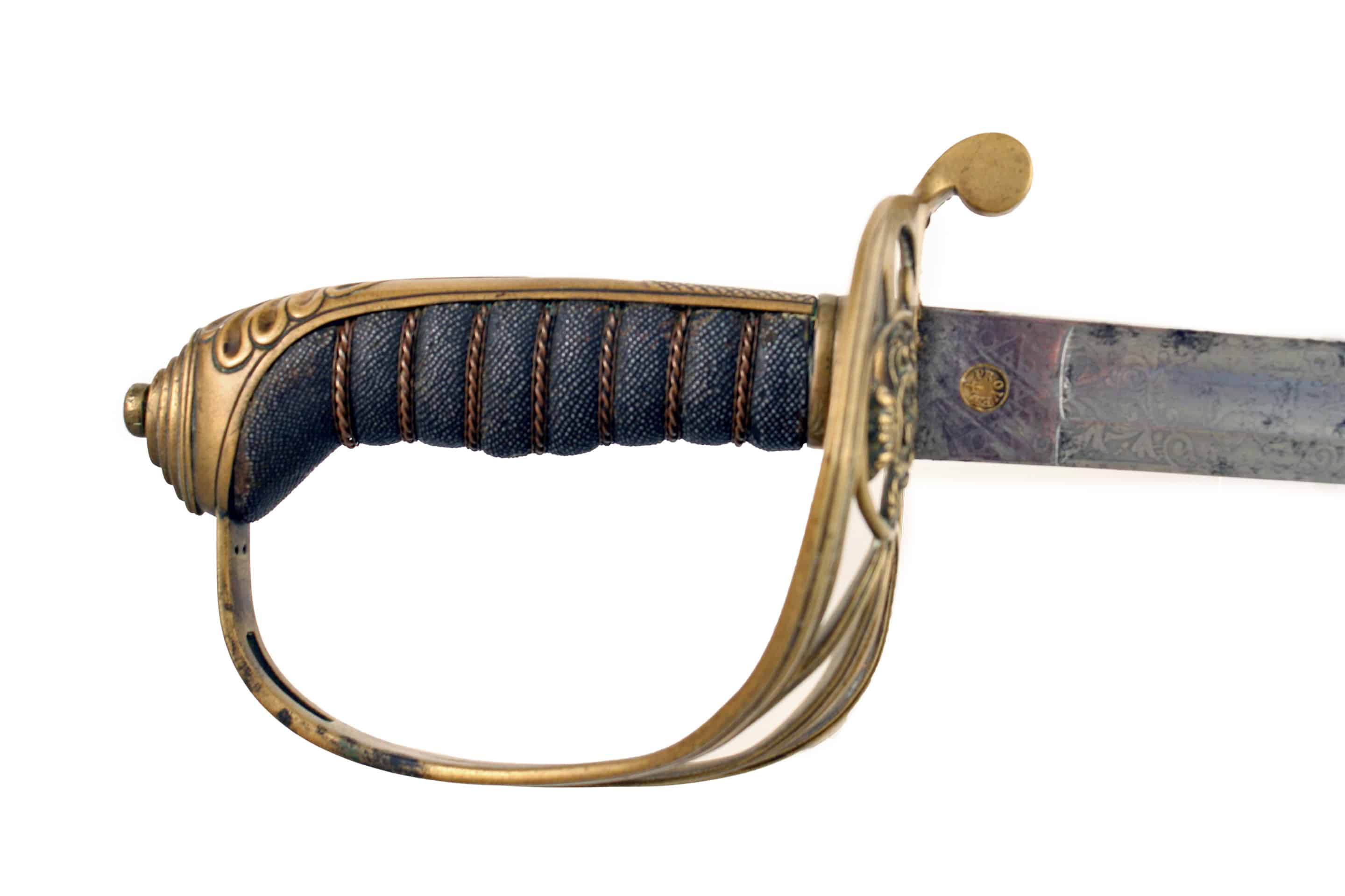 A Named 1827 Officers Sword by Hobson & Sons, London. With slightly curved single edged blade, double edged towards the point, cut with a long central fuller, etched on both sides with scrolling foliage and marked with the original owners initials, ’T.B’ and ’16TH LANCASHIRE RIFLE VOLUNTEERS’ etched with the makers name at the ricasso, ‘HOBSON & SONS LITTLE WINDMILL ST. LONDON’, regulation hilt with wire bound fish skin covered grip and in original steel scabbard with two suspension rings.