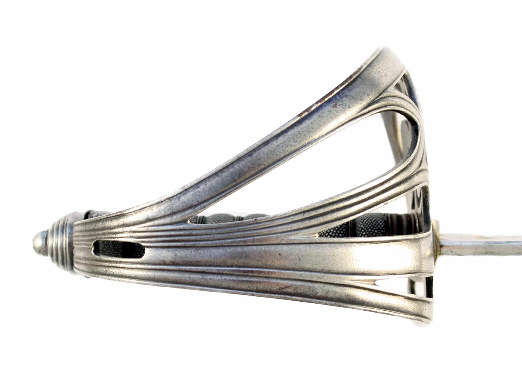 A Regimental Rifle Officers Sword of the Gloucester Rifle Volunteers. With straight single edged blade, cut with a long deep fuller along the back edge, double edged towards the point, etched with scrolling foliage a crowned royal cypher and regimental marks; ‘1st Gloucester sh Rifles’ and a coat of arms near the hilt with the motto beneath; ‘SEMPER VIRTUTE CONSTANS’ (always power constant) regulation steel gothic hilt incorporating a slung bugle horn, wire bound fish skin grip, in its steel scabbard with two suspension rings.