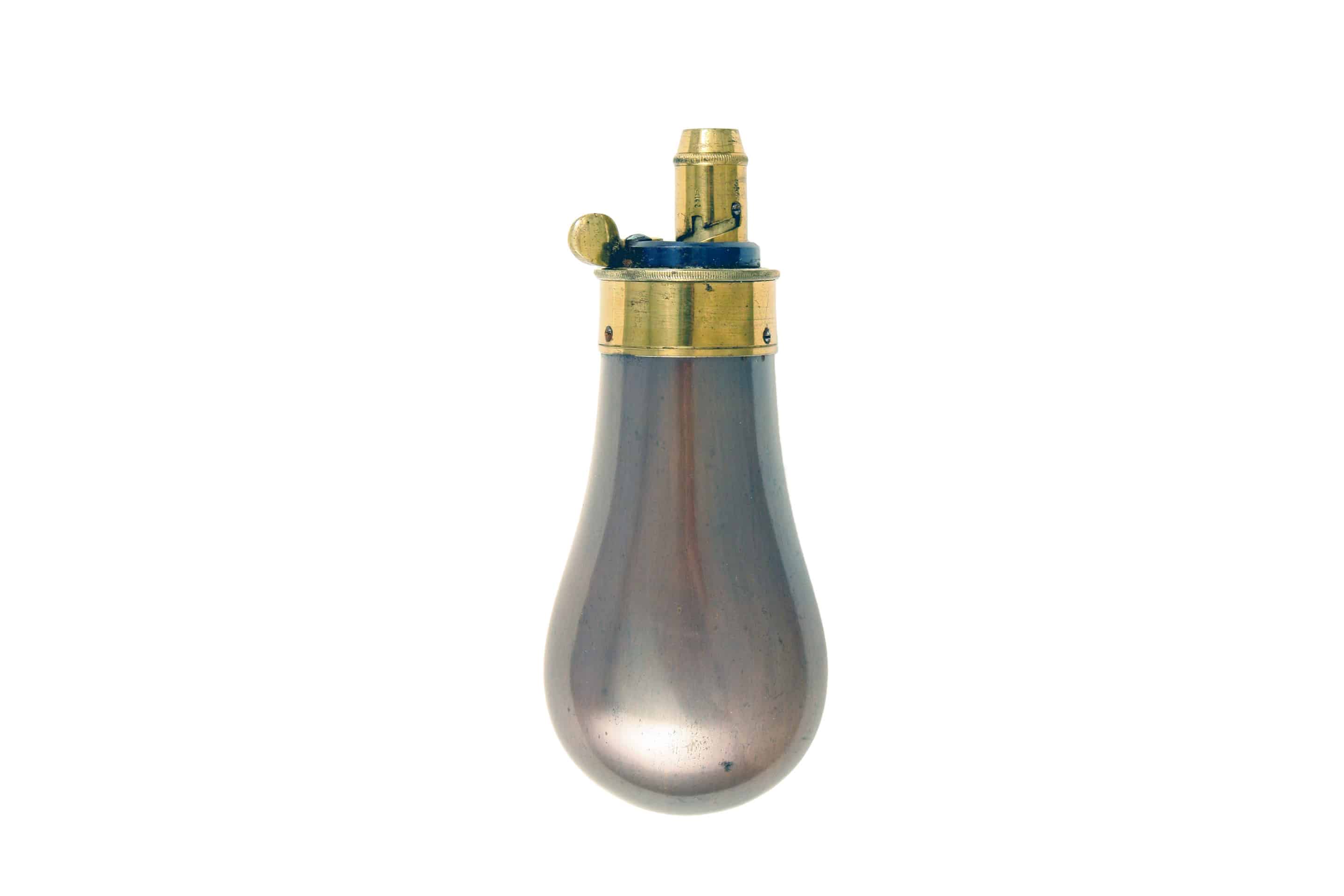 A Near Mint Pistol Flask. Of tear-drop form, retaining most original finish, blued spring.