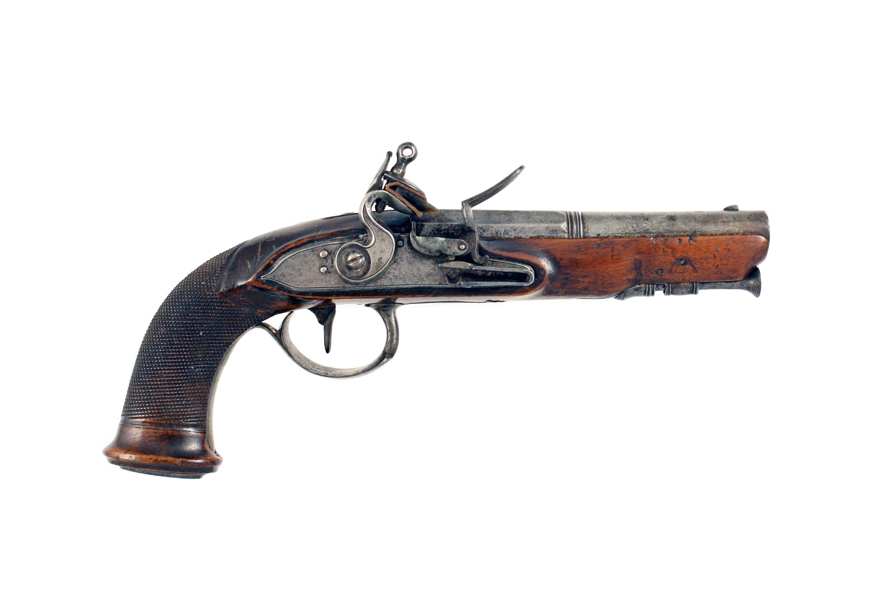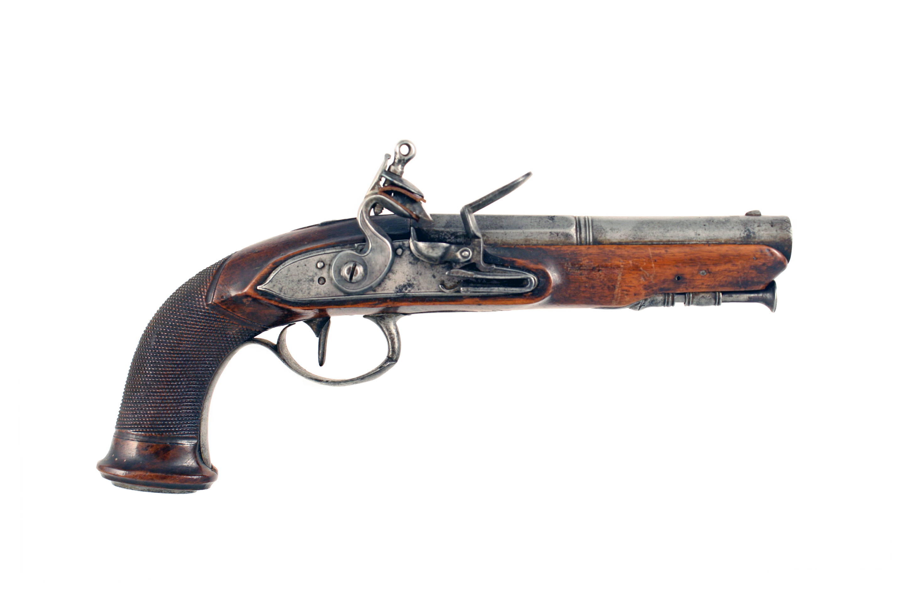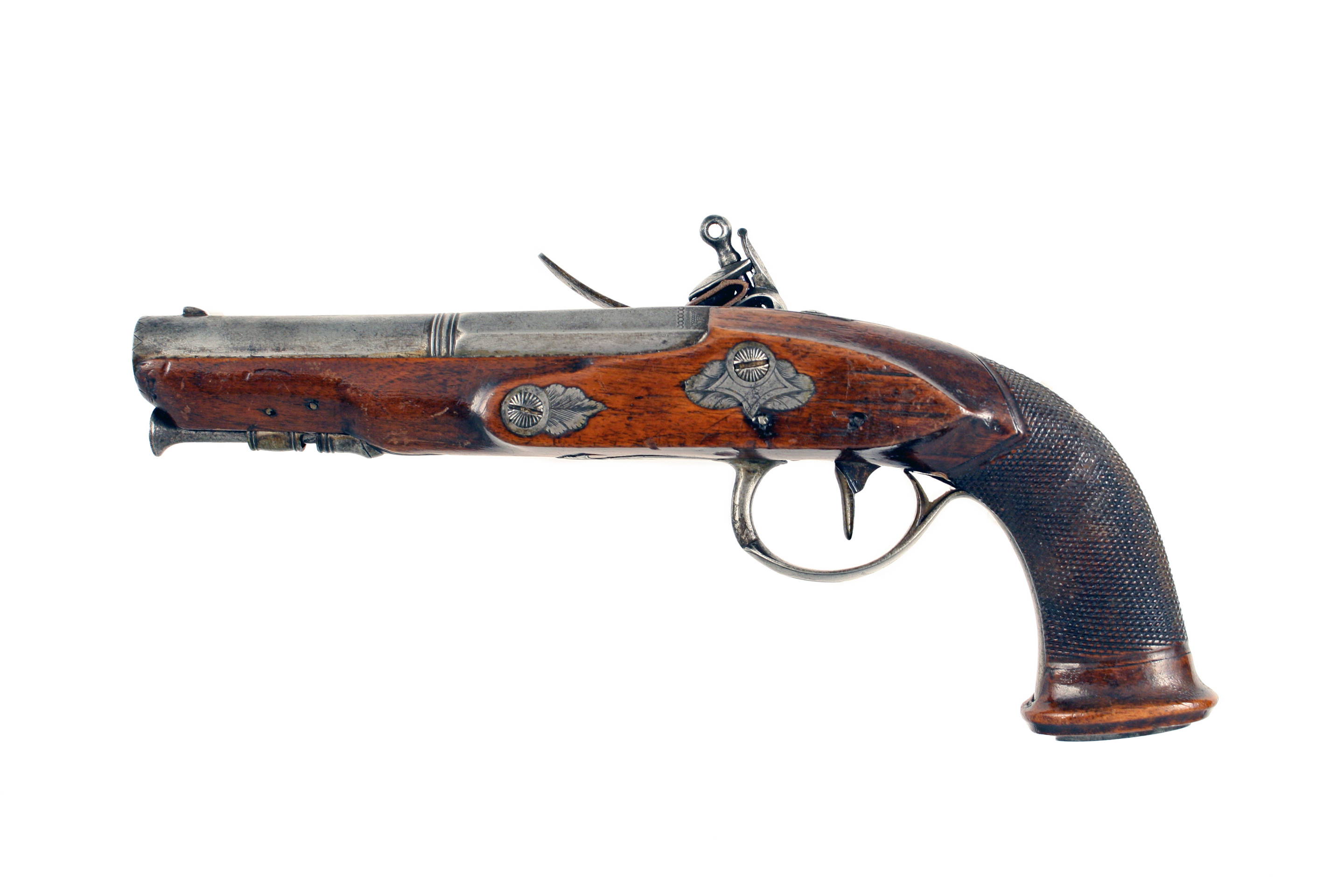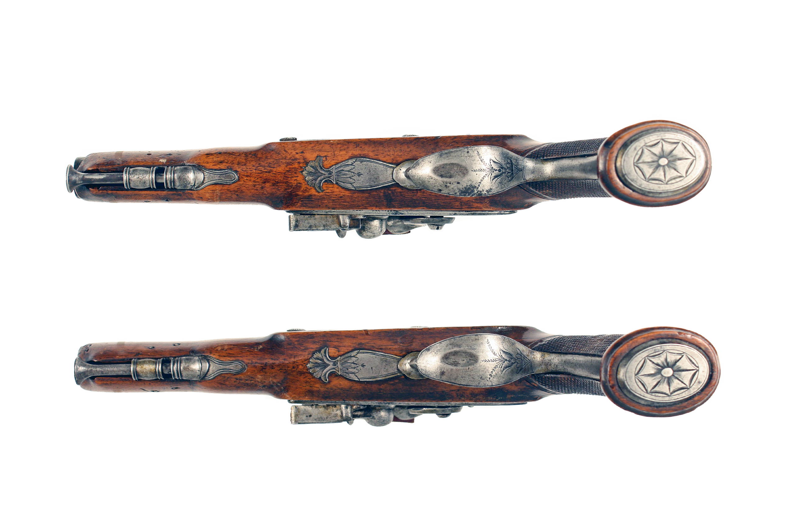 A Pair of Liege Flintlock Overcoat Pistols. With sighted octagonal to round barrels decorated with a foliate band at the breeches, stamped with Liege proofs, border engraved tangs decorated with foliage, simple line engraved flat locks, full-stocked in walnut cut with chequering at the grips and with beautifully engraved steel mounts, comprising butt caps with oval steel plates engraved with geometric designs, foliate engraved trigger guards and turned ramrod pipes, with steel ramrods.