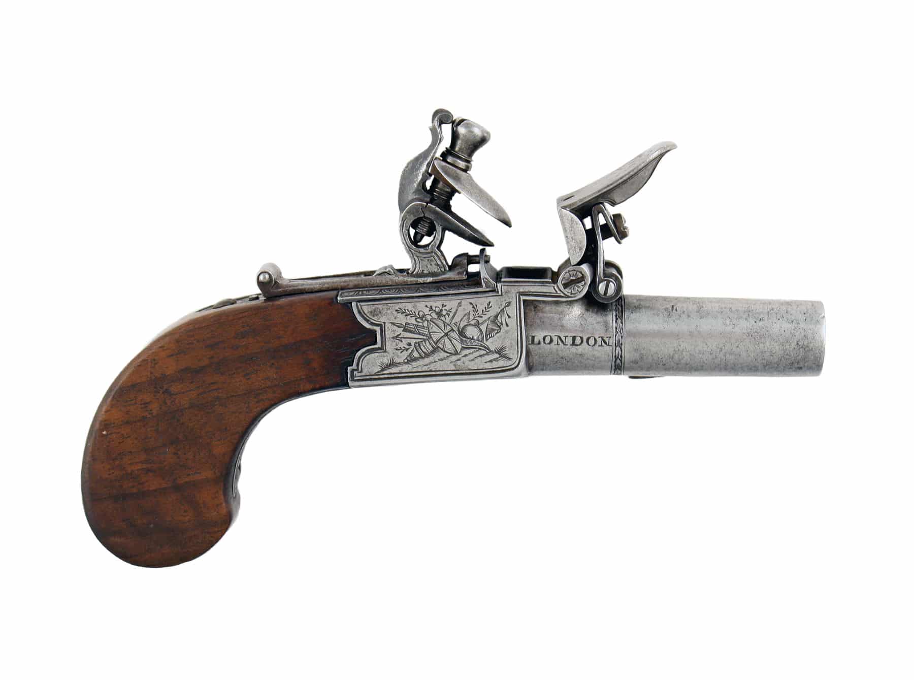 A Pair of Flintlock Pocket Pistols by D.Egg, London. With round turn-off barrels decorated with a geometric band towards the breeches, signed ‘D.EGG’ on one side and, ‘LONDON’ on the other, stamped below with London proofs. Screwless frames beautifully engraved with martial trophies and foliage, fitted above with engraved sliding safety catches that also lock the pan. With slab sided walnut grips.