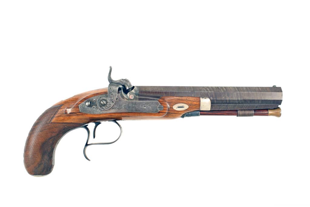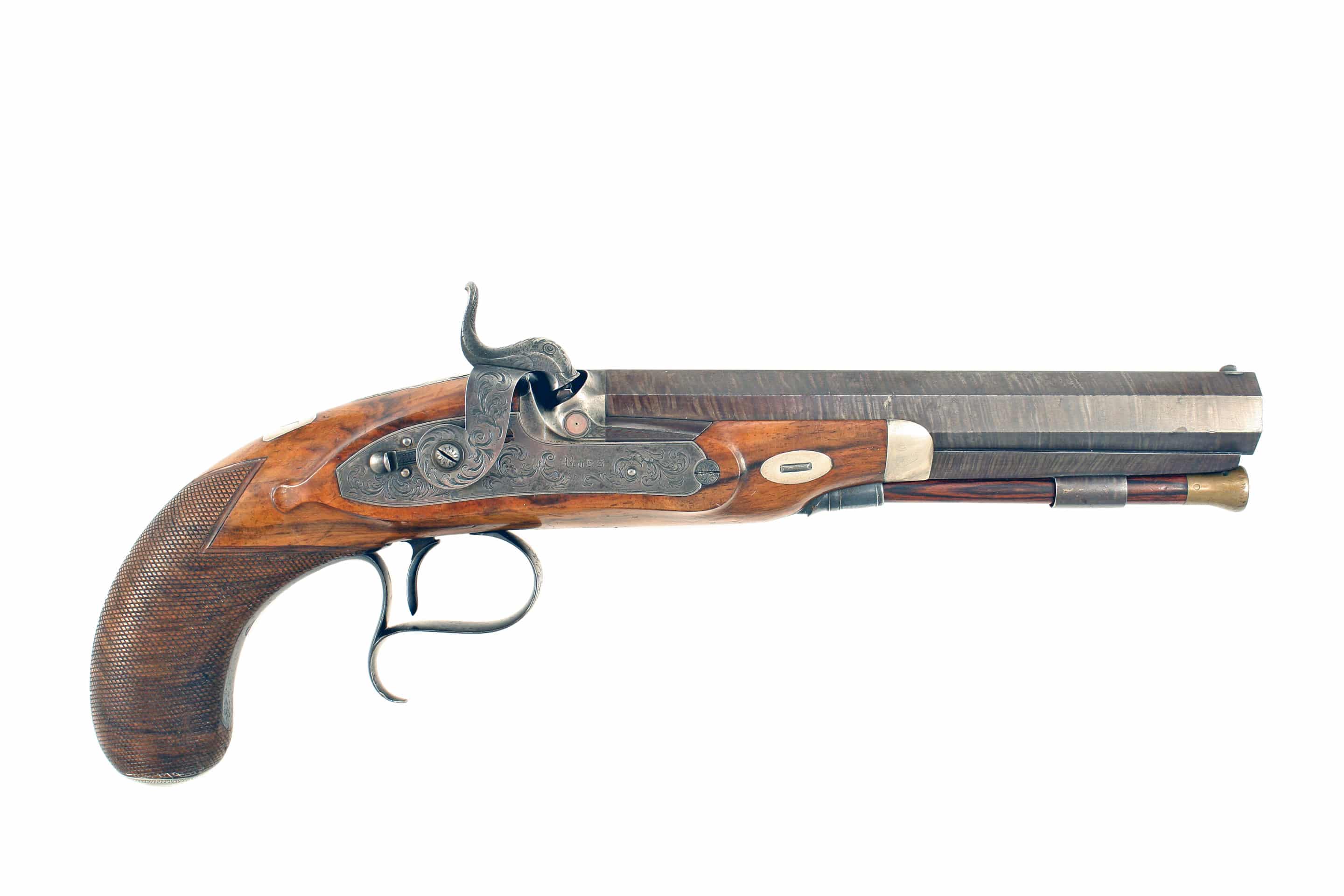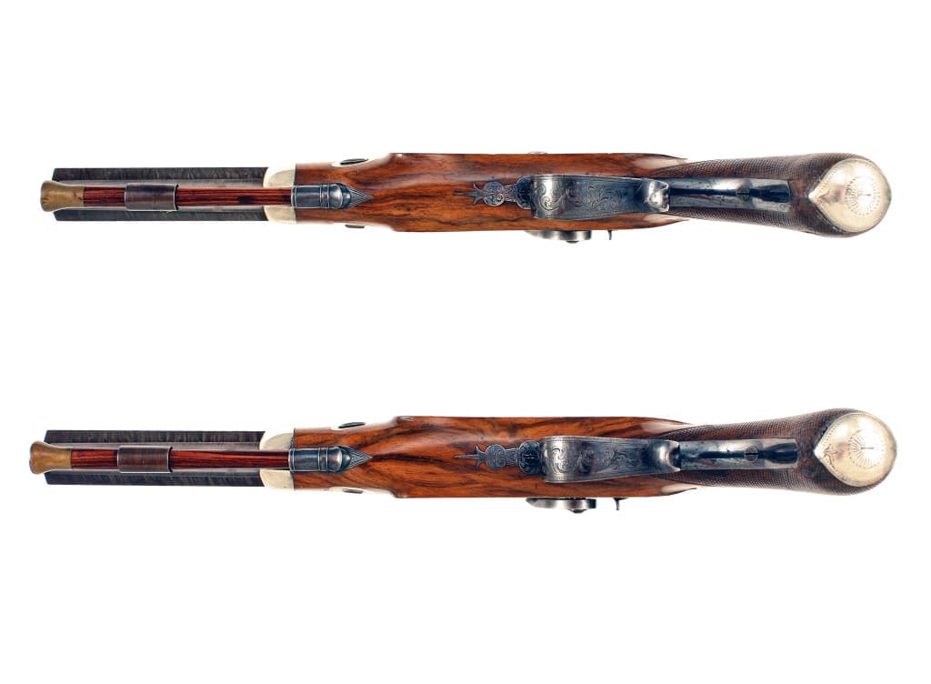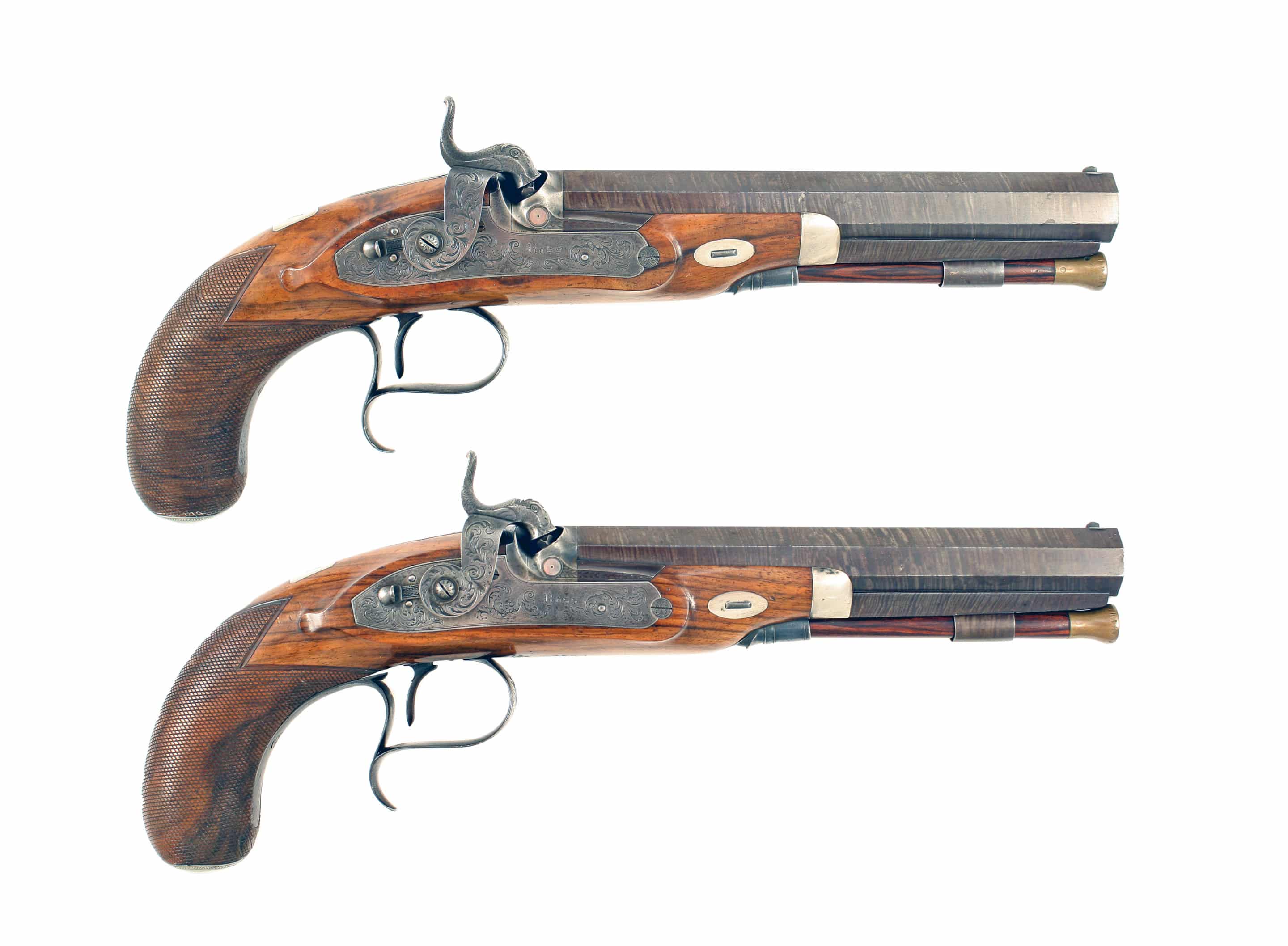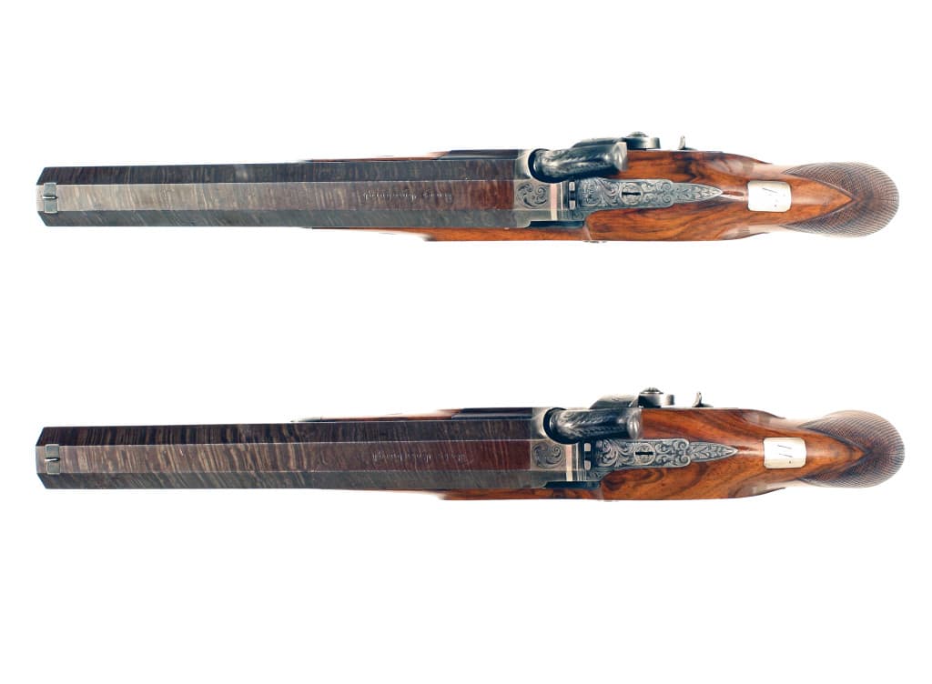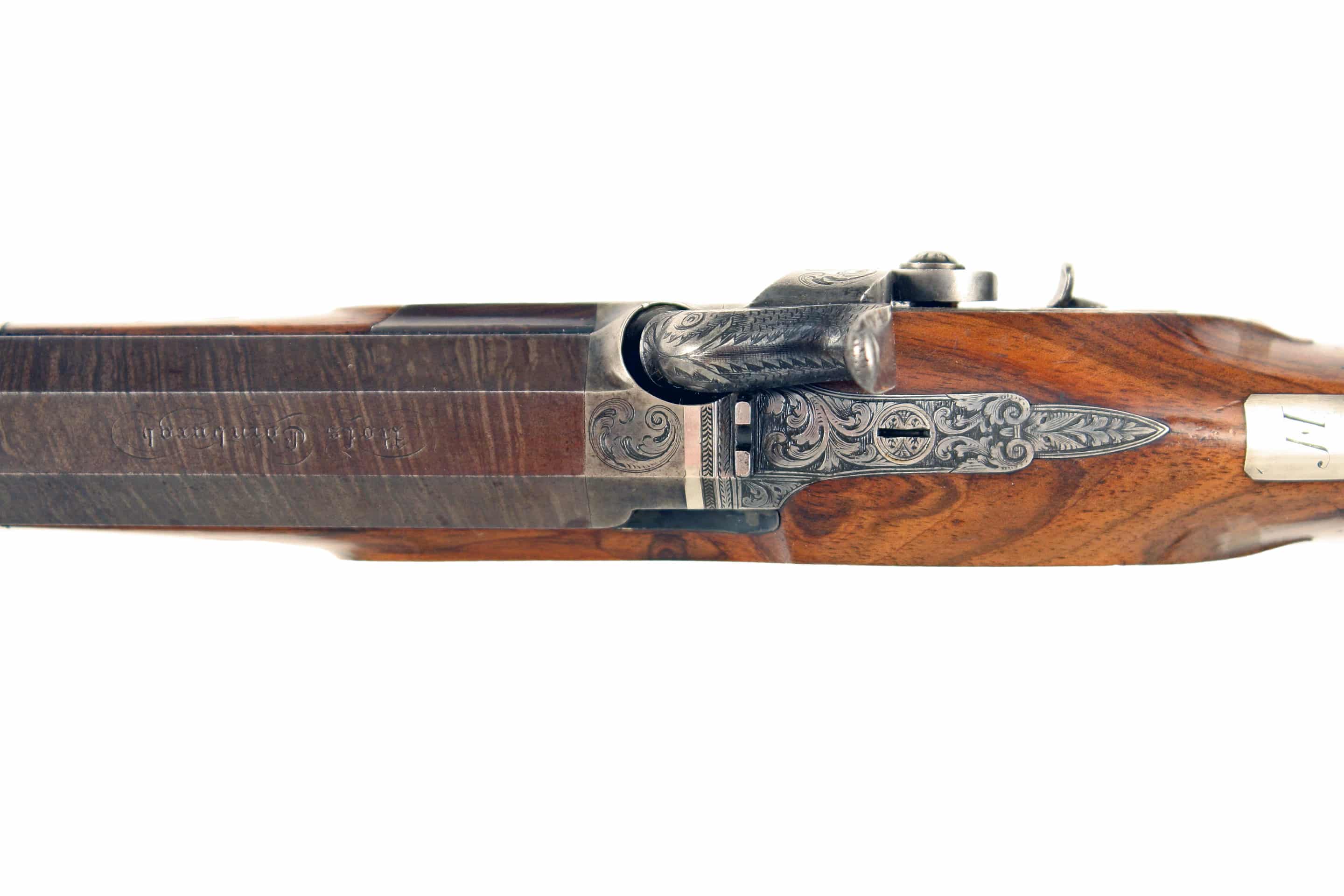 A Pair of Officers Pistols by Ross of Edinburgh. With sighted octagonal barrels, signed in Gothic script along the top-flat, case-hardened breech blocks decorated with foliate scrolls, platinum lines and with pierced platinum plugs, profusely engraved tangs fitted with standing rear-sights, border engraved locks profusely engraved with scrolling foliage and fitted with sliding safety, cocks decorated en suite, half-stocked in walnut, cut with chequering at the grip, with silver fore-end caps, engraved silver escutcheons and engraved silver butt-caps, blued steel mounts, comprising spurred trigger guards, decorated with scrolling foliage on the bows and stylised pineapple finials, turned ramrod pipes with original brass tipped ramrods.