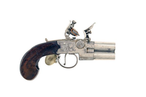 A Pair Of 88-Bore Over-And-Under Flintlock Box-Lock Tap-Action Pistols signed Spencer, London, circa 1815. With turn-off barrels numbered respectively from ‘1’ to ‘3’, signed border engraved actions each signed within a trophy of arms, engraved thumbpiece safety-catches also locking the steels, rollers, blued steel-springs (one discoloured), engraved trigger-guards, flat-sided figured walnut butts (minor bruising) each with chequered spine, silver escutcheons, and engraved flat silver pommels, with crimson ‘shoddies’, probably original, containing the barrel key, and retaining a label inscribed ‘These are loaded’, in fine condition, with only small areas of discolouration, Birmingham proof marks.