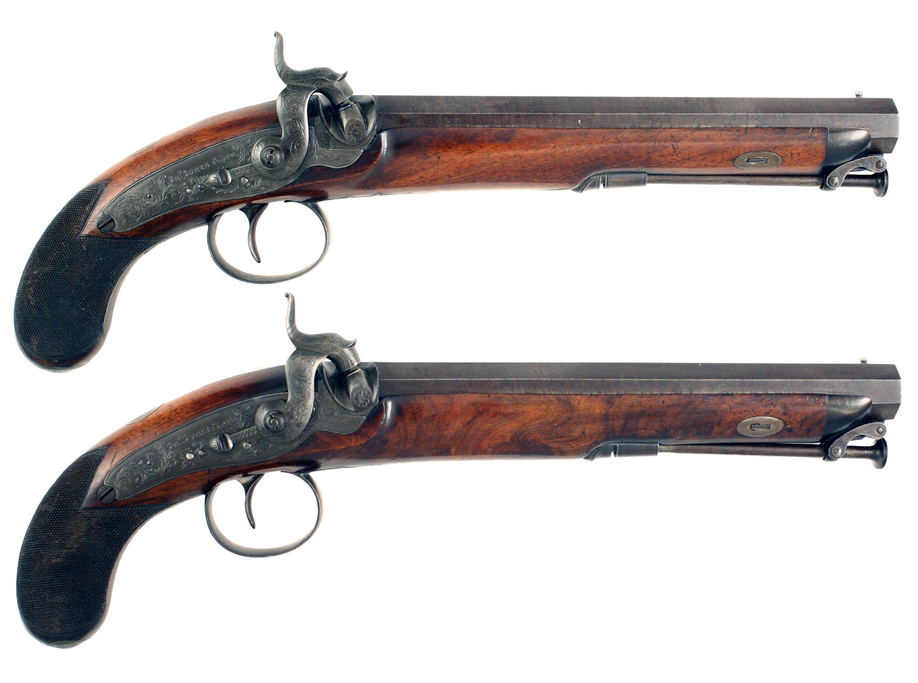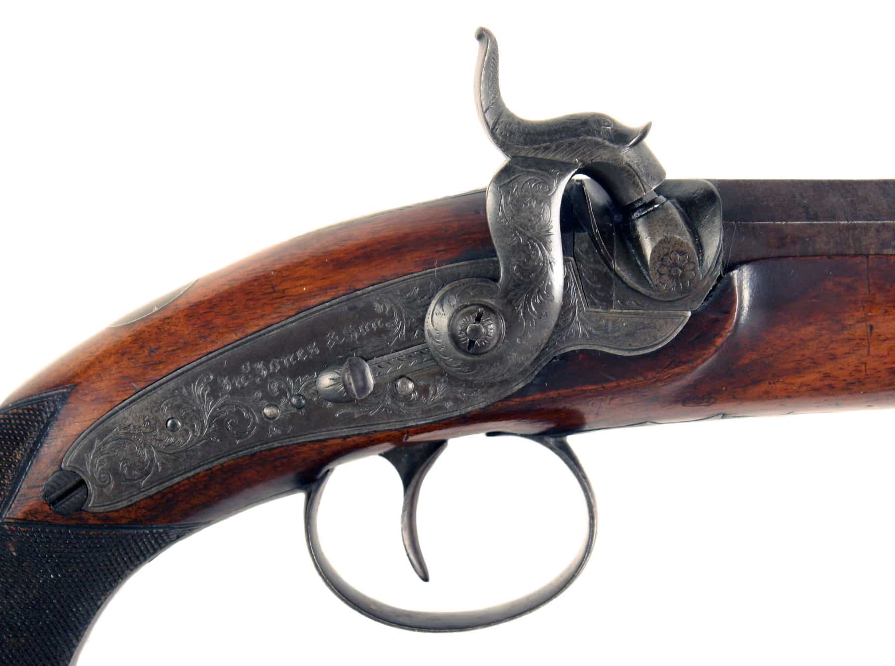 A Pair of Percussion Officers Pistols by Jones & Son of London. With sighted octagonal barrels signed along the top-flats and decorated with a gold band at the breeches, foliate engraved tangs, signed back-action locks decorated with scrolling foliage and fitted with sliding safety catches that lock at half-cock, cocks decorated en-suite, full stocked in walnut, cut with a small band of crisp chequering at the grip, decorated with small silver butt caps engraved with a sun burst and with silver barrel bolt escutcheons, steel furniture throughout, comprising foliate engraved trigger guards with stylised pineapple finials, ramrod pipes and stirrup ramrods, the pistols in beautiful ‘sleepy’ condition, the grips are very fine and the barrels retain traces of their original finish.
