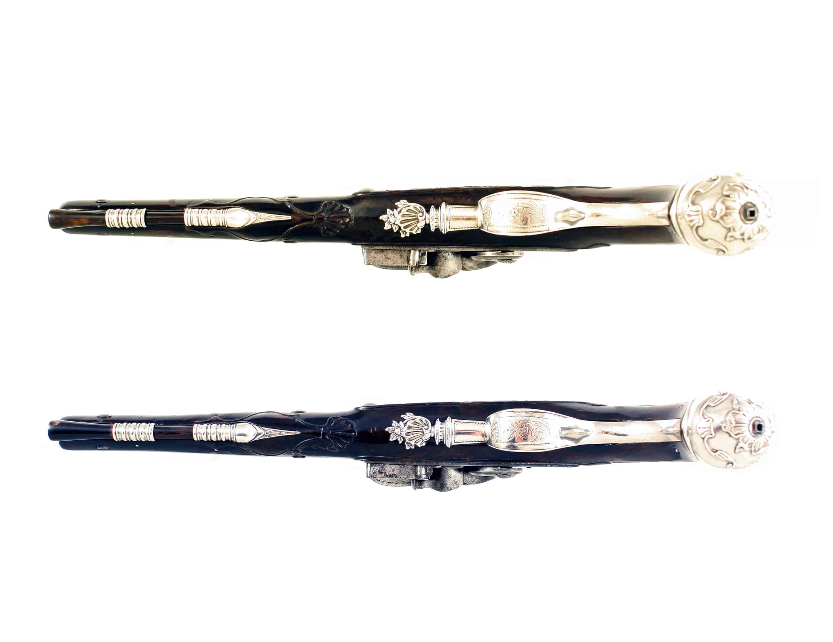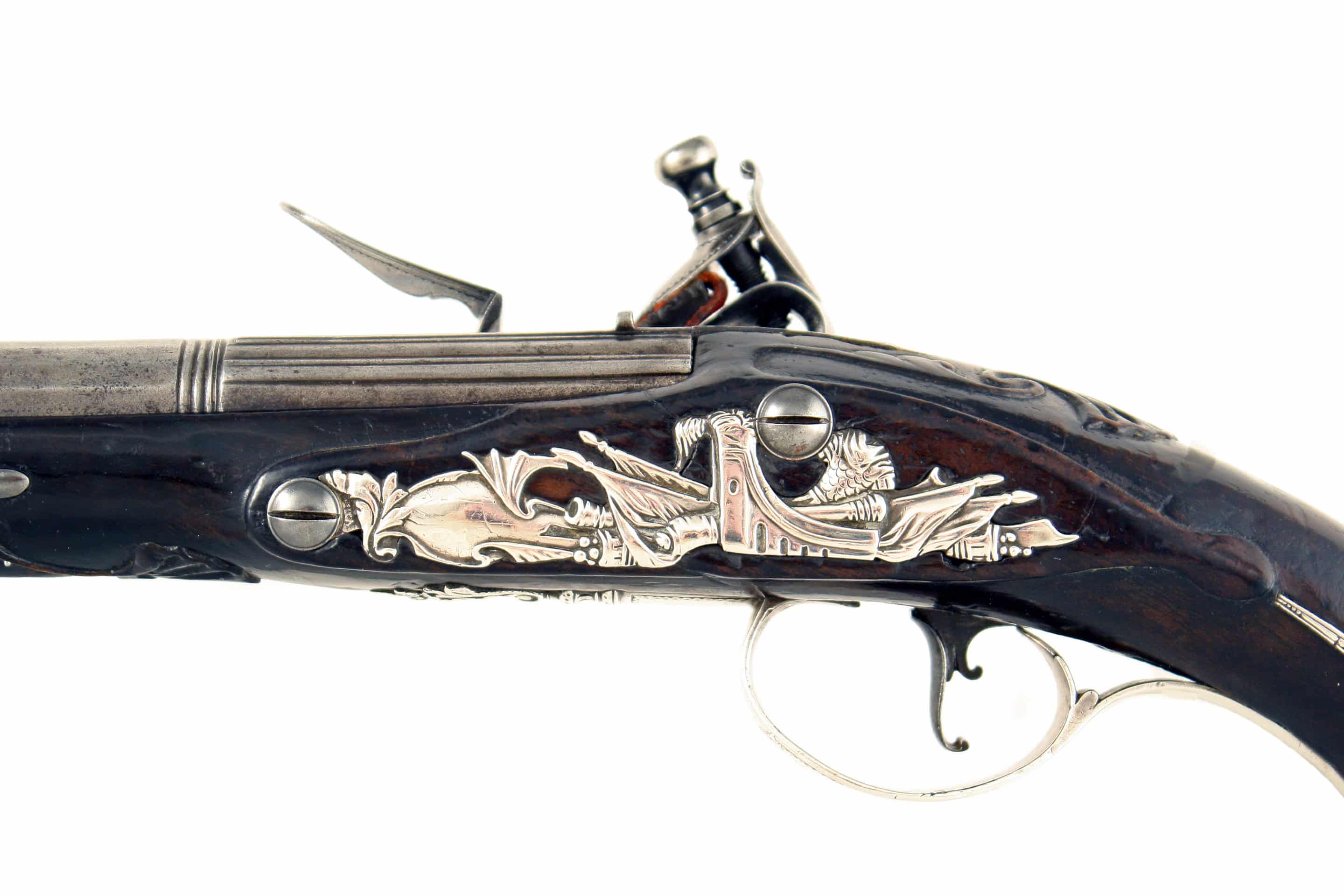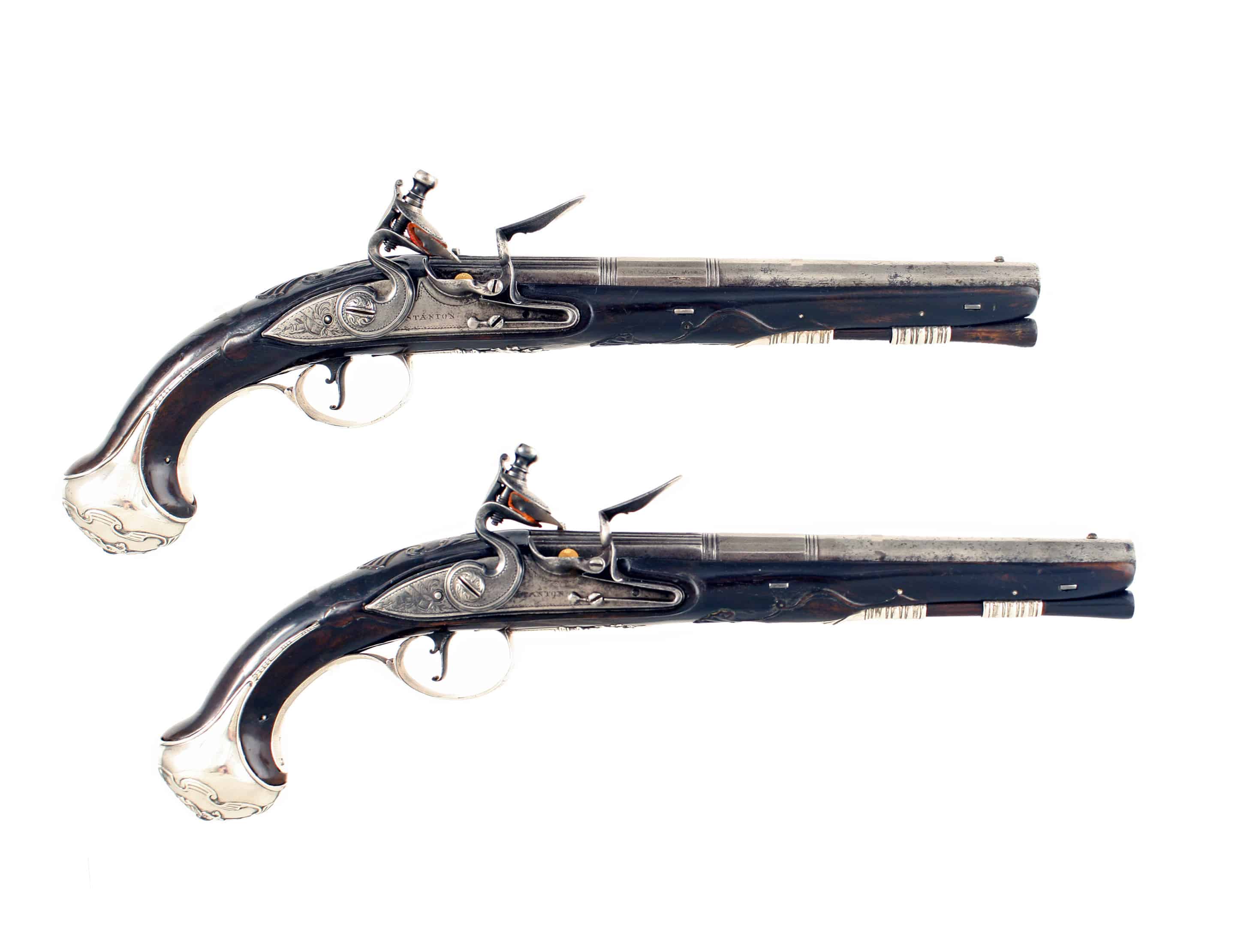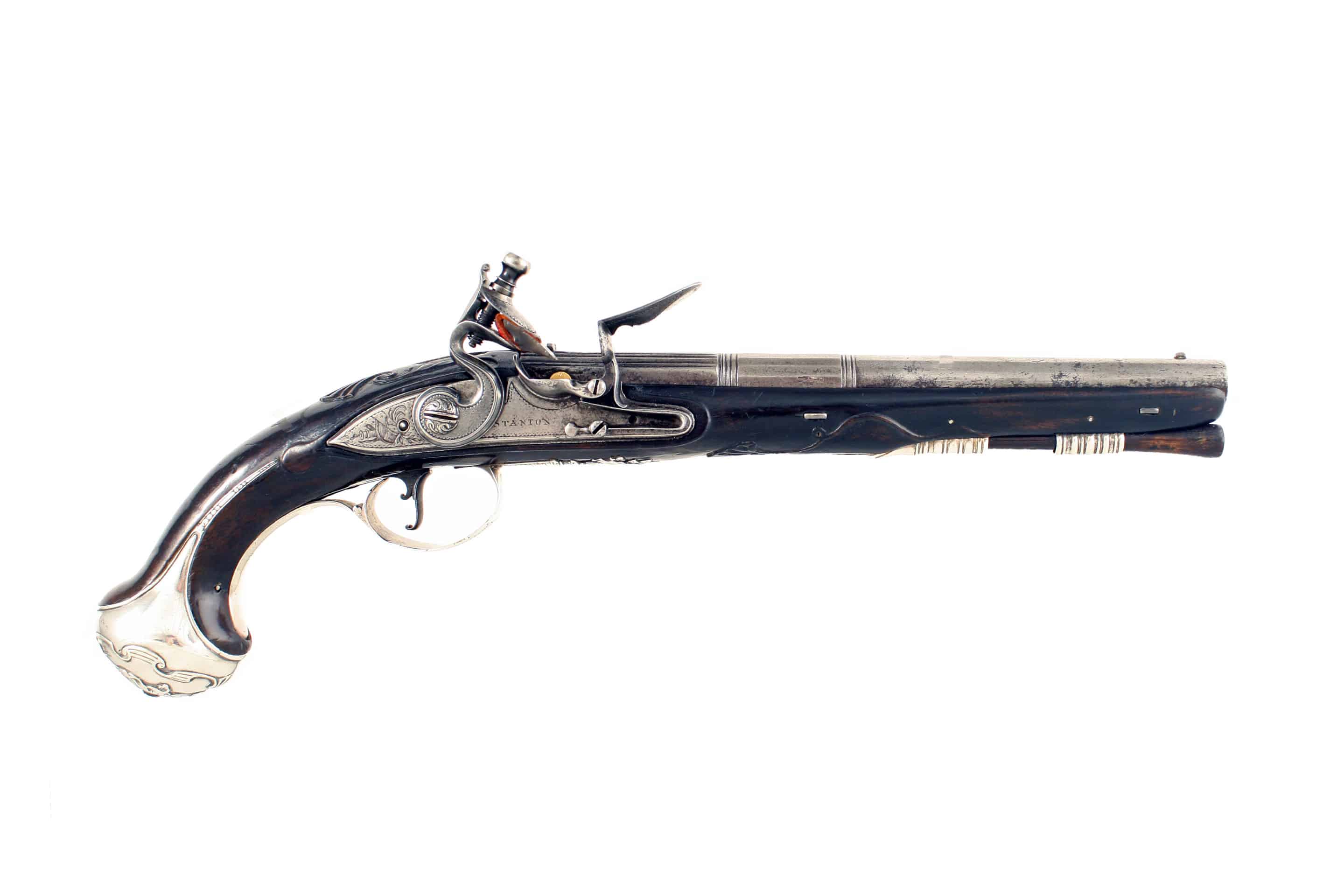 A Pair of 40-Bore Flintlock Silver Mounted Holster Pistols by Stanton of London, Silver Hallmarks for 1757. With tapering three-stage sighted barrels each in the Italian fashion with polygonal mid-section between turned girdles, octagonal breech cut with pairs of lines along the upper side-flats, gold-lined touch-holes, border engraved tangs decorated with scallop shells and foliage, border engraved flat bevelled locks each signed in capitals and decorated with a martial trophy on the tail, gold-lined pans, border engraved cocks (probably replaced), moulded figured full stocks (fore-ends partly replaced) each carved in low relief with a scallop shell behind the rear ramrod-pipe and barrel tang, cast and chased mounts comprising pierced trophy-of-arms side-plates, pommels each with engraved spurs and with a flower-head within a border of strapwork centred on the retaining screw with square recess in the head, trigger-guards each with scallop shell and flower-head finial and decorated with scallop shells and flower-heads on the border engraved bow, baluster ramrod-pipes, and horn-tipped ramrods.