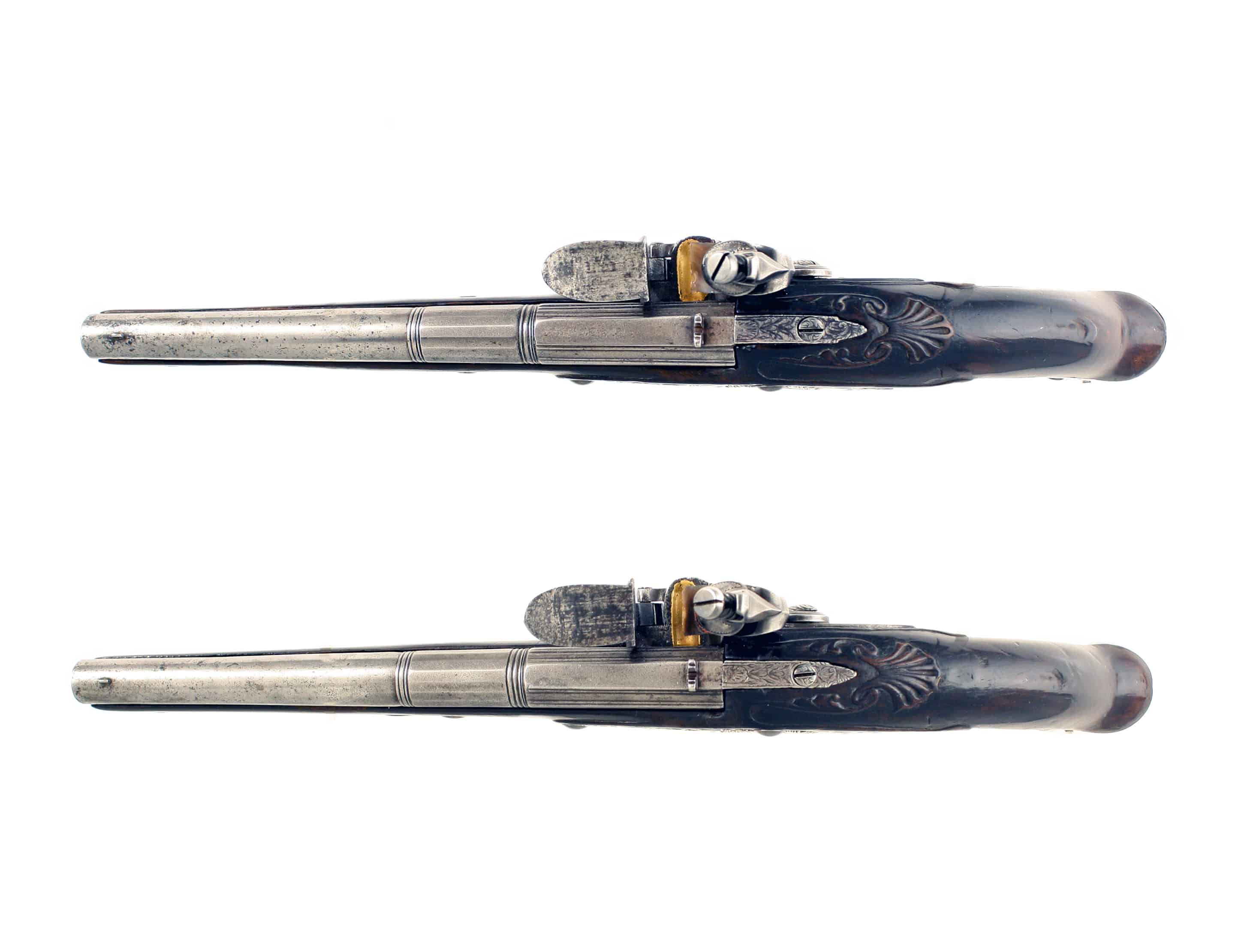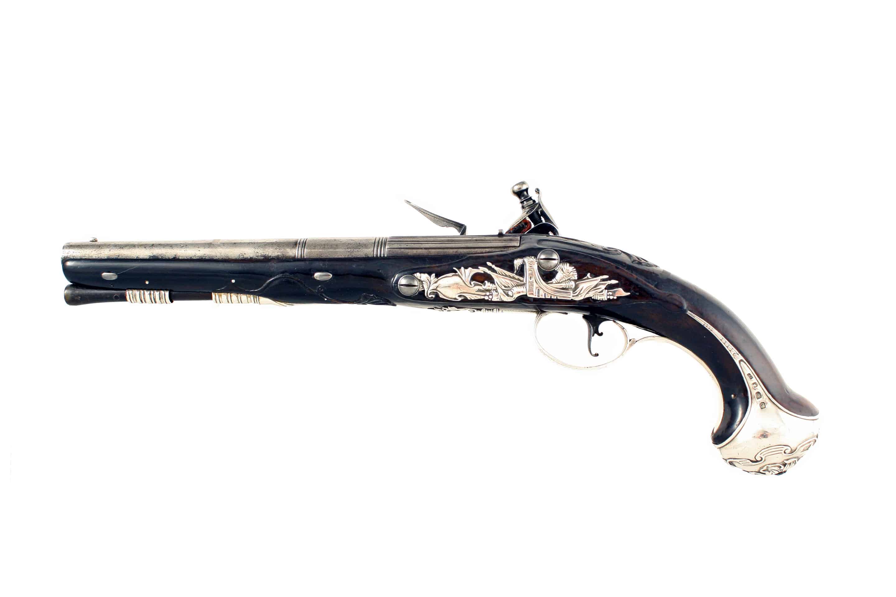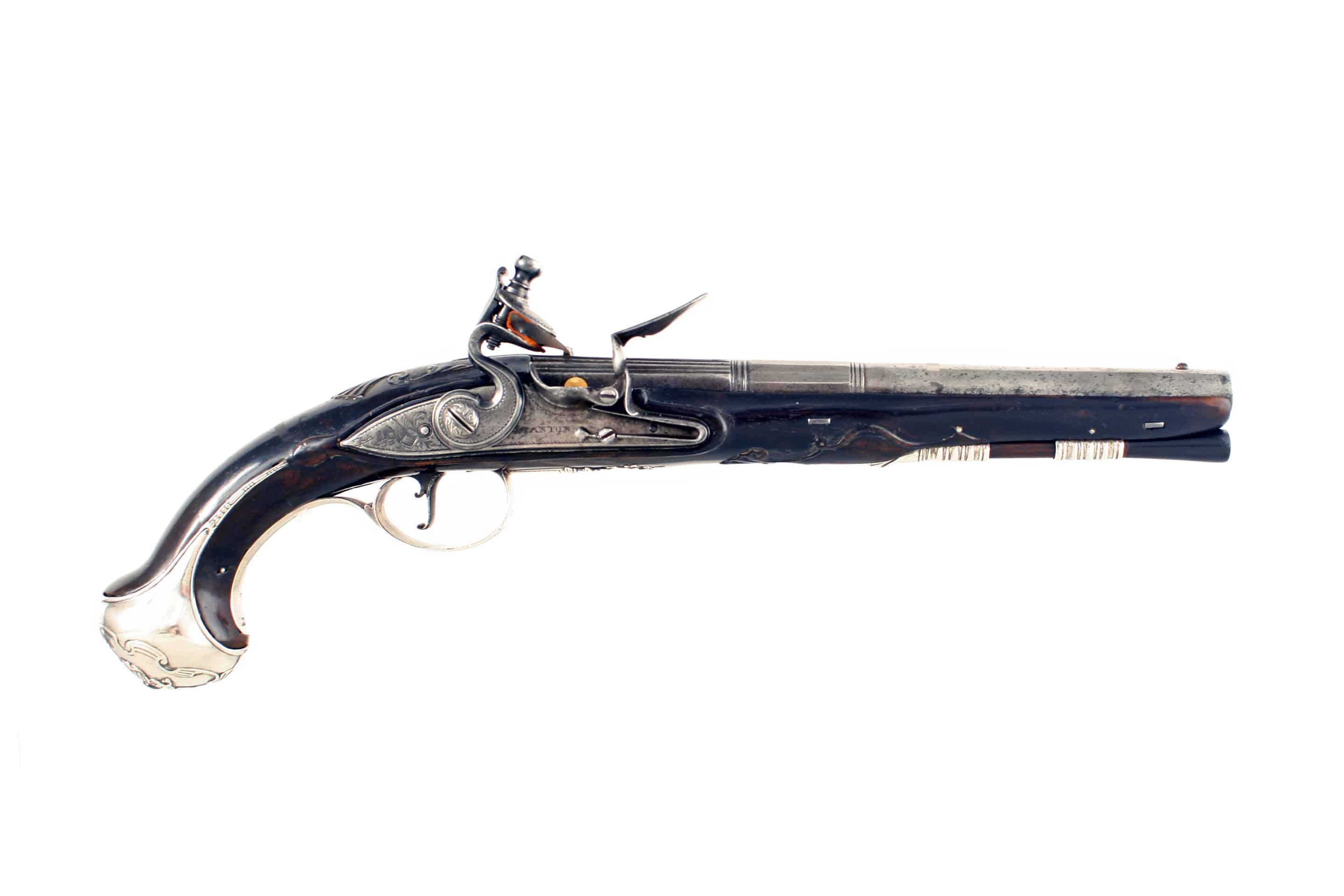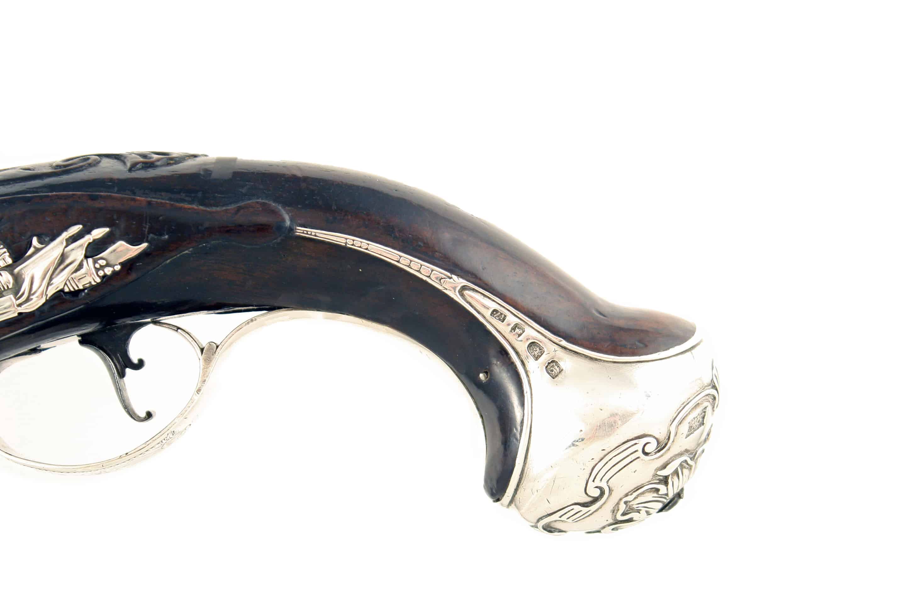 A Pair of 40-Bore Flintlock Silver Mounted Holster Pistols by Stanton of London, Silver Hallmarks for 1757. With tapering three-stage sighted barrels each in the Italian fashion with polygonal mid-section between turned girdles, octagonal breech cut with pairs of lines along the upper side-flats, gold-lined touch-holes, border engraved tangs decorated with scallop shells and foliage, border engraved flat bevelled locks each signed in capitals and decorated with a martial trophy on the tail, gold-lined pans, border engraved cocks (probably replaced), moulded figured full stocks (fore-ends partly replaced) each carved in low relief with a scallop shell behind the rear ramrod-pipe and barrel tang, cast and chased mounts comprising pierced trophy-of-arms side-plates, pommels each with engraved spurs and with a flower-head within a border of strapwork centred on the retaining screw with square recess in the head, trigger-guards each with scallop shell and flower-head finial and decorated with scallop shells and flower-heads on the border engraved bow, baluster ramrod-pipes, and horn-tipped ramrods.