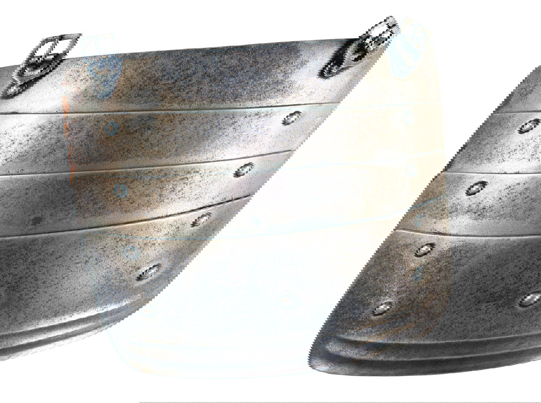 A Pair of Tassets From A Pikemans Armour, 16th Century. Of steel, each of curved rectangular form, each comprising four lames, with raised border decoration at the base, both retaining original buckles.