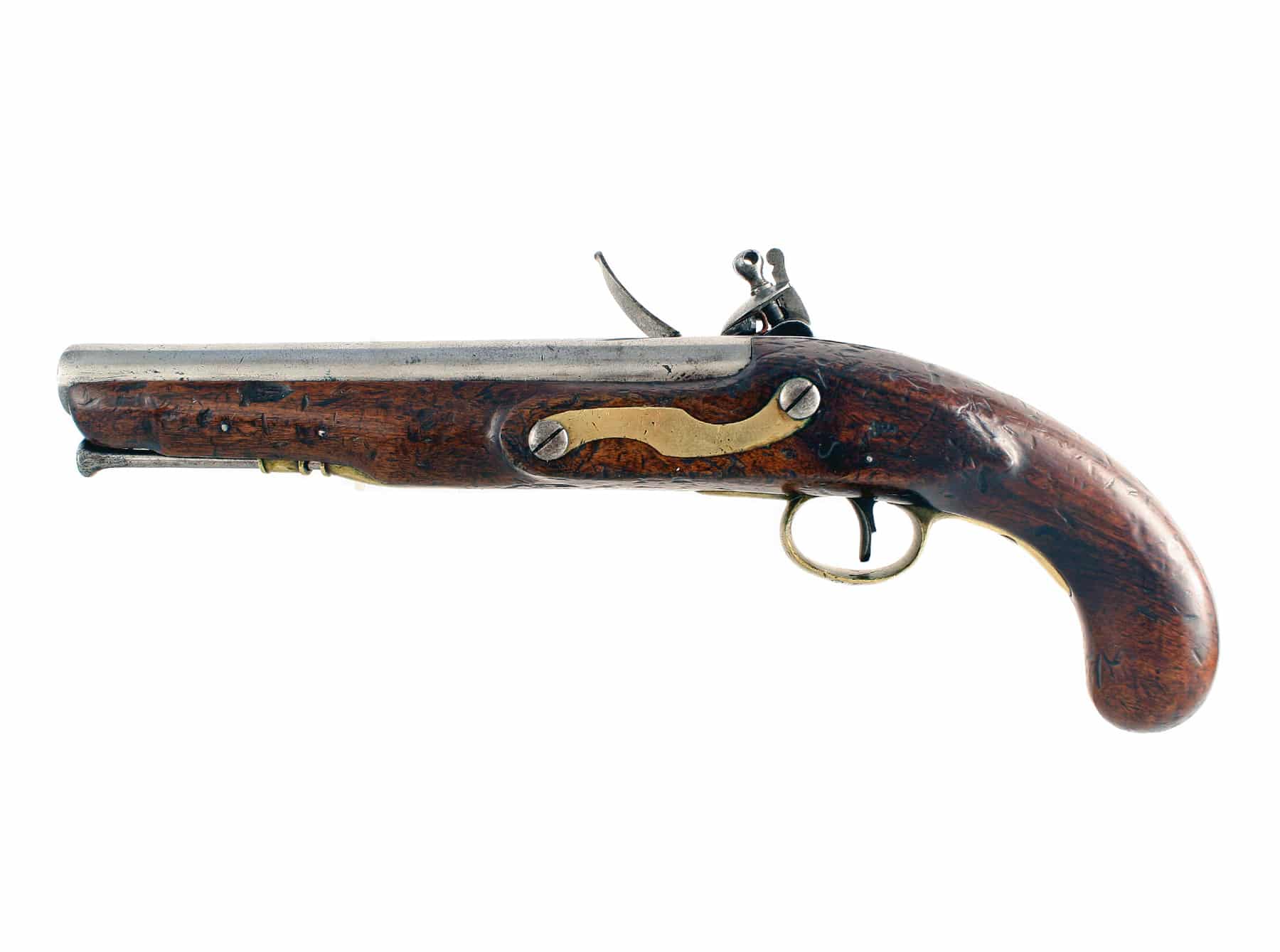 A Pattern 1796 Heavy Dragoon Pistol, Marked to 4th Dragoon Guards. With round barrel marked with Tower proofs, rounded lock plate with double border line engraving with crown over GR in the centre, full-stocked in walnut with brass furniture comprising side-plate, butt cap, trigger guard and ramrod pipes, steel ramrod. Trigger guard engraved ‘4=D=G DS’ ‘I/25’.