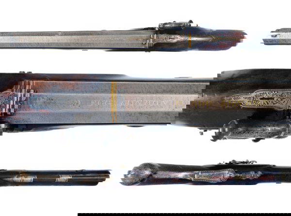 A Flintlock Duelling Pistol by D.Egg, London. With sighted octagonal barrel, signed in gold, ‘D.EGG LONDON’ on the top flat and fitted with rear-sight towards the breech, double gold line, foliate engraved tang and screw, signed bevelled lock with sliding safety, the tail of the lock decorated with stands of arms, full-stocked in walnut and cut with characteristic chequering at the grip, horn fore-end, engraved steel mounts comprising elaborately engraved butt cap, trigger guard with stands of arms on the bow, turned ramrod-rod pipes, with horn-tipped ramrod. In completely uncleaned condition, barrel retaining traces of original browning. (Small repairs to the woodwork by the lock and muzzle).