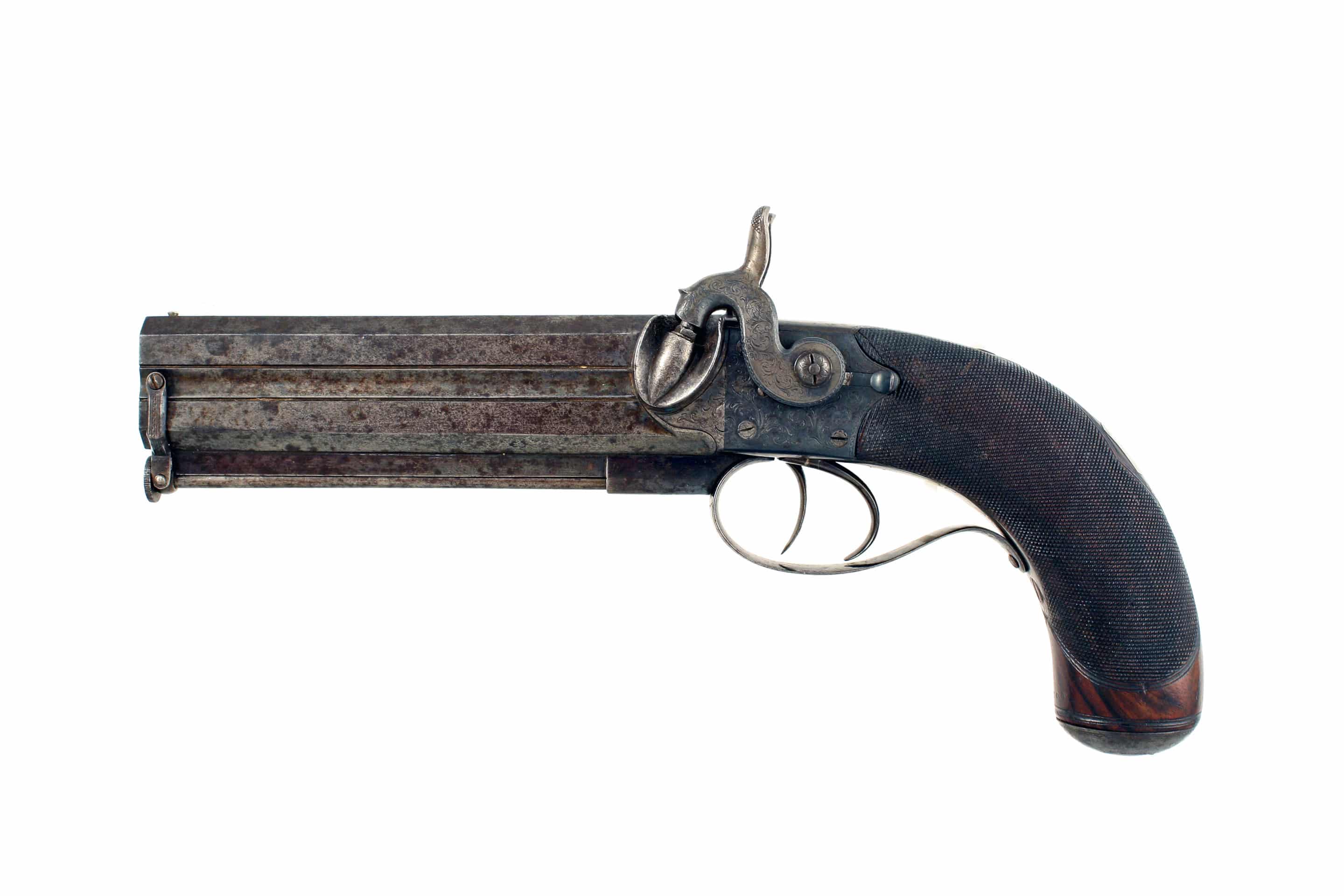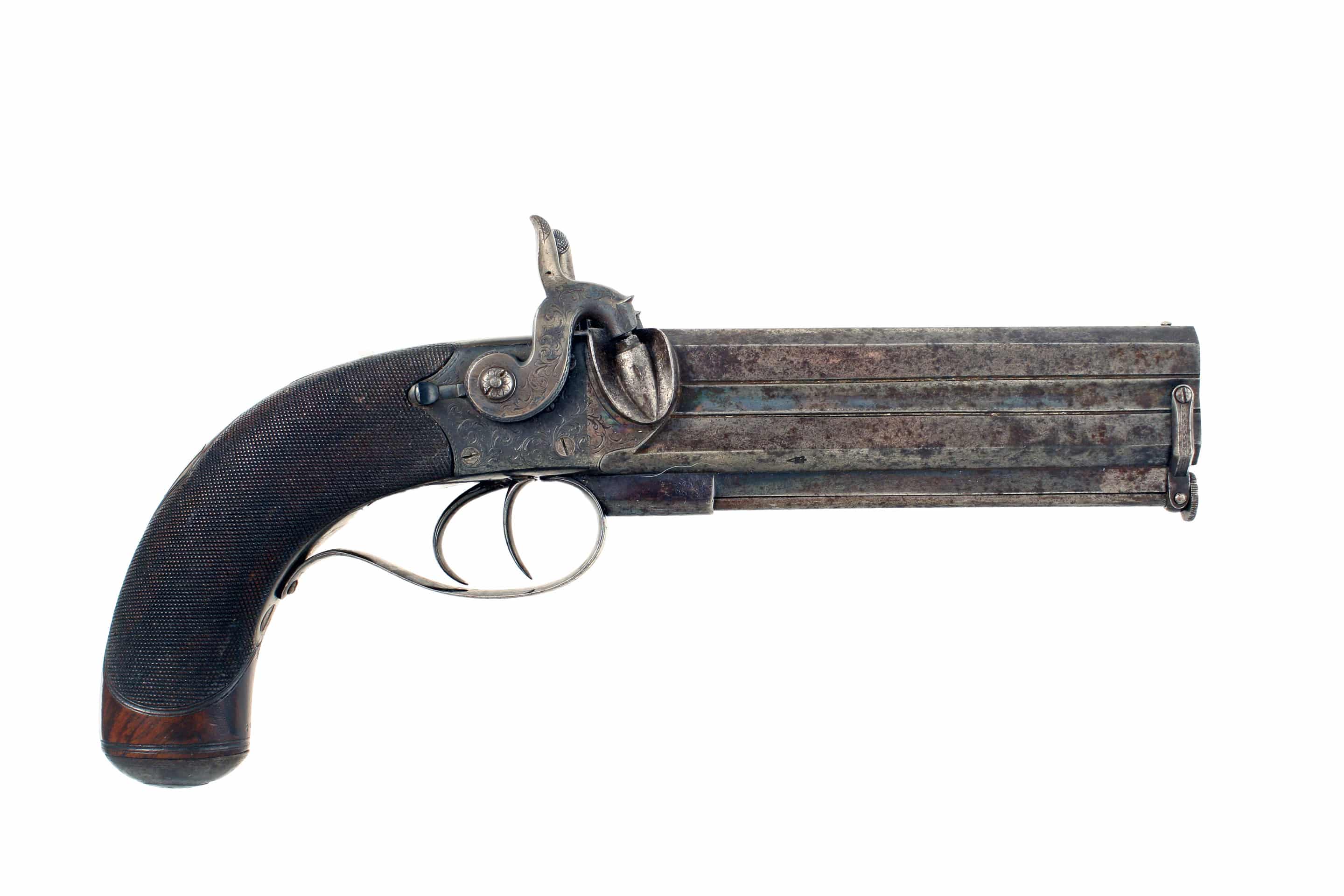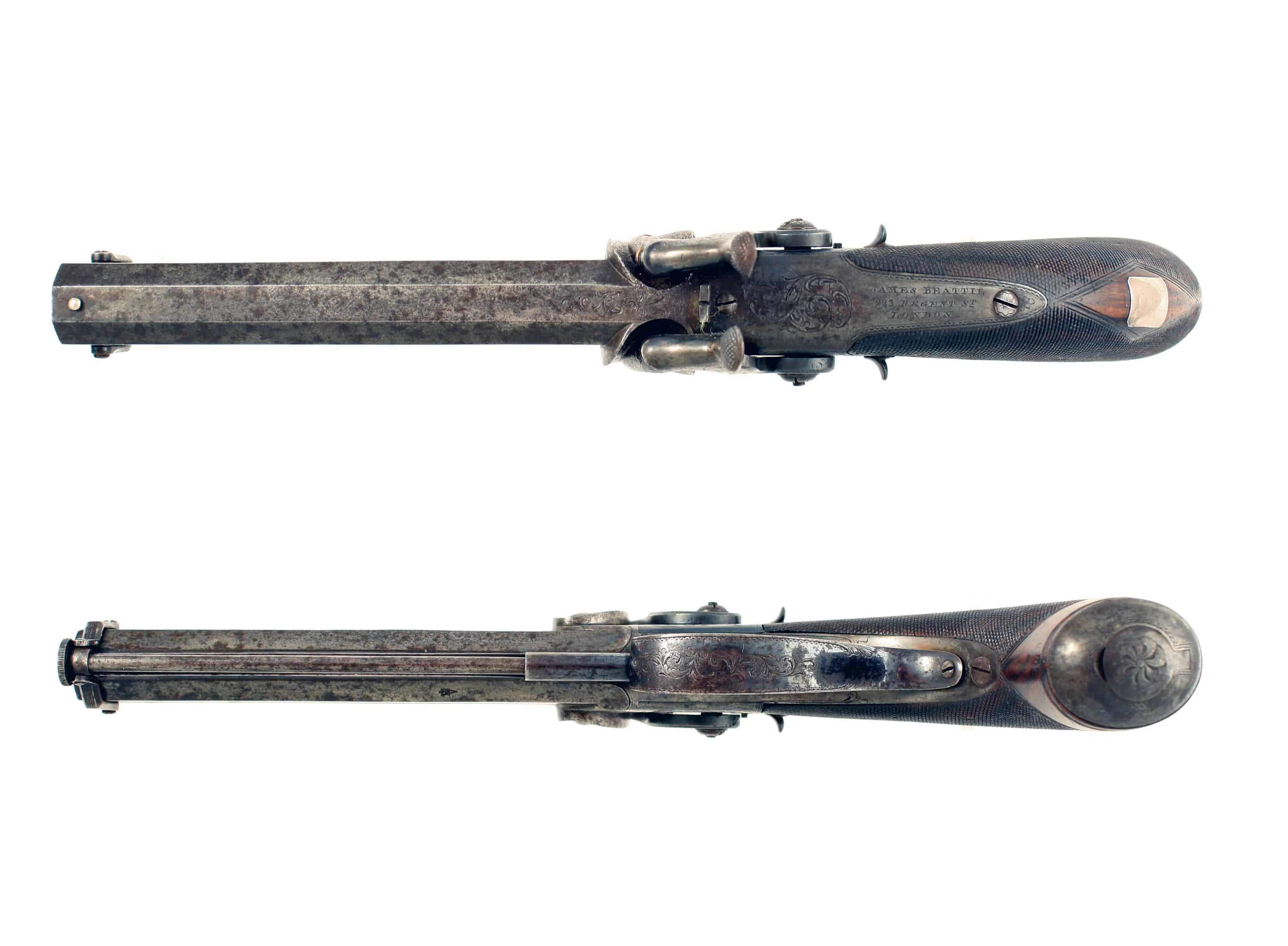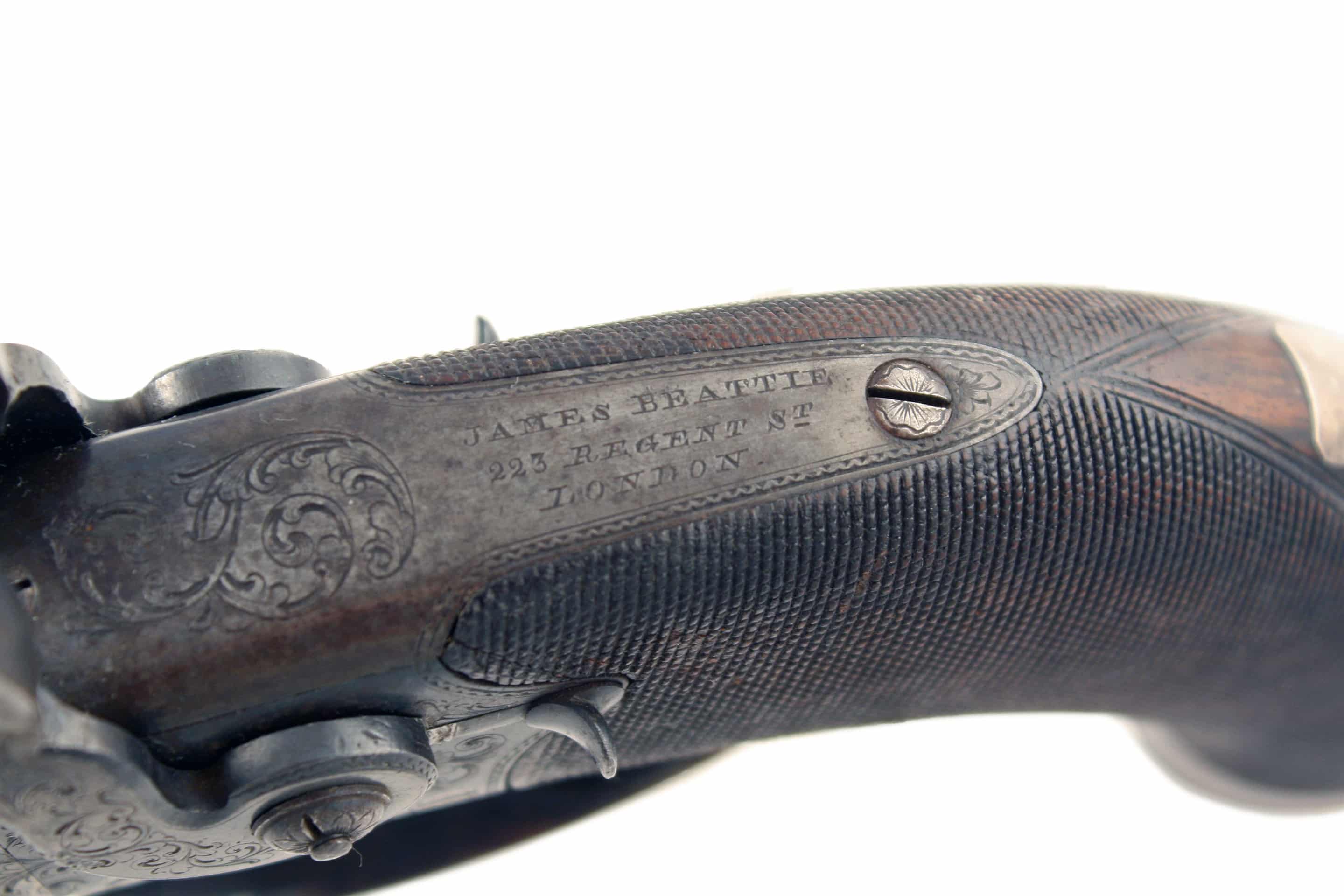 A Percussion Howdah Pistol by James Beattie, London. With sighted barrels, fitted with a captive ramrod beneath and stamped with London proofs, profusely engraved box-lock action, signed along the tang, ‘JAMES BEATTIE 223 REGENT STREET LONDON’ foliate engraved cocks, (old repair to spur of right trigger) fitted with sliding safety catches, foliate engraved trigger guard retaining some original finish, with finely chequered rounded butt, with vacant rectangular escutcheon, case-hardened ovoid butt plate with hinged butt-trap cover. In nice condition retaining traces of original colour