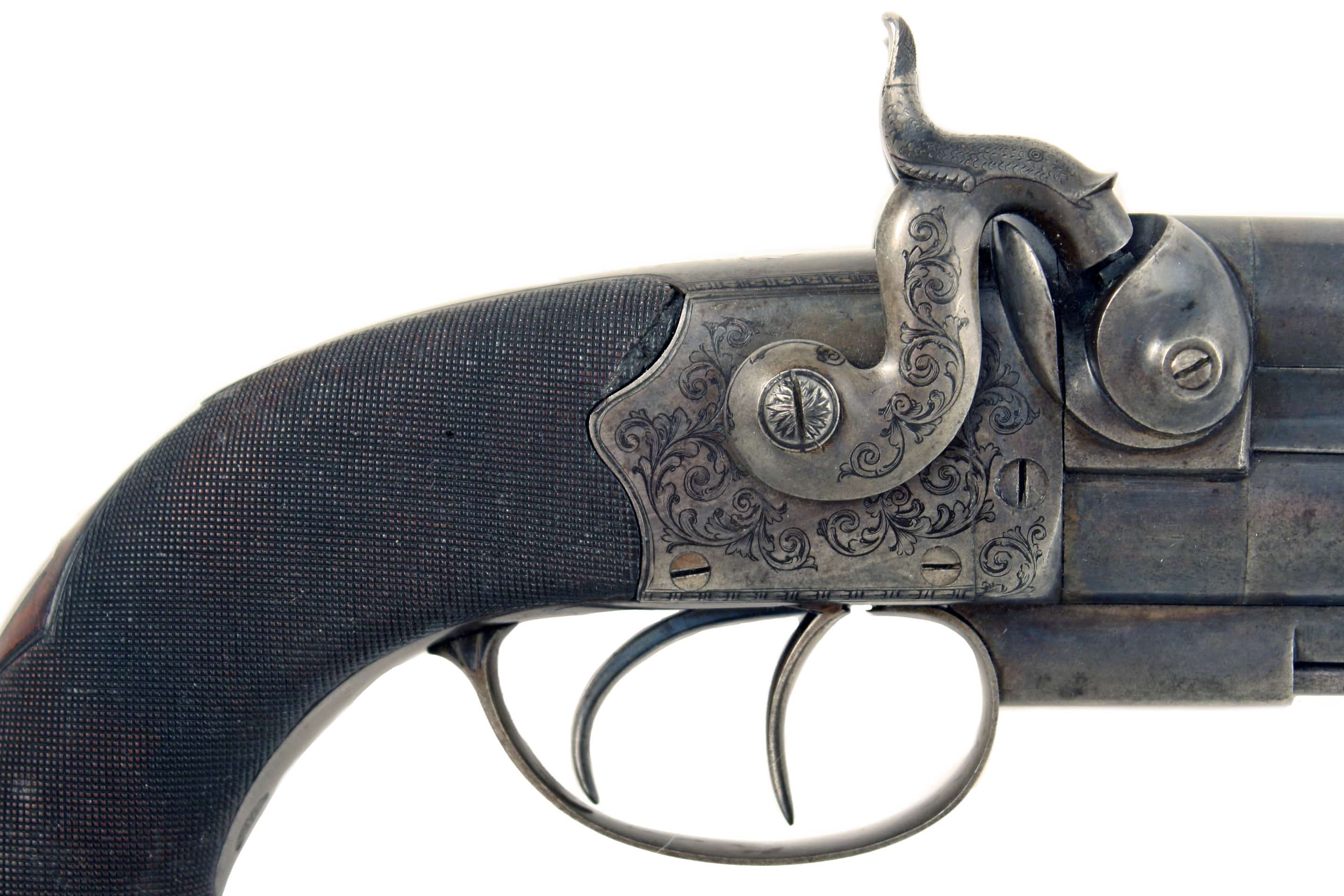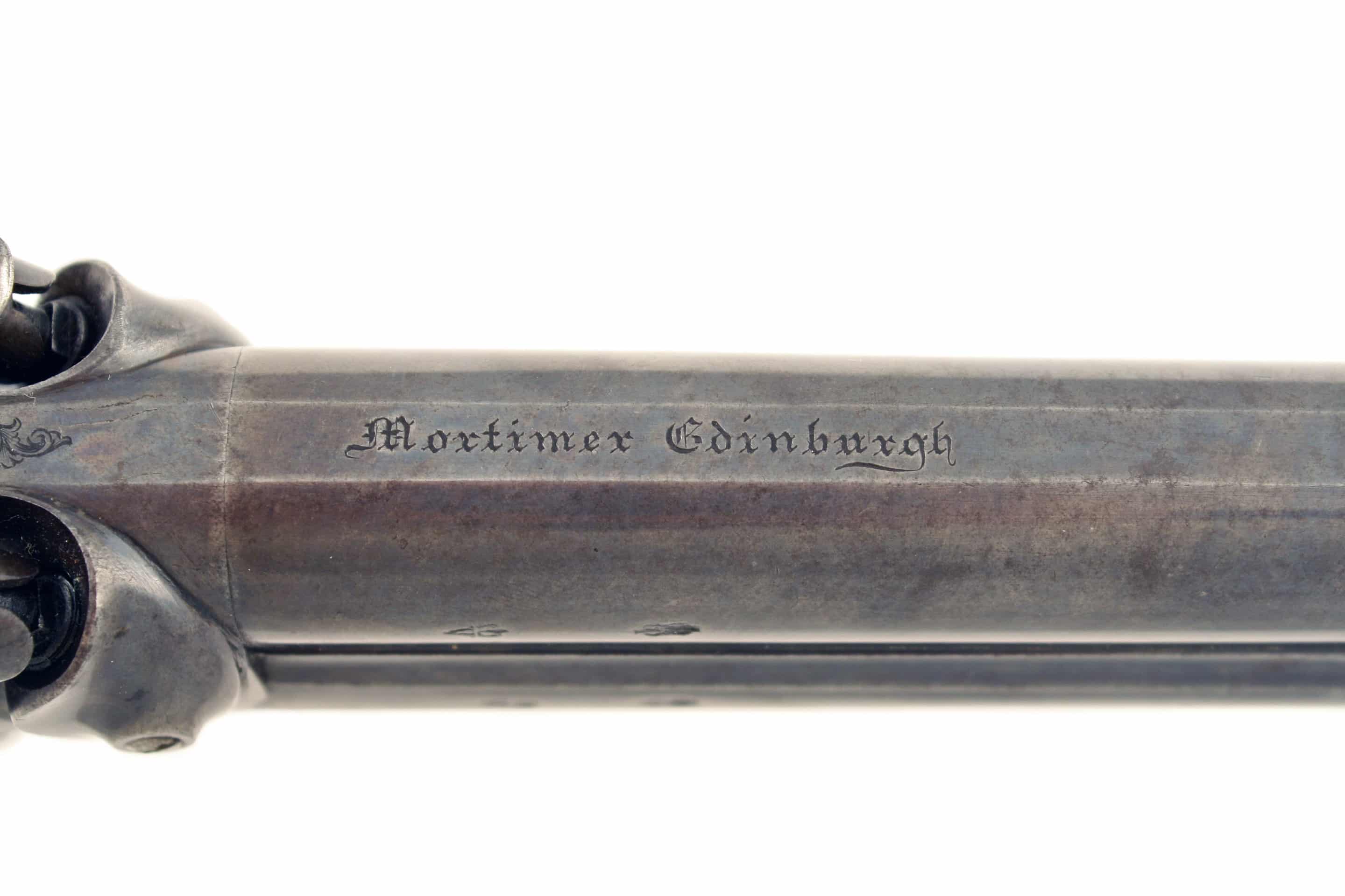 A Crisp 16 Bore Percussion Over & Under Howdah Pistol by Mortimer of Edinburgh. With colour case hardened sighted barrels engraved around the muzzles, engraved ‘MORTIMER EDINBURGH’ in Gothic script along the top-flat, fitted with captive ramrod below and stamped with London proofs, case-hardened scroll engraved box-lock action, hammers decorated era suite, foliate scroll engraved trigger guard, finely chequered rounded butt (small area of damage at top of grip -see pictures) case-hardened ovoid butt plate with hinged butt-trap cover, vacant rectangular escutcheon, blued belt hook. In fine original condition retaining a large amount of original colour.