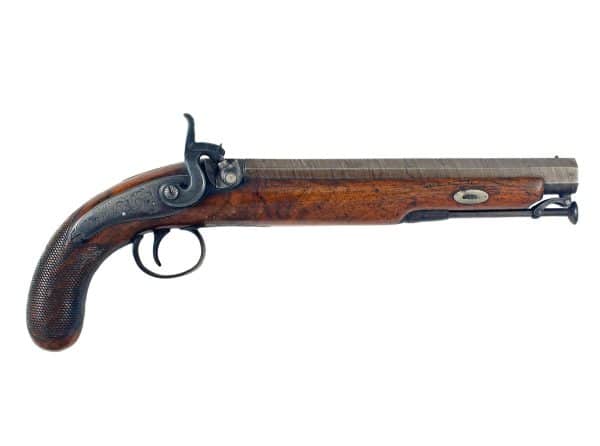 A Percussion Back Action Pistol by T. Wilson & Co. With sighted octagonal barrel retaining much original colour, case hardened breech block, engraved tang, signed border engraved lock, full-stocked in walnut, cut with chequering at the grip, engraved steel furniture comprising trigger guard decorated with foliage on the bow and stylised pineapple finial, steel ramrod pipes and captive ramrod. In good clean order.