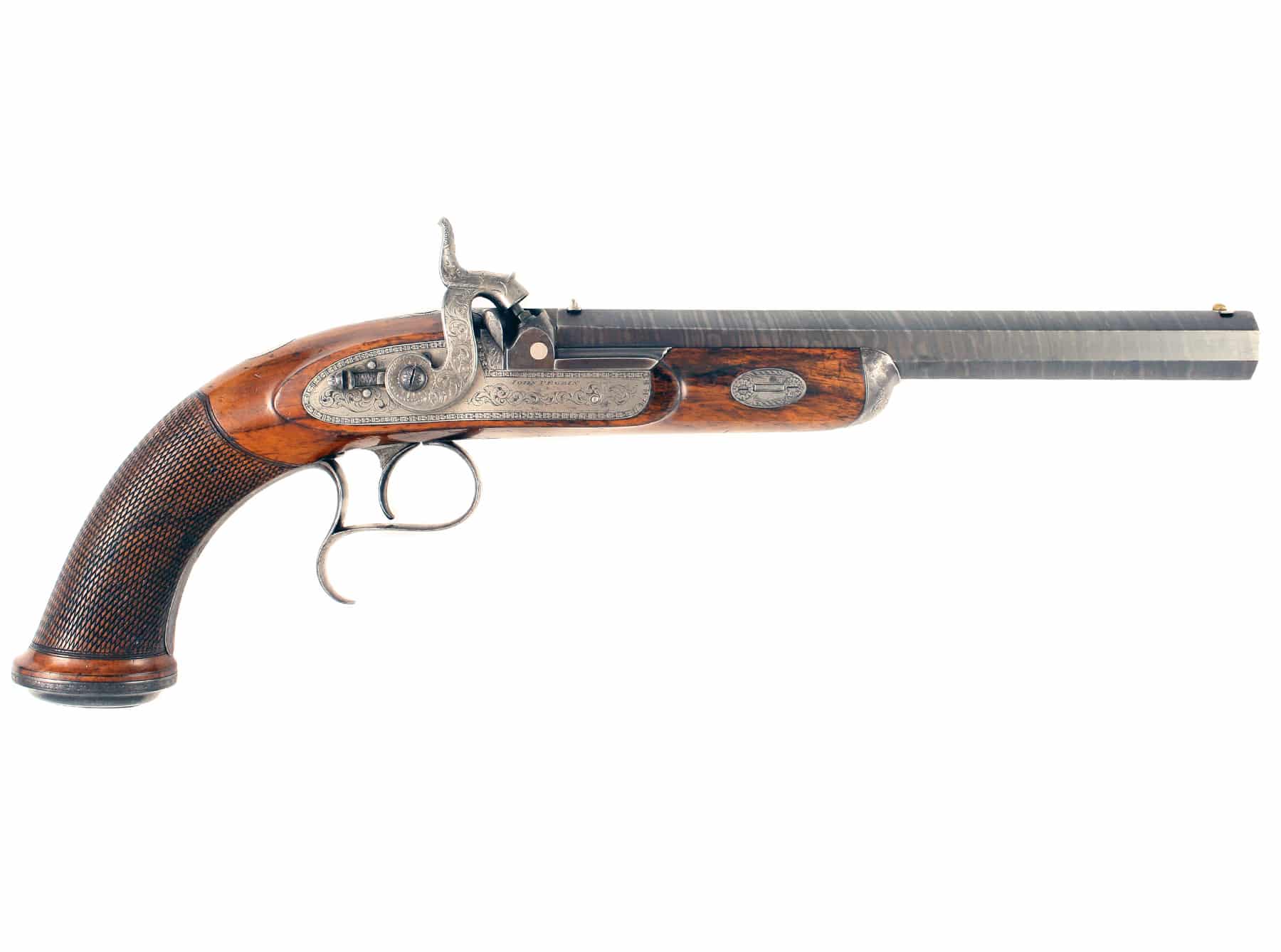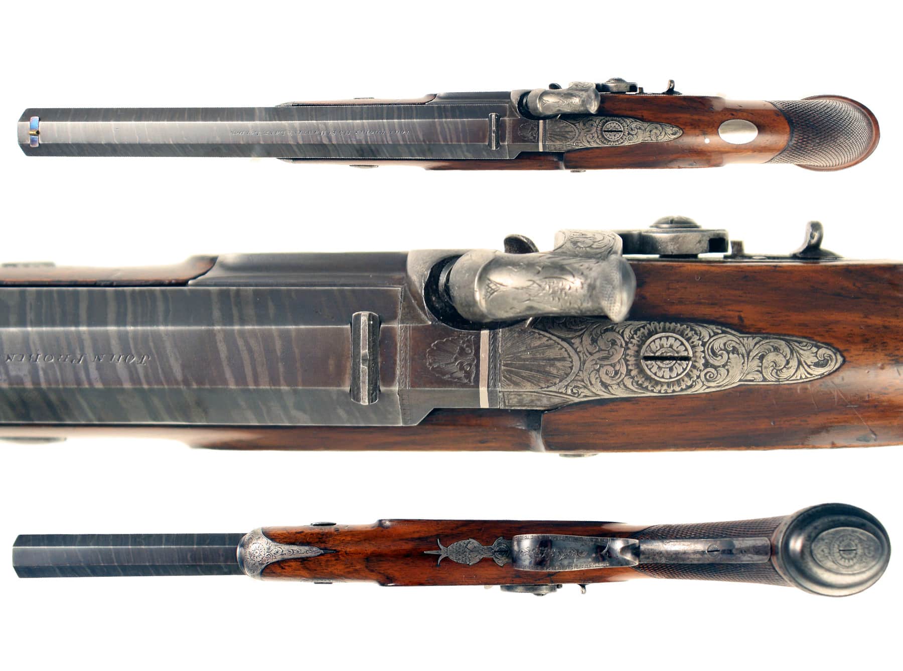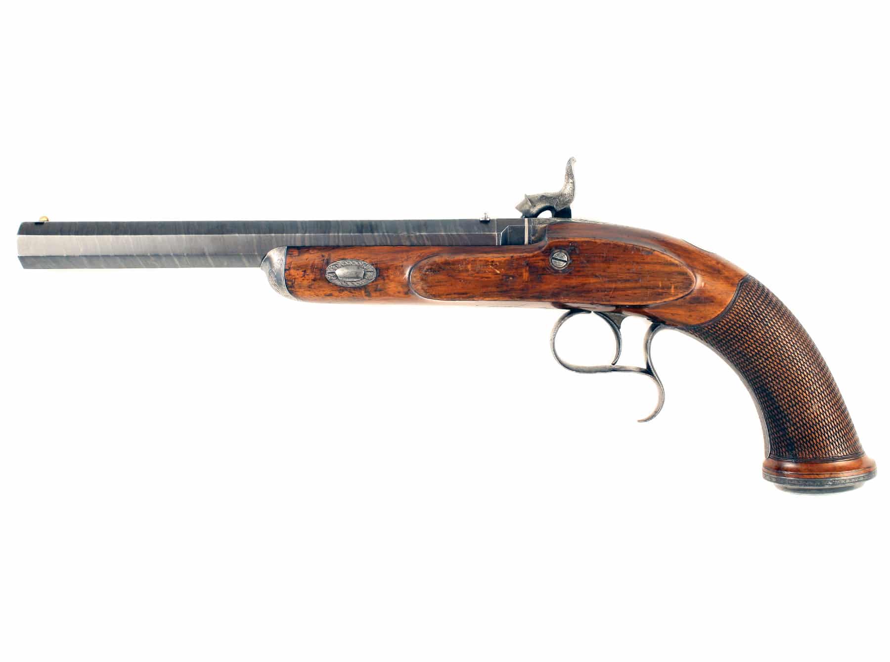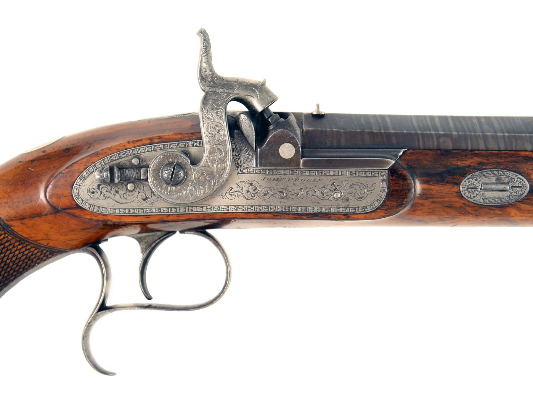 A Rifled Percussion Target Pistol by J. Probin. With sighted Damascus twist barrel, signed along the top-flat ‘JOHN PROBIN 115 St MARTINS LANE LONDON’ fitted with rear sight at breech, platinum lined breech decorated with foliage, profusely engraved tang, signed border engraved lock, decorated with scrolling foliage throughout, cock decorated en-suite, half-stocked in walnut, with steel mounts comprising oval butt cap engraved with scrolling foliage, blued, spurred trigger guard with pineapple finial and foliate engraved fore-end cap. A crisp pistol.