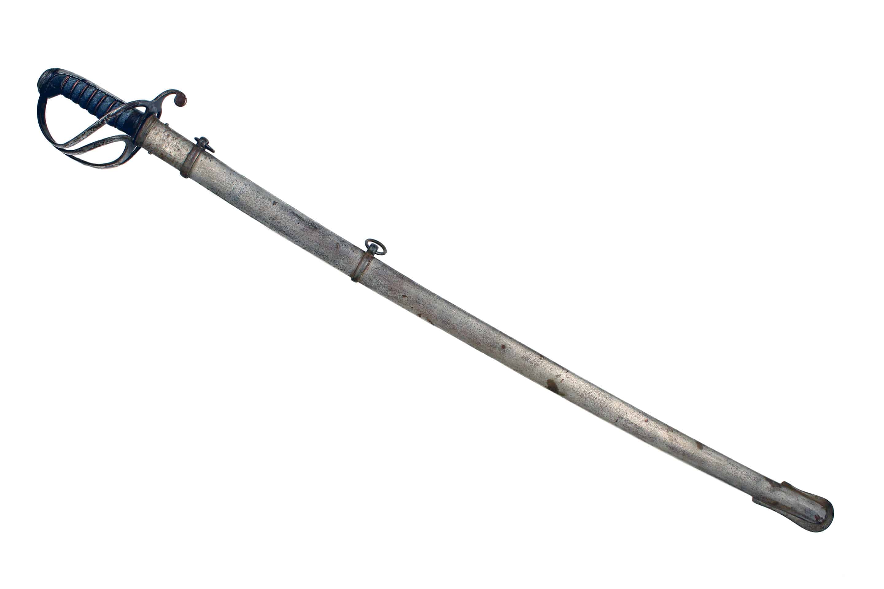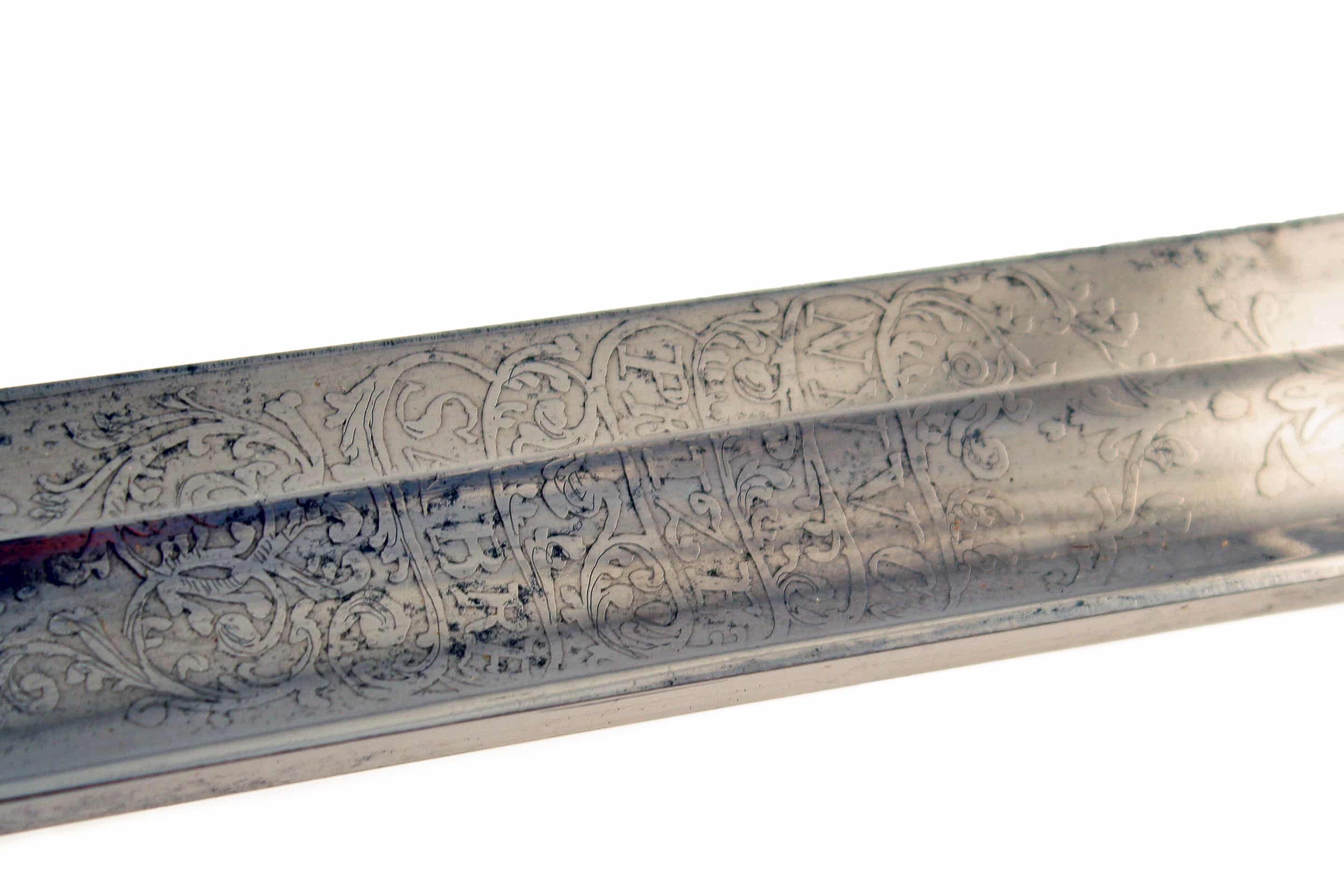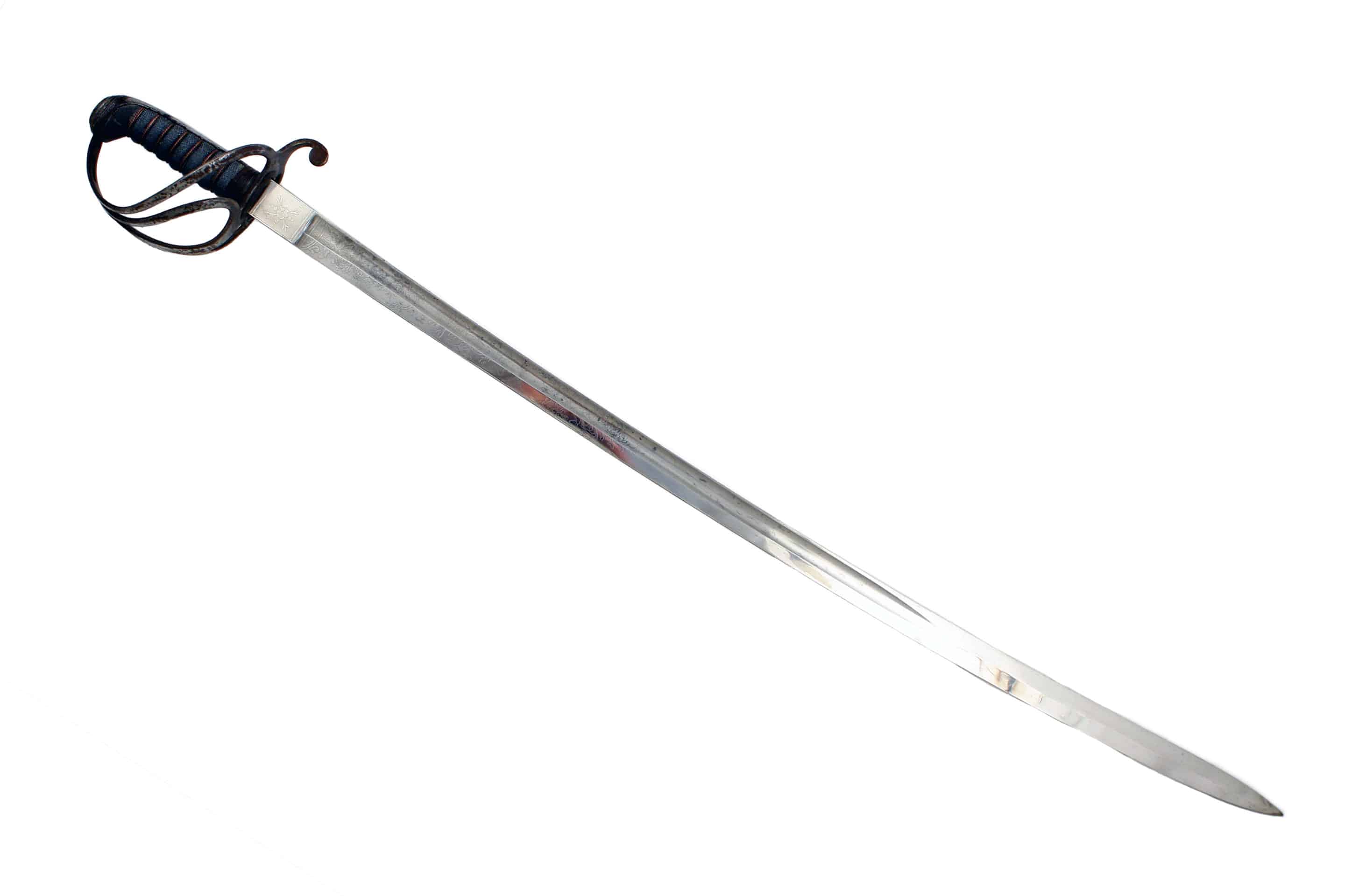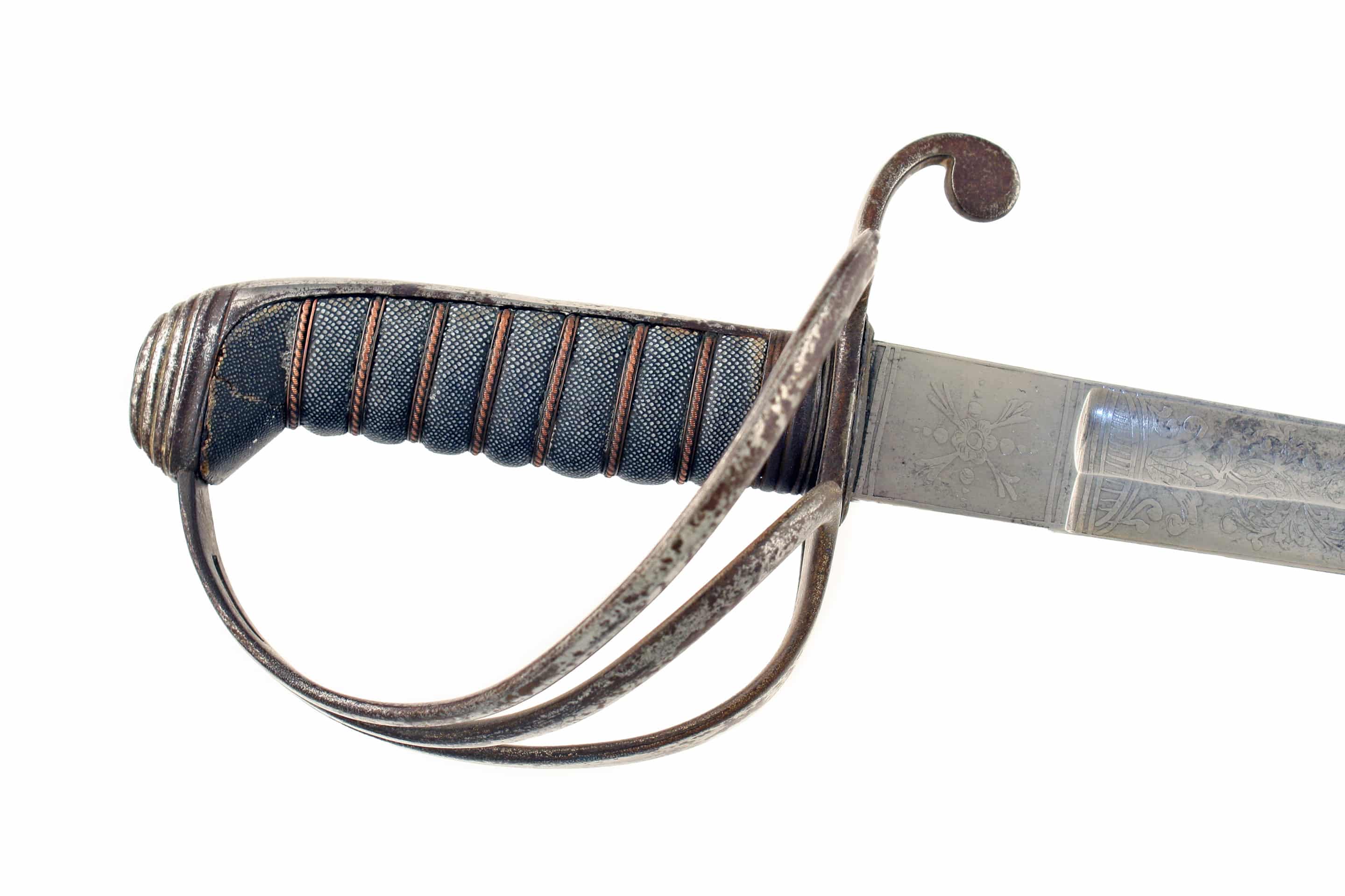 A Scarce Prize Sabre for the Newcastle & Northumberland Vol. Cavalry. With single edged blade double edged at the point, cut with a long fuller running along the back-edge, decorated with scrolling foliage and, ’N.N.V.C. PRIZE SABRE’ on a scroll, regulation steel hilt, with wire bound fish-skin grip, in original steel scabbard with two suspension rings.