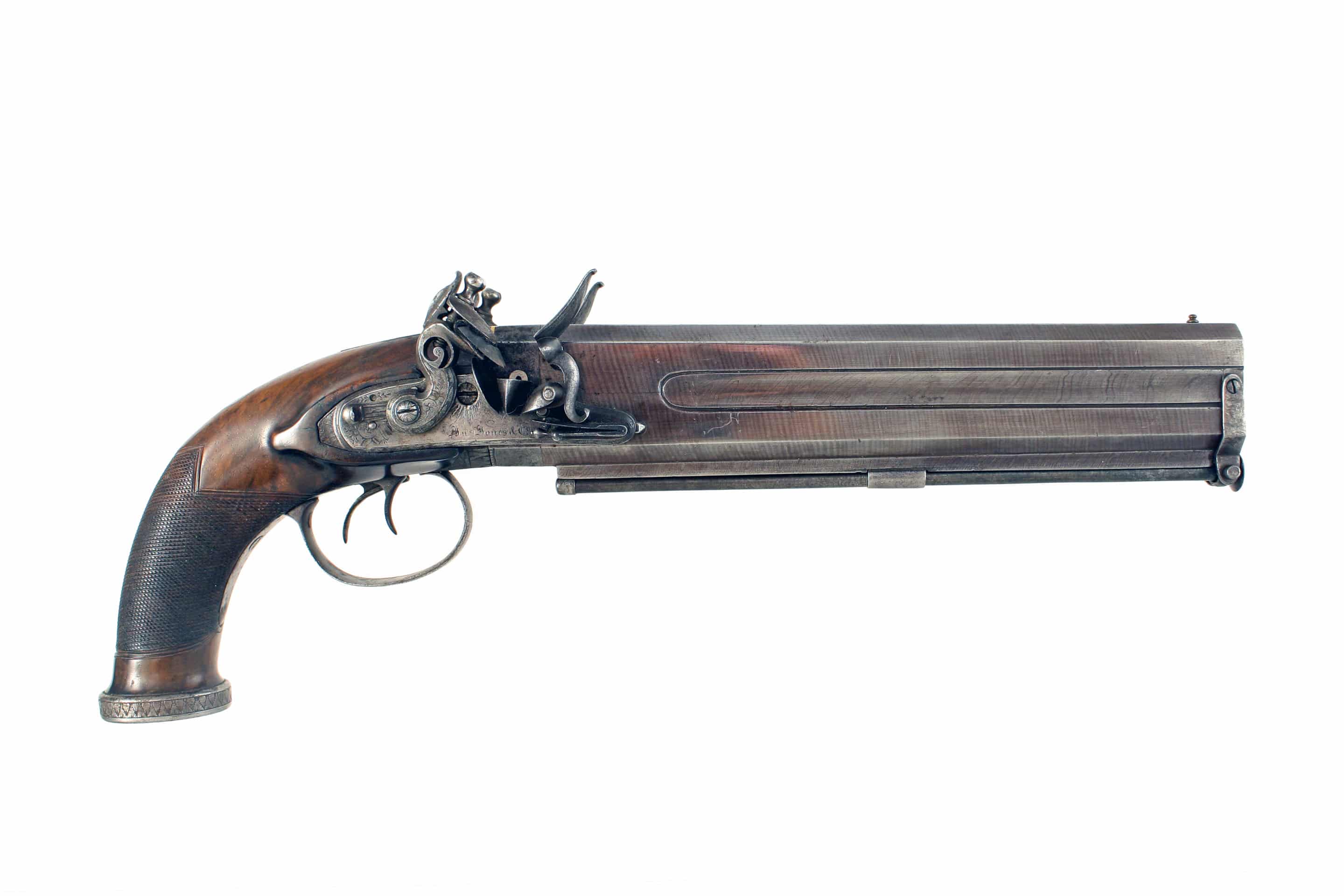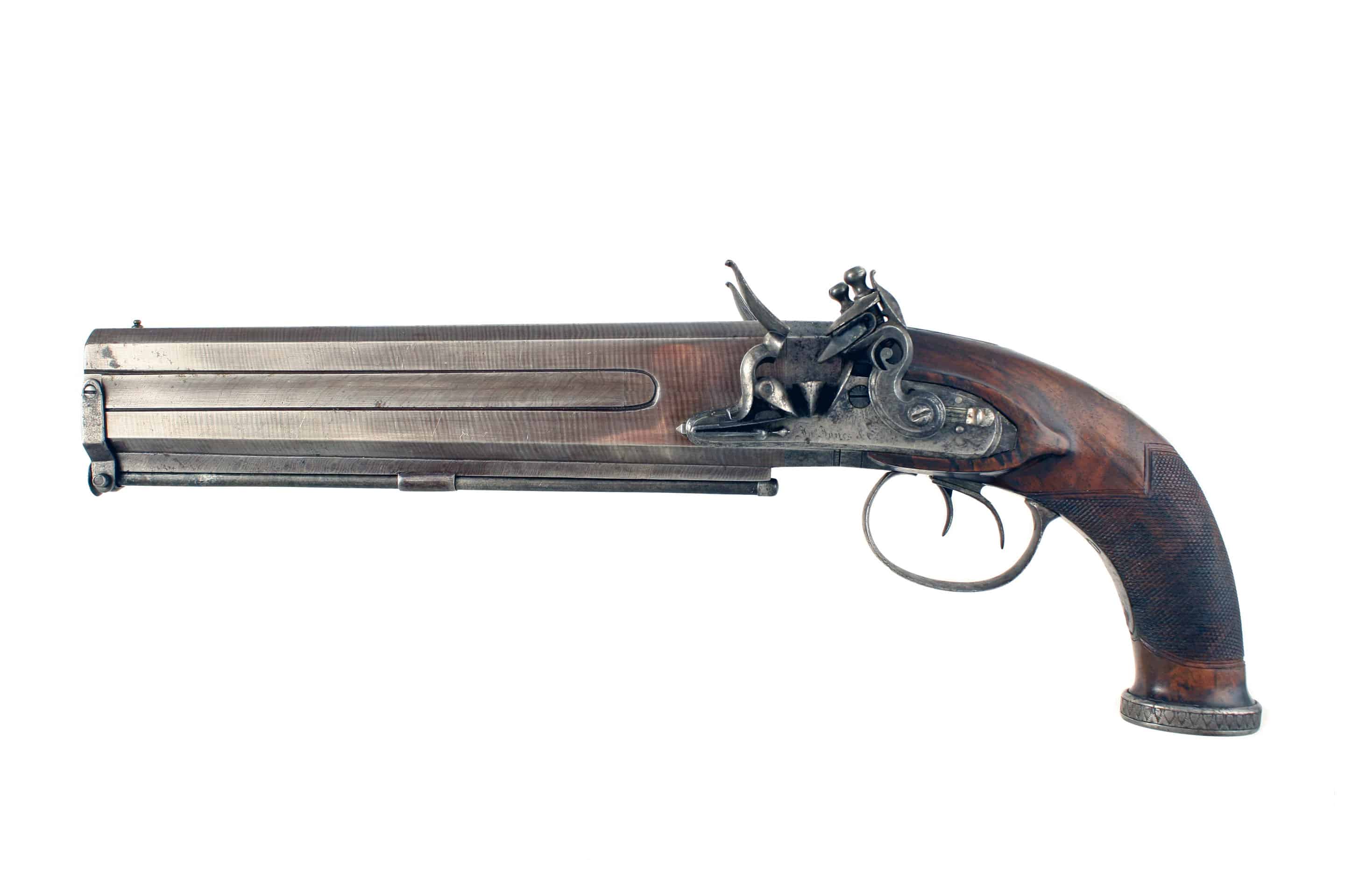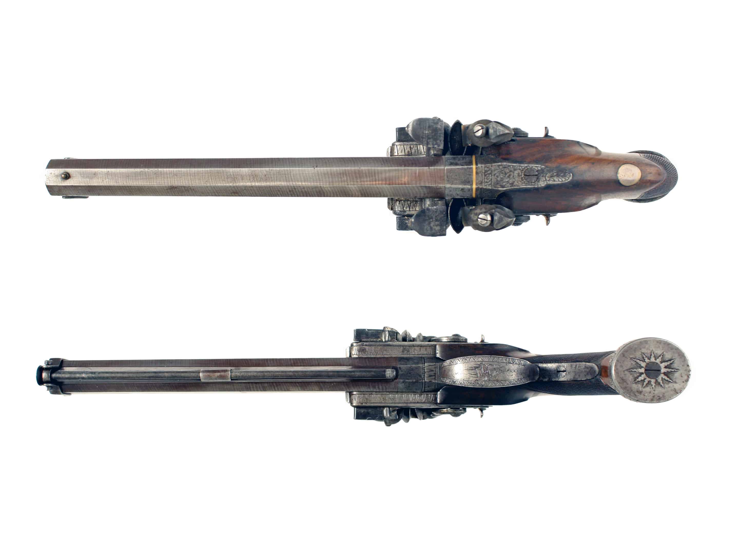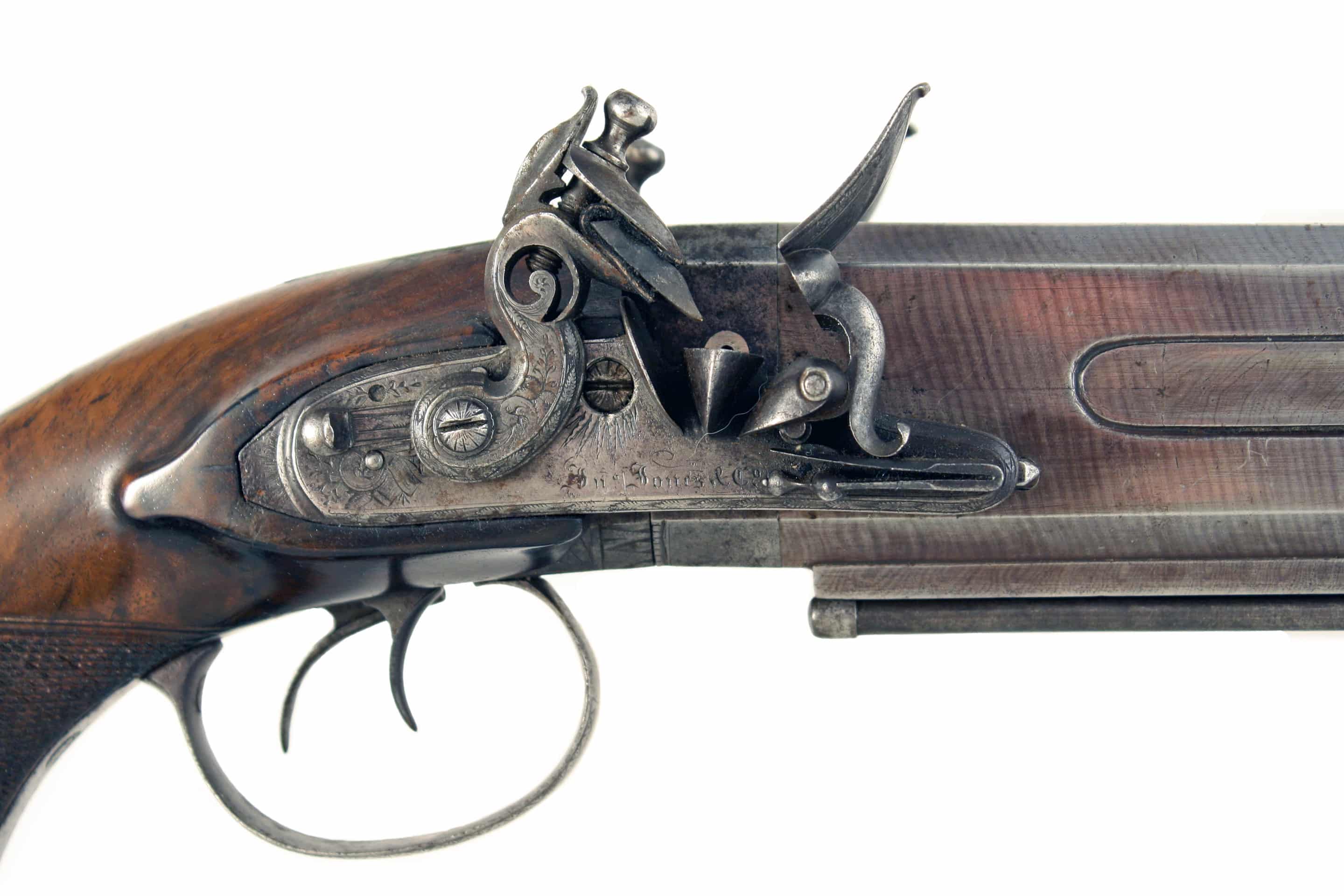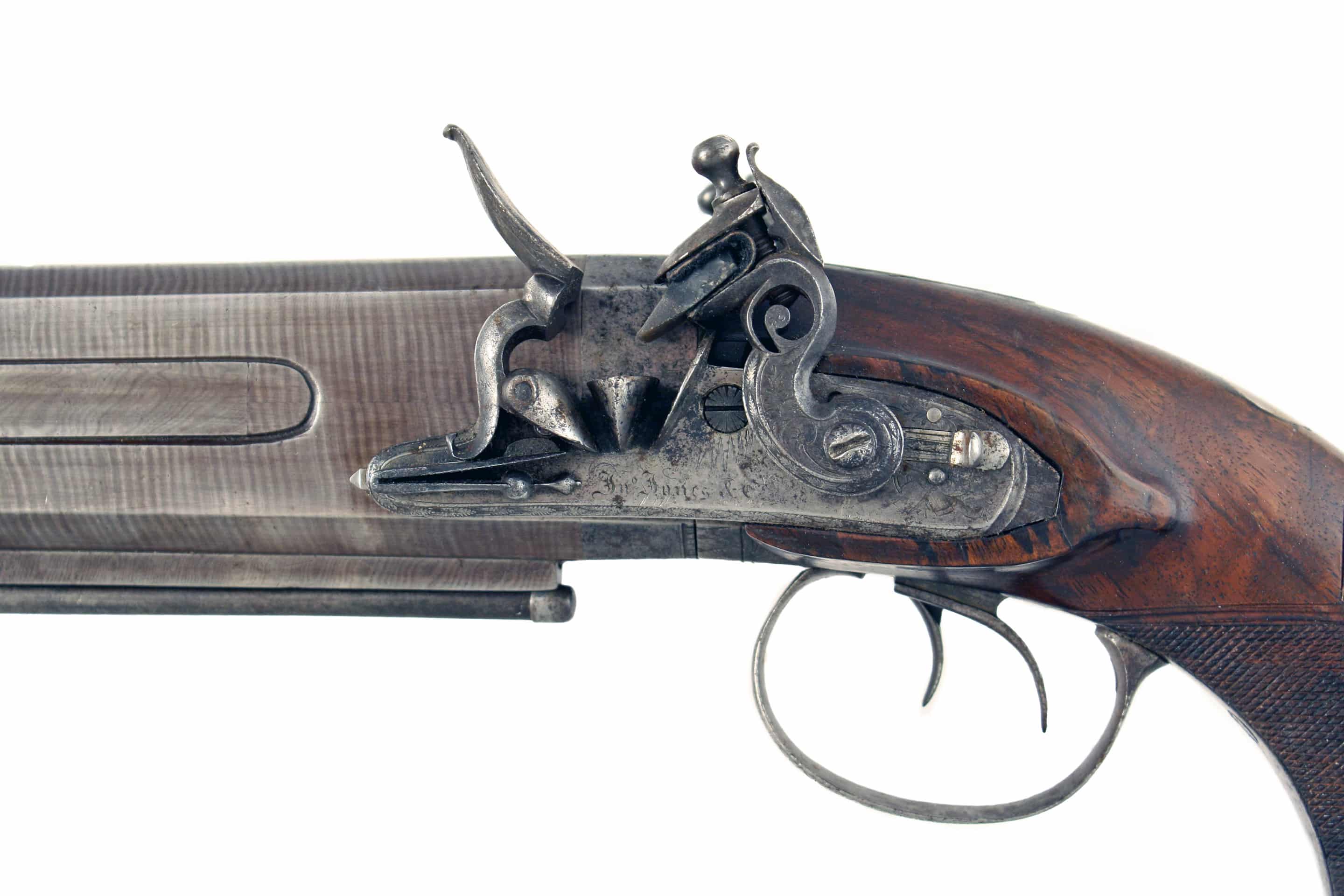 A Rare Flintlock Howdah Pistol by Jn. Jones & Co. With browned sighted twist octagonal barrels, with breech engraved ‘London’ and with single gold line, platinum touch-holes, profusely engraved tang, stepped, bevelled lock engraved ‘Jn. Jones & co’ and decorated with scrolling foliage at the tails, both locks fitted with sliding safety catches, profusely engraved cocks, rain-proof pans, figured butt chequered at the grip, with rounded butt with engraved ovoid pommel cap, border engraved trigger guard decorated with a stand of arms in the centre, captive ramrod.