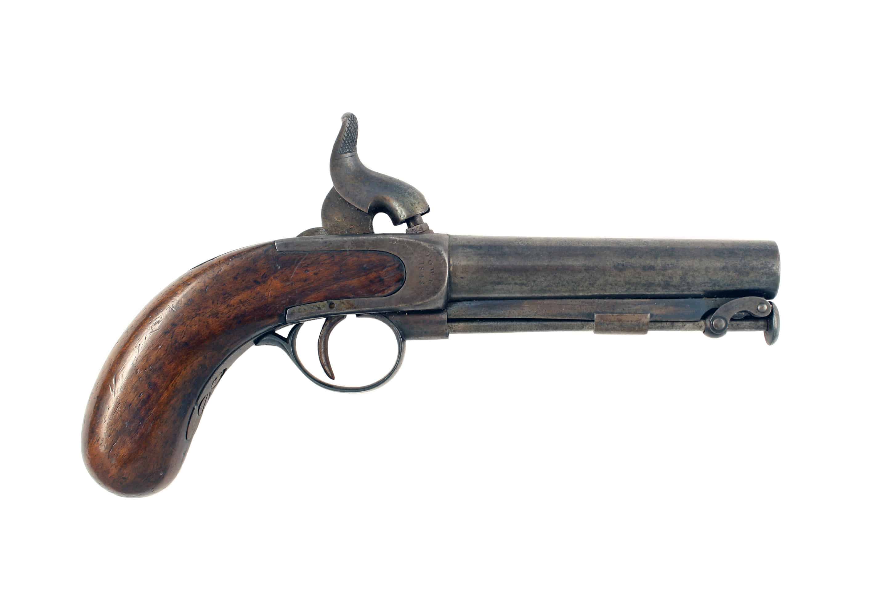 A Rare Victorian Irish Constabulary Pistol. With round barre stamped with Irish registration mark, ‘C-296’ London proofs and various other marks, engraved action, ‘TOWER 1848’ to the right and crowned VR to the left, swelling figured walnut butt with ordnance mark to the left, and with its original stirrup ramrod.