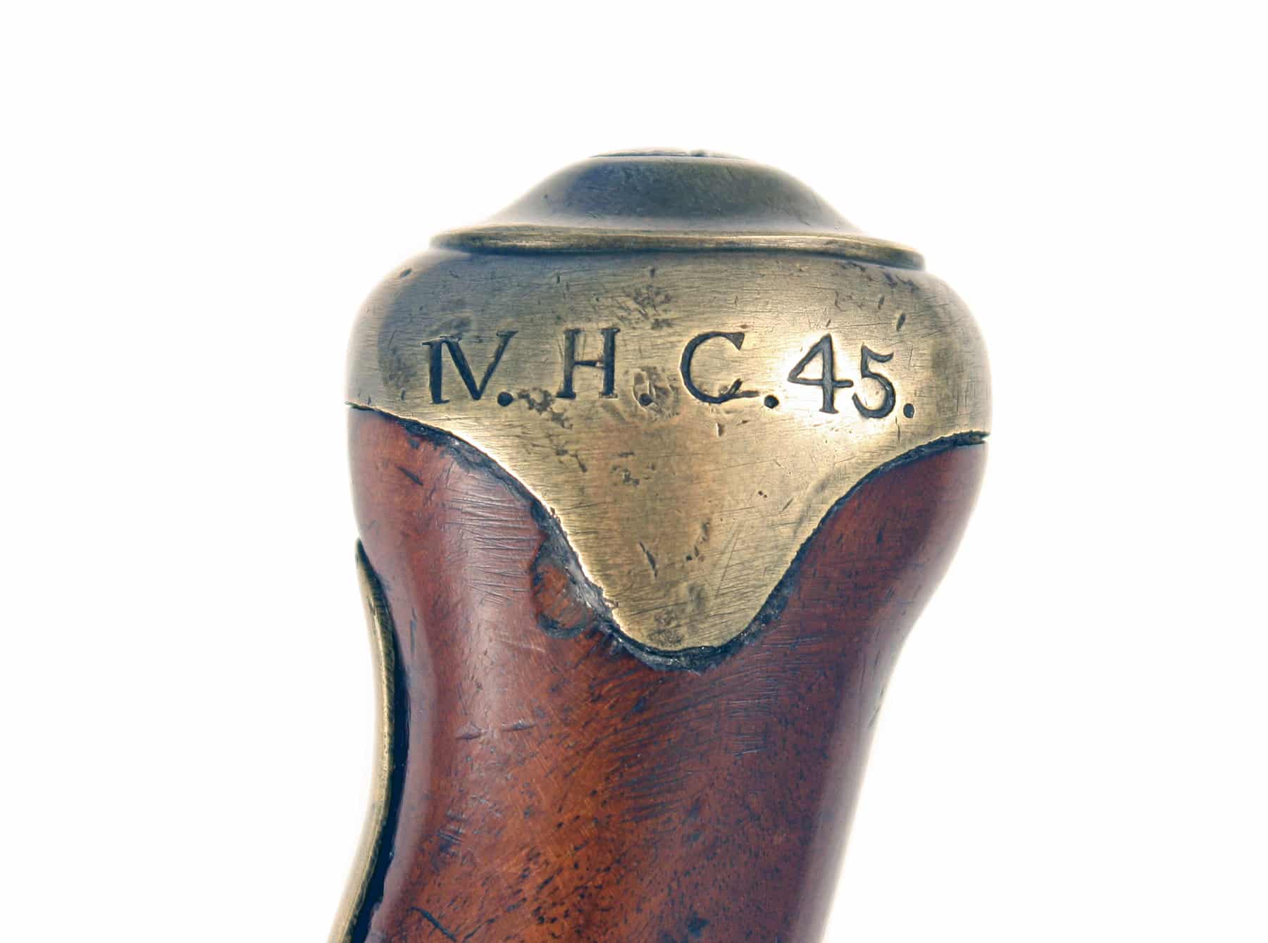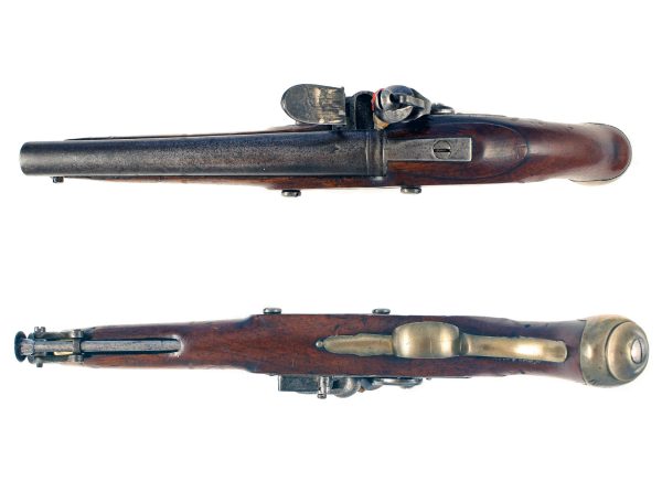 A Regimentally Marked New Land Pattern Flintlock Pistol. Of regulation specifications, with round barrel stamped with Tower proof and viewing marks, flat lock stamped with GR beneath a crown and TOWER across the tail, walnut full-stock impressed with inspection marks and store keepers marks, plain brass mounts comprising of side plate, with butt cap stamped IV. H. C. 45.’, trigger guard and original stirrup ramrod.