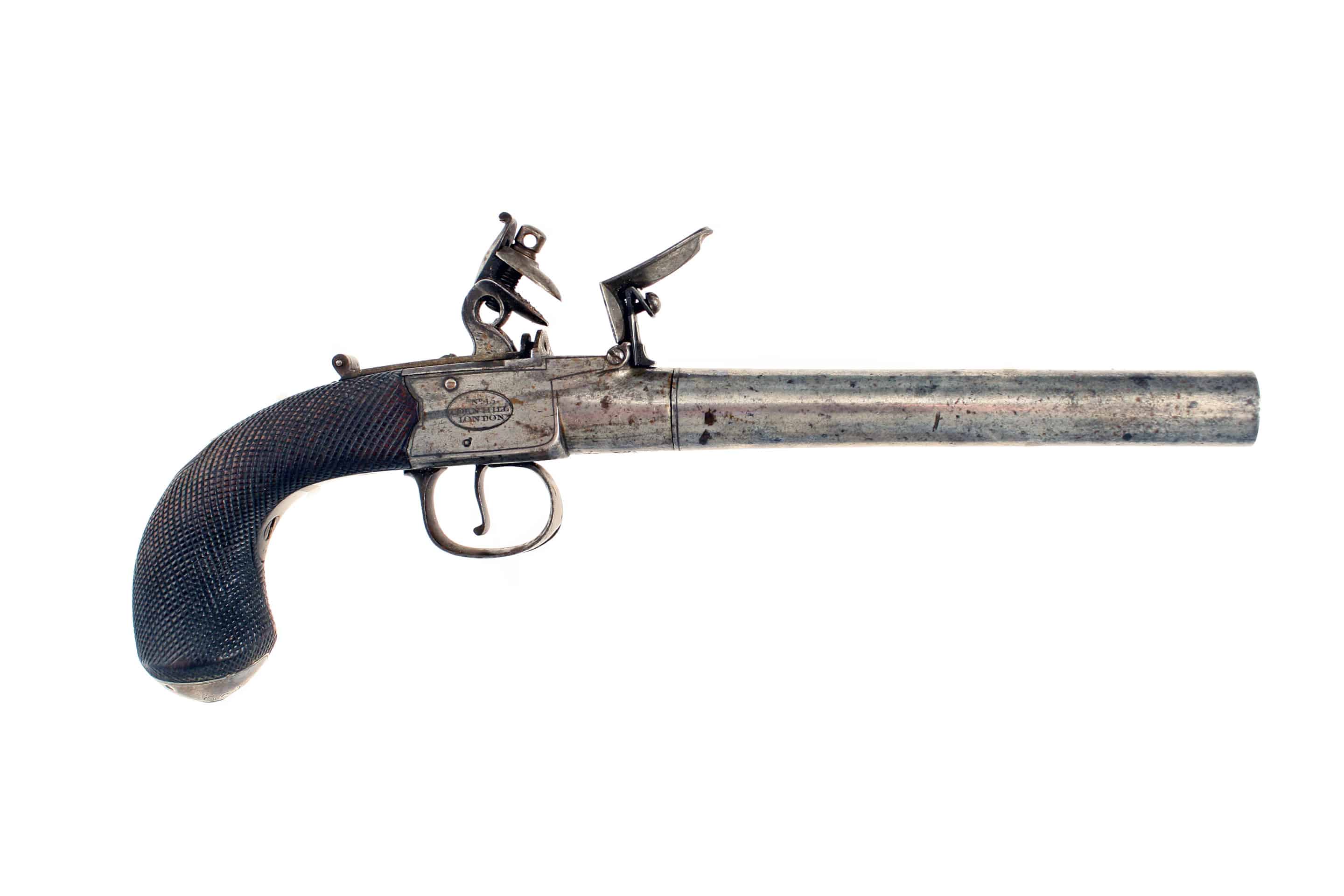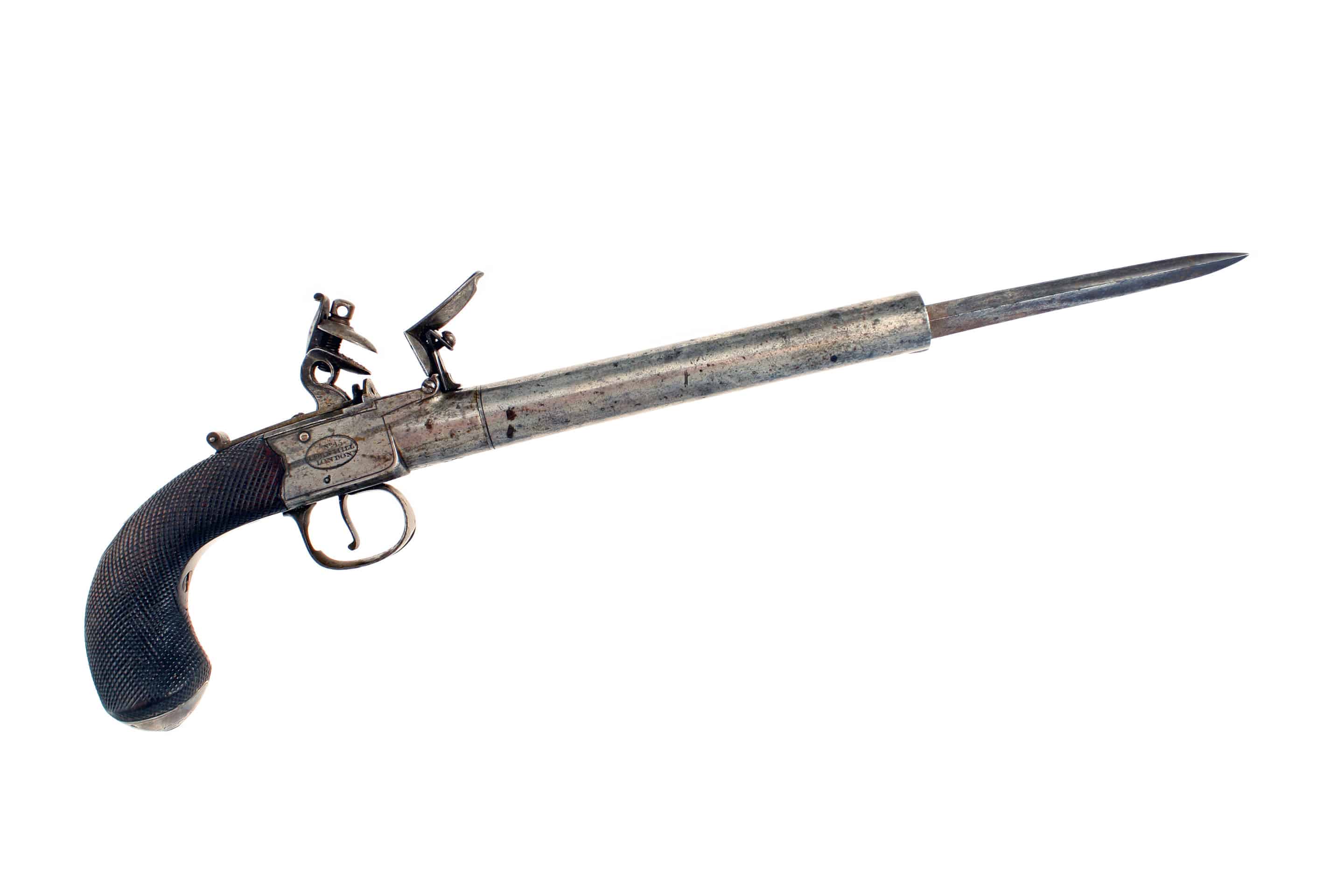 A Rifled 22-Bore Flintlock Pistol by P. Bond London. With round turn-off barrel, cut with rifling and fitted with a side-mounted sprung bayonet (bayonet catch at end of barrel absent – see photographs) border engraved box-lock action, signed ’No. 45 CORNHILL LONDON’ within an oval to the left and ‘P.BOND’ within an oval above the bayonet catch, fitted with a sliding safety catch that also locks the pan, border engraved cock, replacement top-jaw screw, swelling chequered butt, with silver butt cap. Tower of London private proofs.