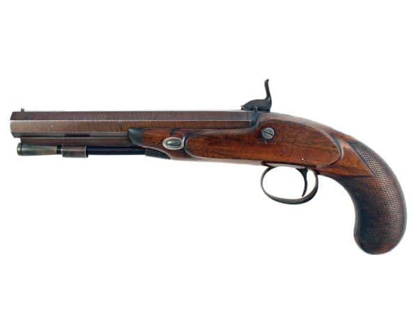 A Rifled Percussion Pistol by Fenton of London. With heavy sighted octagonal barrel signed along the top-flat, border engraved tang fitted with rear-sight, border engraved lock decorated with scrolling foliage throughout, cock decorated en-suite, half-stocked in walnut, cut with chequering at the grip (old repair underneath the lock – see photographs) horn forehand cap, steel mounts comprising trigger guard, decorated with foliage on the bow and pineapple finial, turned ramrod pipe and horn-tipped ramrod.