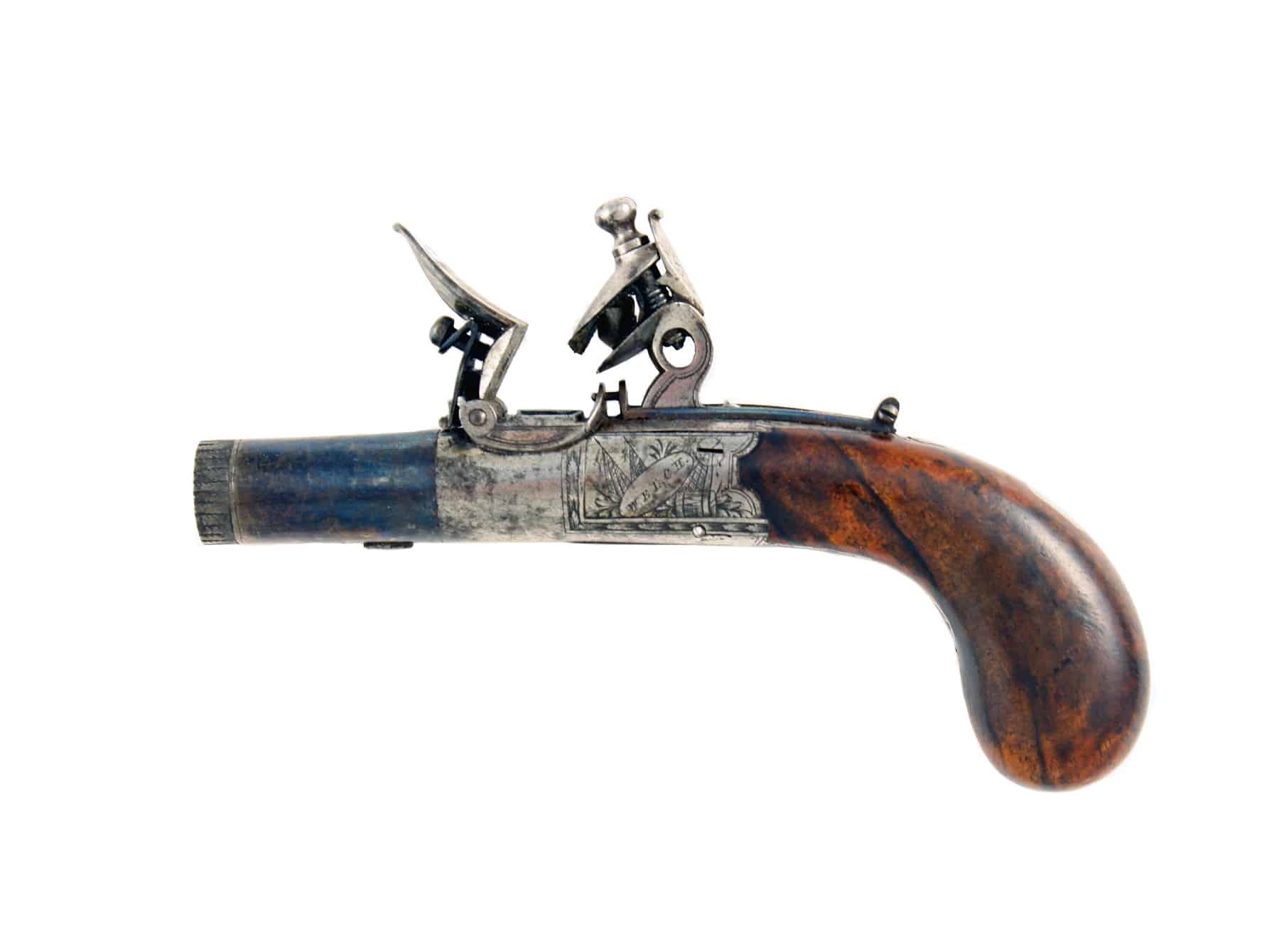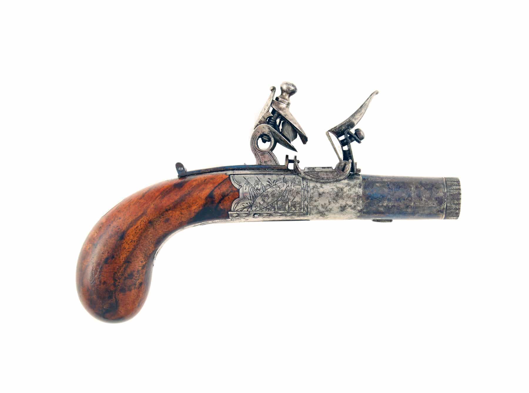 A Round Framed Flintlock Pocket Pistol by Welch of Banbury. With round turn-off barrel, decorated with a band of foliage at the muzzle, retaining most of its original blue, stamped with Birmingham proofs, round border engraved action, signed ‘BANBURY’ on and oval surrounded by stands of arms to the right, and WELCH in an oval to the left, fitted with sliding thumb-piece safety catch that also locks the pan, swelling walnut butt with vacant white metal escutcheon, fold down trigger.