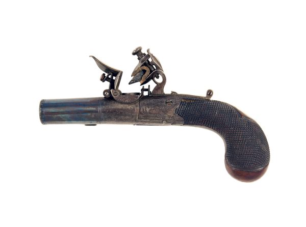 A Round Framed Flintlock Pocket Pistol signed Nock of London. With round turn-off barrel, decorated with foliage at the muzzle, stamped below with Birmingham proofs, border engraved box-lock action, signed within an oval to the left, surrounded by stands of arms, and London to the right, fitted with a sliding safety catch above, chequered walnut grip, with vacant rectangular escutcheon.