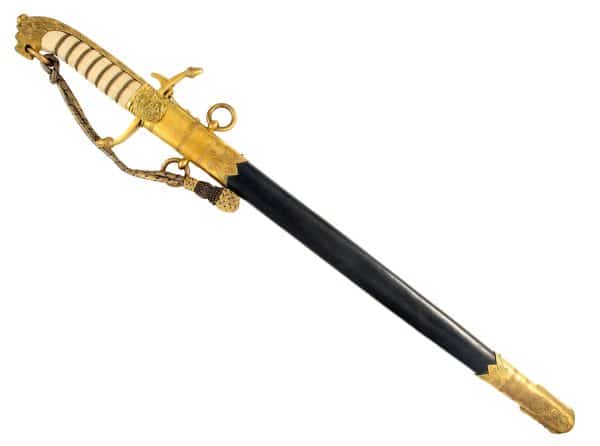 An Outstanding Blue & Gilt 1891 Pattern Midshipman’s Dirk. Blade by J.R. Gaunt & Son, London. Etched with scrolls, crowned ER VII cypher and fouled anchor, unusual blue and gilt blade (some areas of pitting) regulation gilt hilt with lion’s head pommel, wire bound fish skin grip, in its leather scabbard with engraved gilt mounts, the locket fitted with spring clip and twin suspension rings, complete with knot with blue and gold cord and acorn.