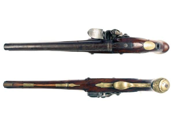 A Scarce Heavy Dragoon by Willmore, Circa 1730. With round tapering barrel engraved WILLMORE LONDON, and stamped with London proofs and Foreigners mark, plain tang, plain banana shaped lock, engraved WILLMORE, full-stocked in walnut with swelling fore-end and relief panels at lock and tang, brass furniture comprising pierced side-plate, long eared butt cap, plain trigger guard and ramrod pipes, the pistol has also been cut for shoulder stock. A rare an interesting example.