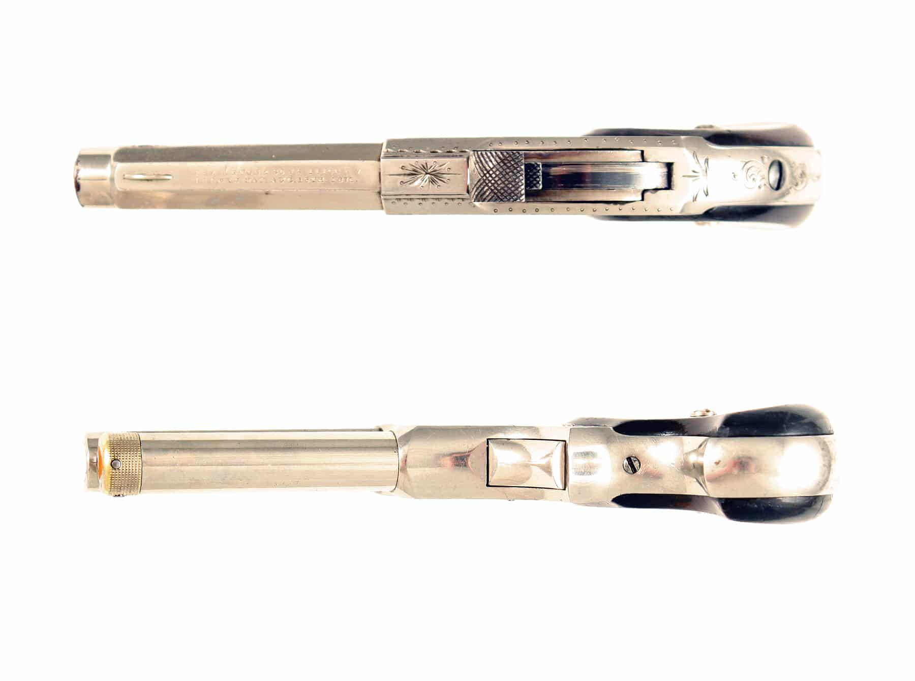 A Remington Rider Five-Shot Magazine Pistol, Circa 1871-88. With nickel-plated octagonal sighted barrel stamped ‘E. Remington & Sons. Ilion. N.Y. Riders Pat. Aug. 15th 1871.’ along the top flat and with integral tubular magazine beneath, border engraved nickel-plated frame and bird’s head butt, the former engraved with foliate scrollwork against a punched ground on both sides, spur trigger, chequered hammer and striker spurs, hollowed figured grips, and retaining nearly all its nickel-plated finish.
