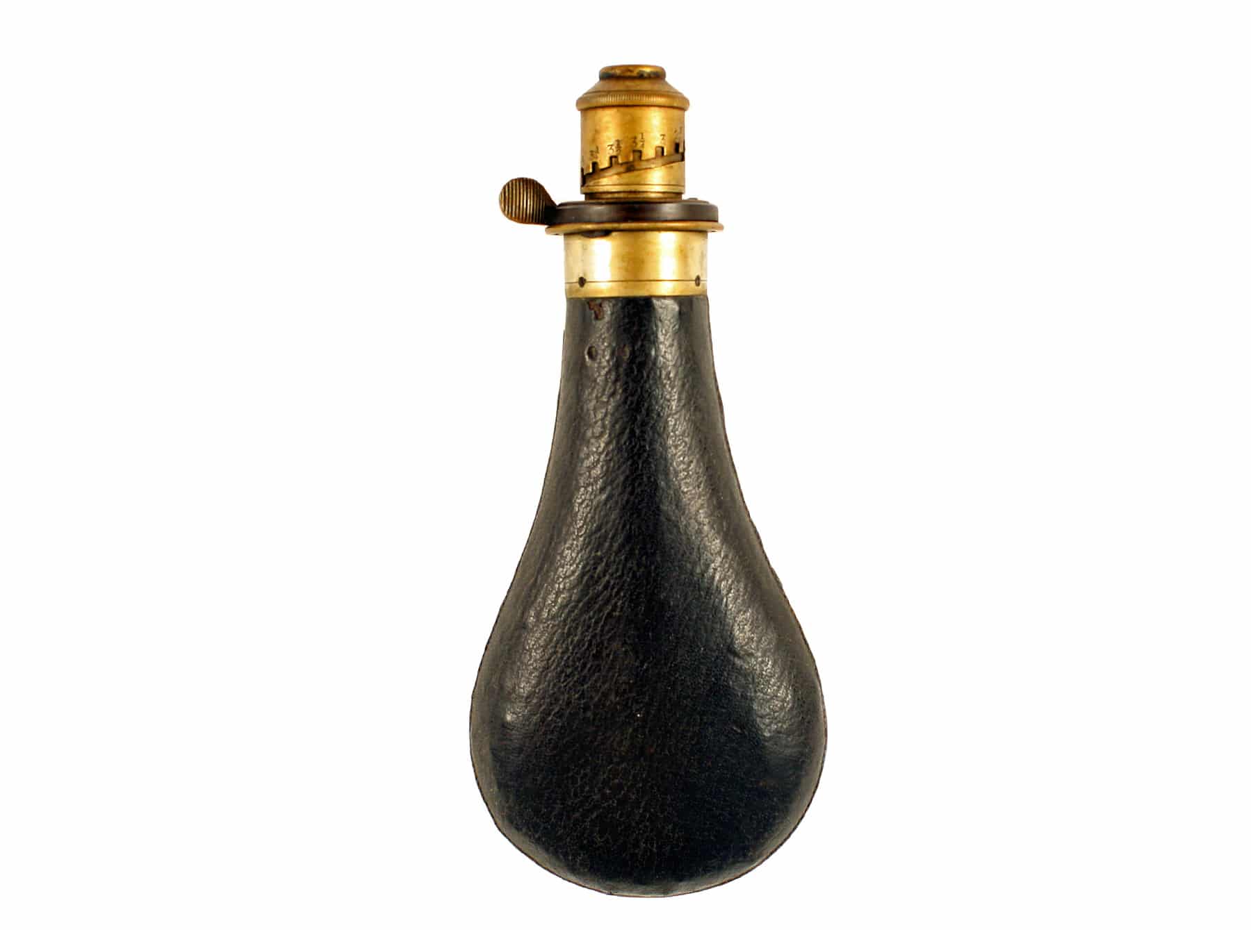 A Leather Covered Powder Flask by Snider. With leather covered body, seams good but damage at the top near the spout, some bubbles beneath the leather, the large nozzle graduated from 2 1/2 to 4 drams, the top marked ‘EXTRA QUALITY’ and ‘SNIDER’.
