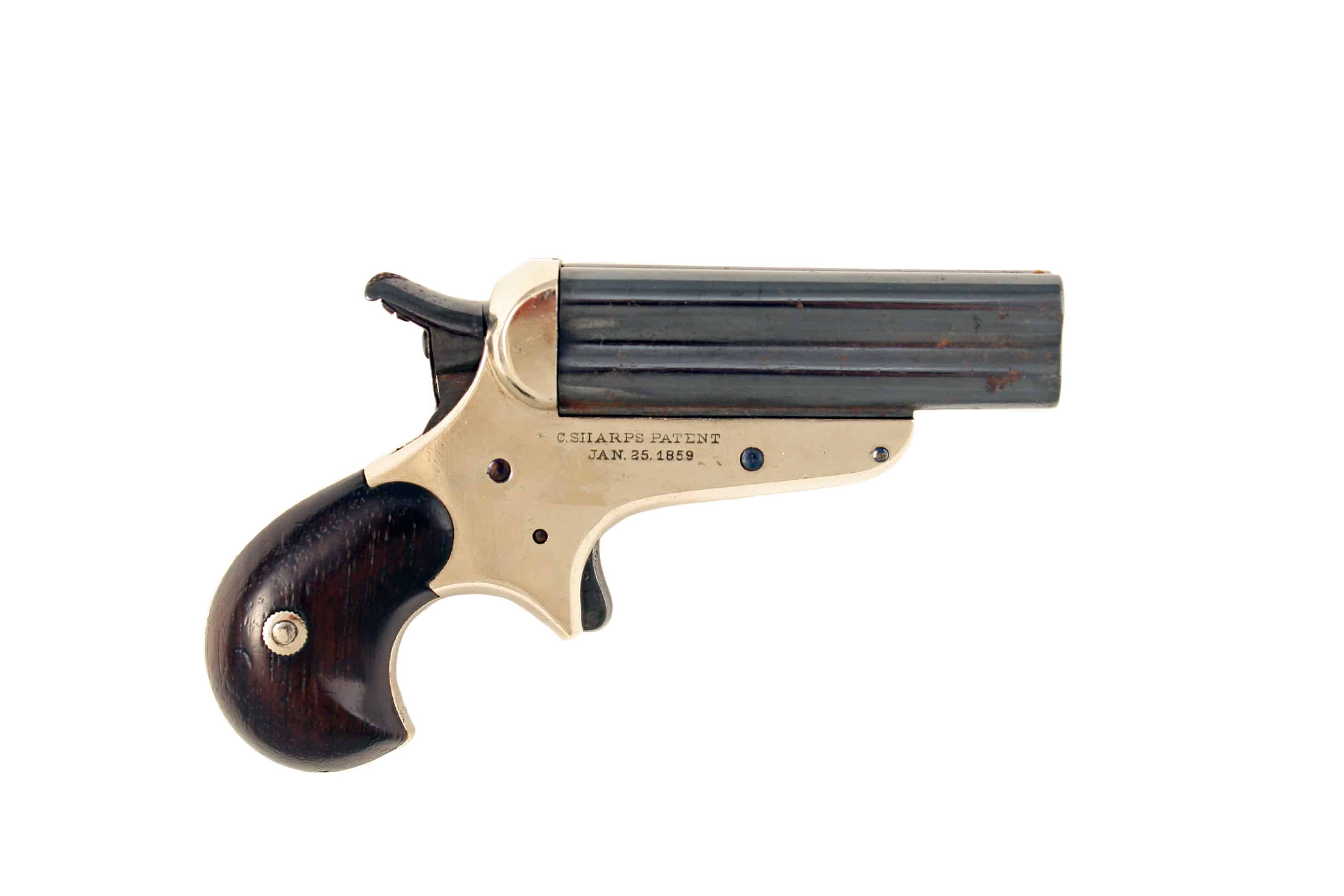 A Sharps Model 4 Barrel Derringer. With sighted barrel block, plated frame, rotating hammer nose, polished wooden grips, stamped ‘C.SHARPS PATENT JAN25. 1859’. In superb condition overall.