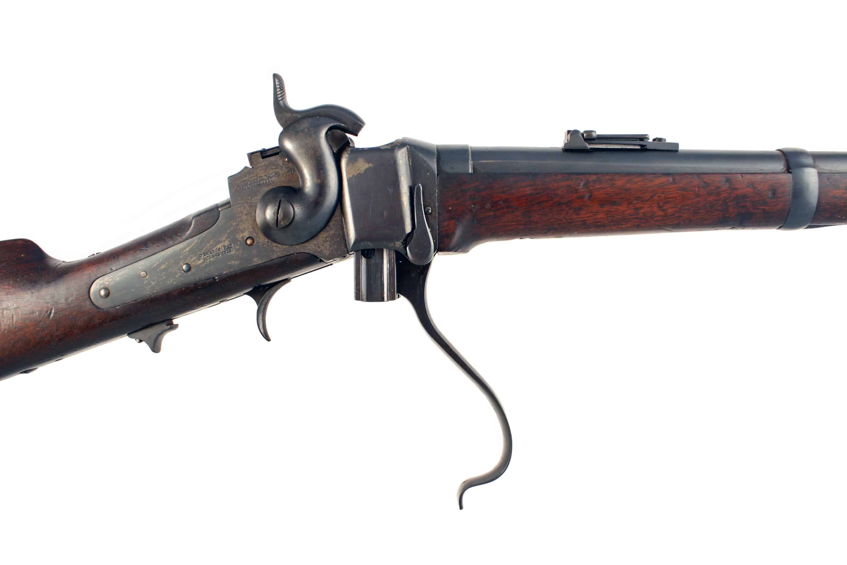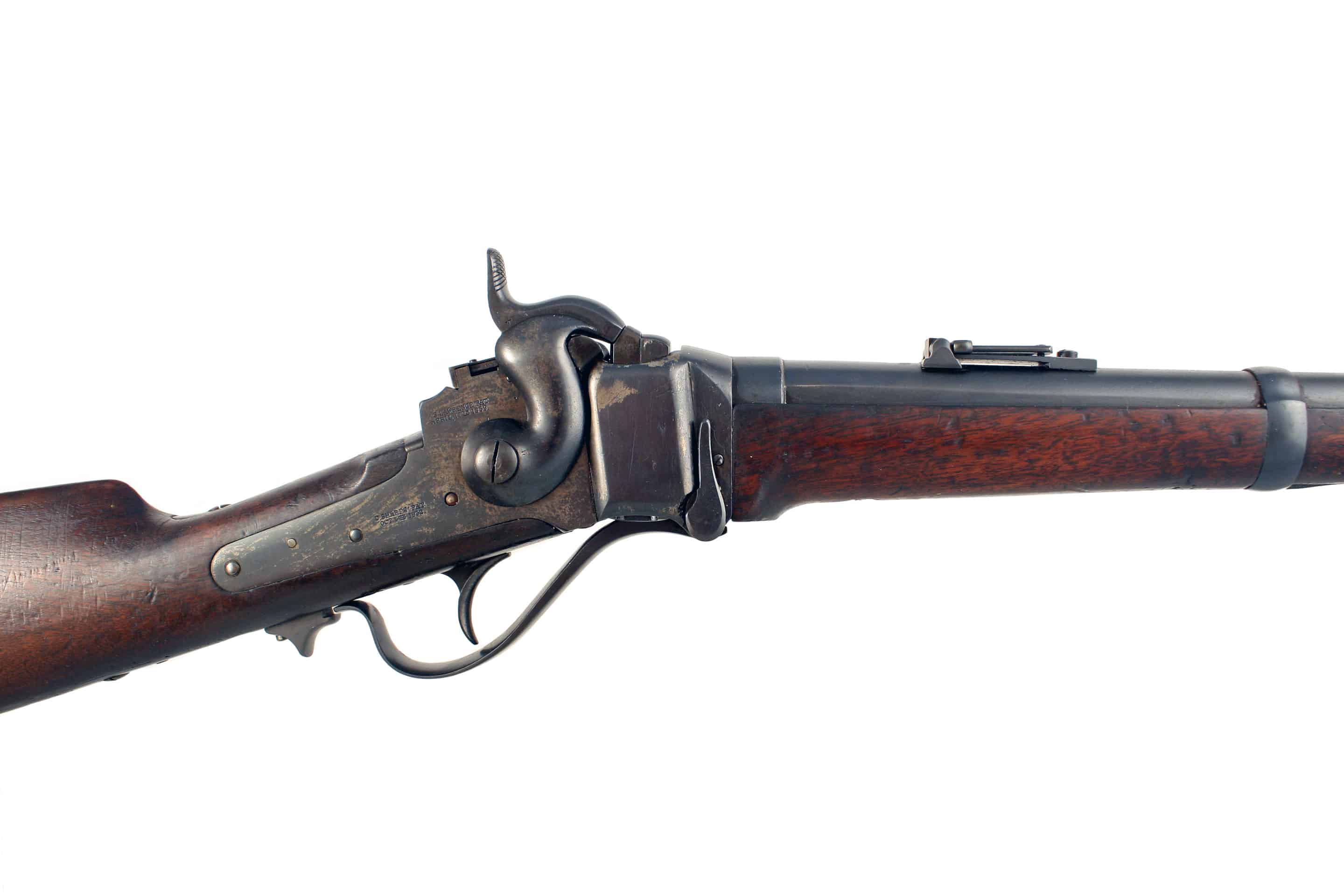 A Sharps New Model 1863 Carbine. Serial number C. 45283. With round sighted barrel and ladder rear-sight, the top of the barrel marked, ‘SHARPS RIFLE/ MANUFG. CO./HARTFORD CONN.’ and ‘NEW MODEL 1863’ the receiver marked on the right side, ‘R.S. LAWRENCE PAT/ APRIL 12TH 1859’ and ‘C.SHARPS’PAT/OCT 5TH 1852’ and on the left side, ‘C.SHARPS PAT/SEPT 12TH 1848’, walnut stock, steel butt plate and band.