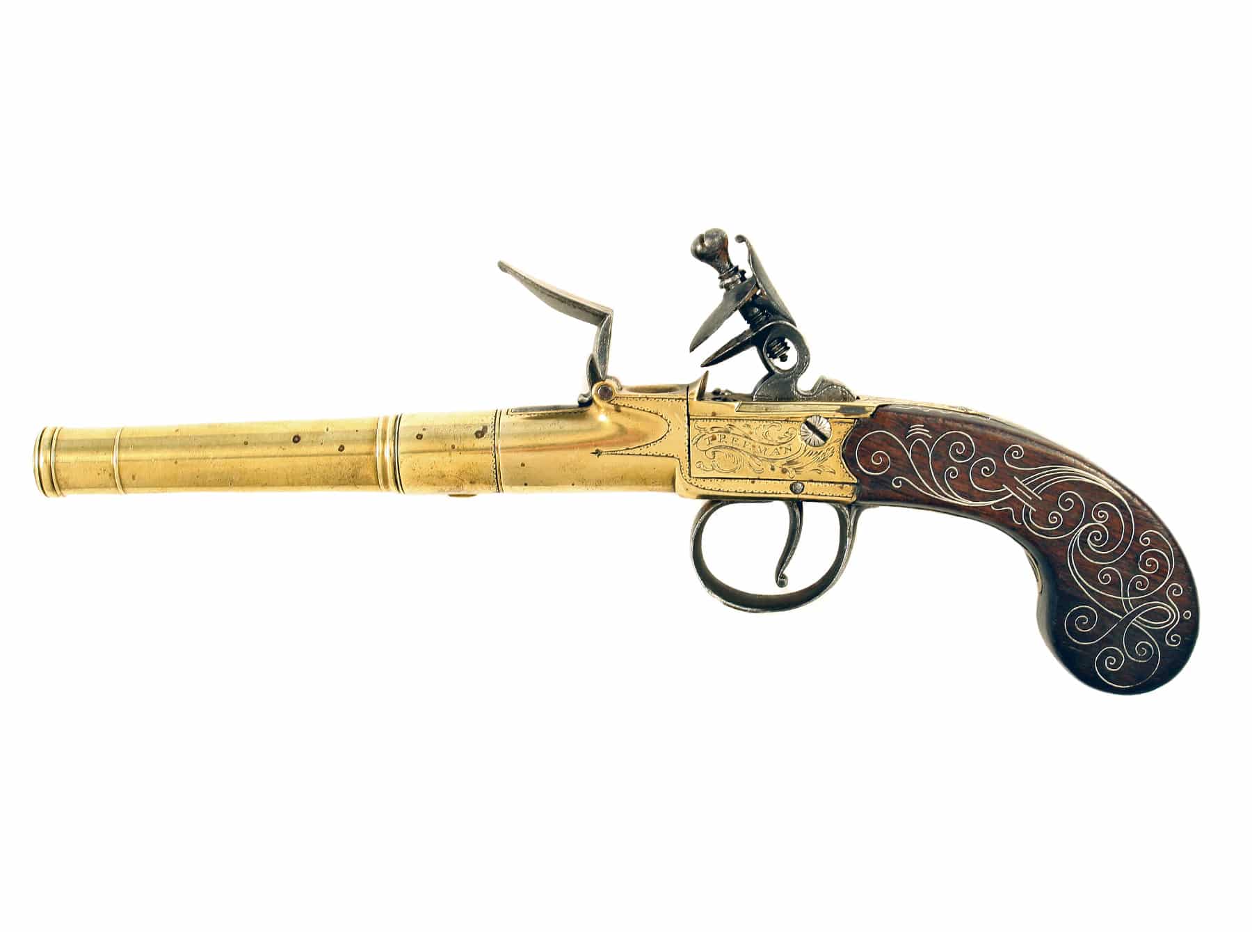 A 40-Bore Silver Mounted Cannon Barrel Pistol by Freeman. With round three-stage cannon barrel, stamped at the breech with London proofs and barrel smiths mark IB, border engraved brass box lock action, signed FREEMAN on a foliate scroll to the left and LONDON to the right, sliding steel trigger guard safety, with slab sided walnut butt inlaid with scrolling silver wire.