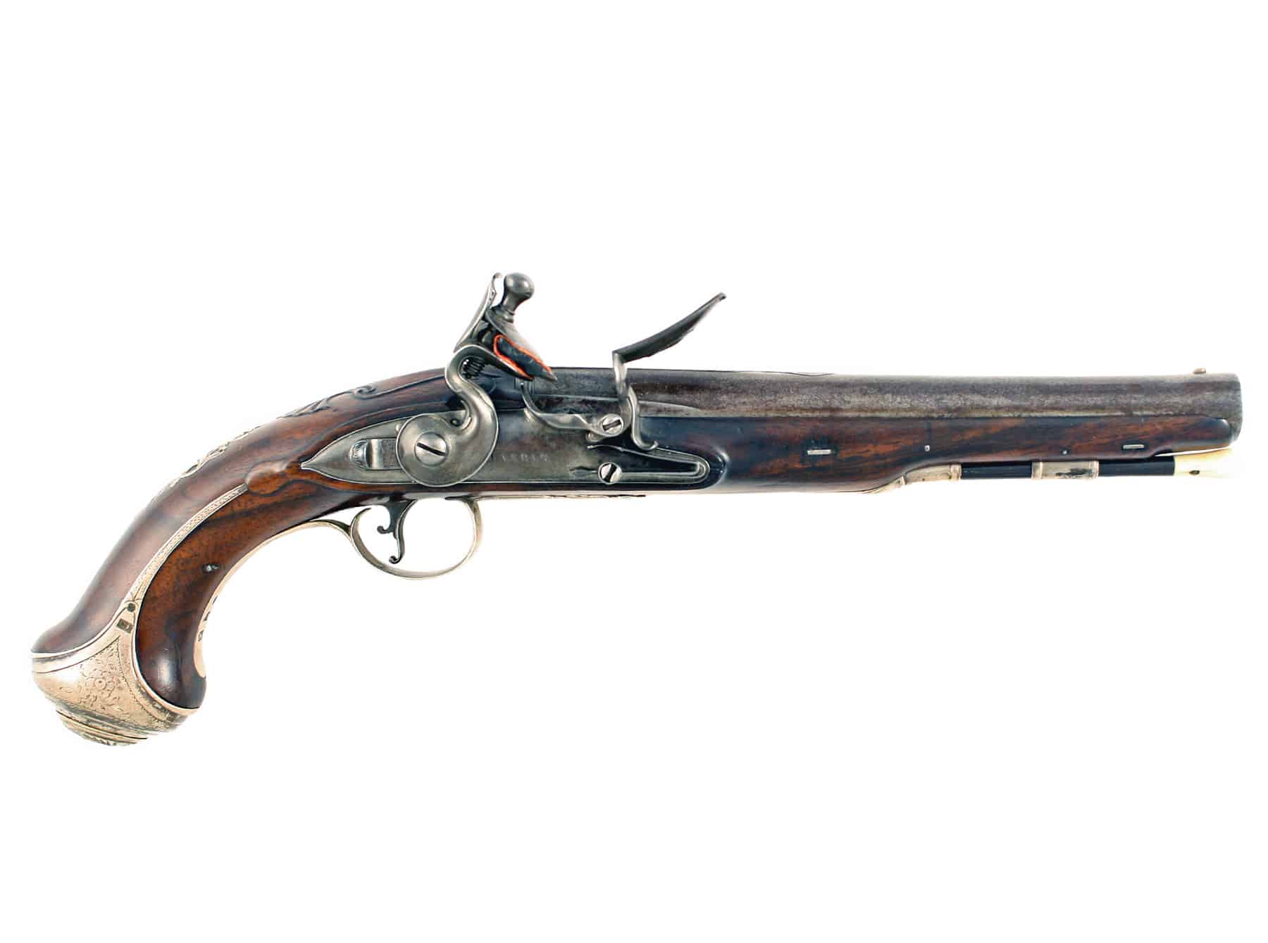 A Sleepy Pair of Silver Mounted Holster Pistols by Barbar of London. With swamped sighted barrels, signed on a raised central ribs ‘BARBAR LONDON’ decorated with sprays of foliage at the breech and stamped with London proofs and Foreigners marks, foliate engraved tangs cut with a deep sighting grooves, rounded locks, signed BARBAR fitted with sliding safety catches, moulded cocks, full-stocked in walnut with raised mouldings around the locks and foliate mouldings around the tangs, (old repair to one fore-end and at the tail of one of the locks) engraved silver mounts comprising pierced side-plates depicting stands of arms, escutcheons decorated with stands of arms, long-eared butt caps stamped with silver hall-marks, trigger guards with unusual stand of arms finials, silver ramrod pipes and horn tipped ramrods with worms.
