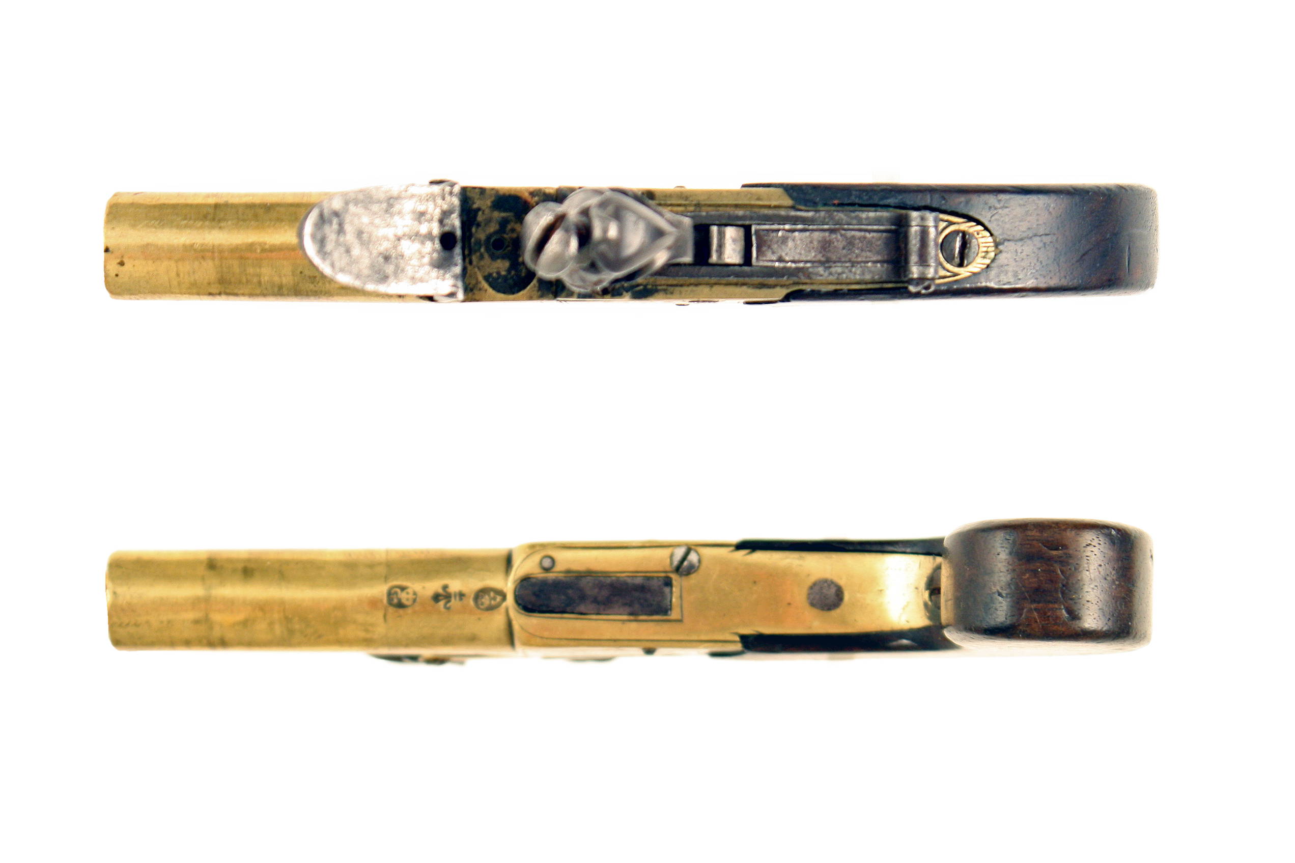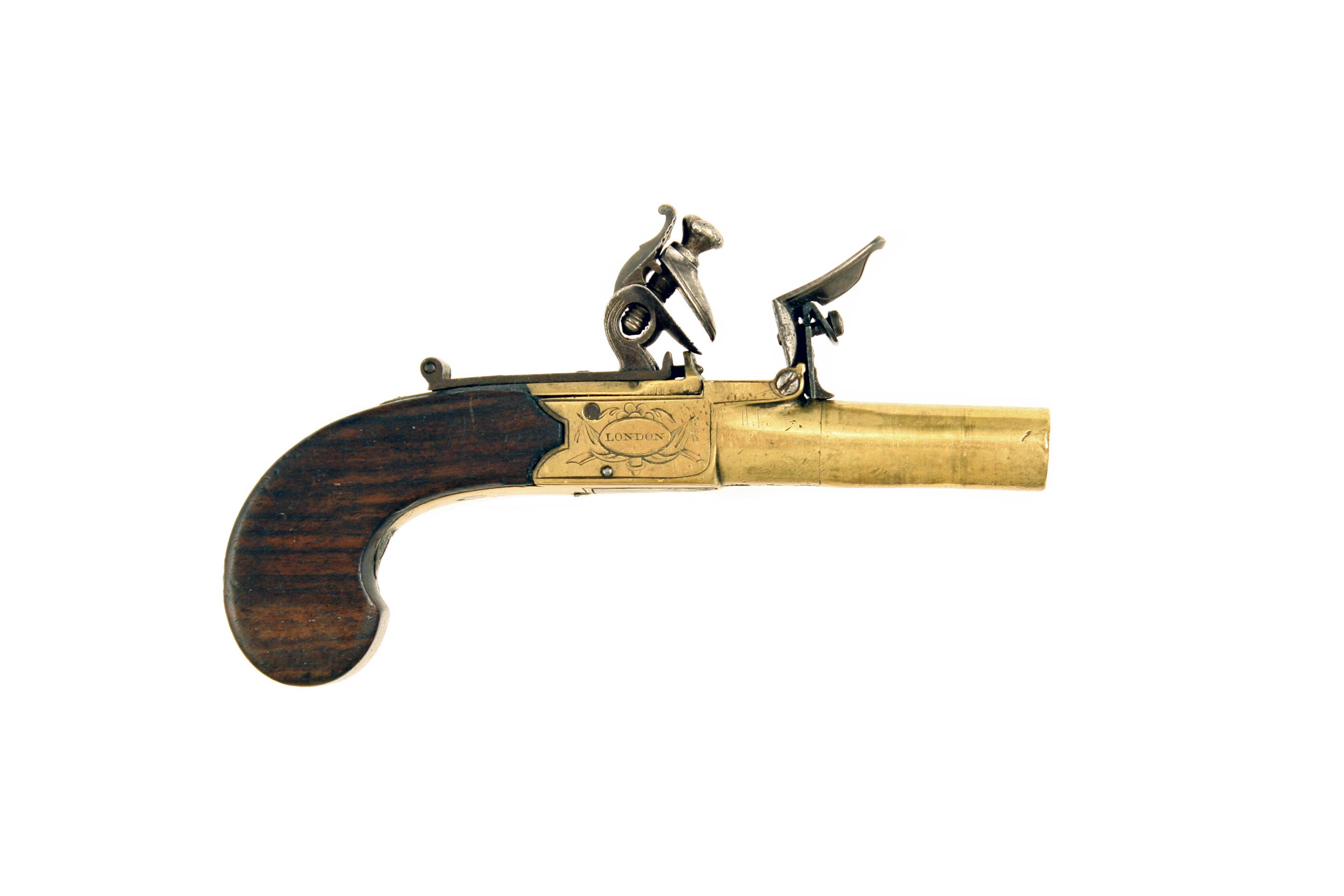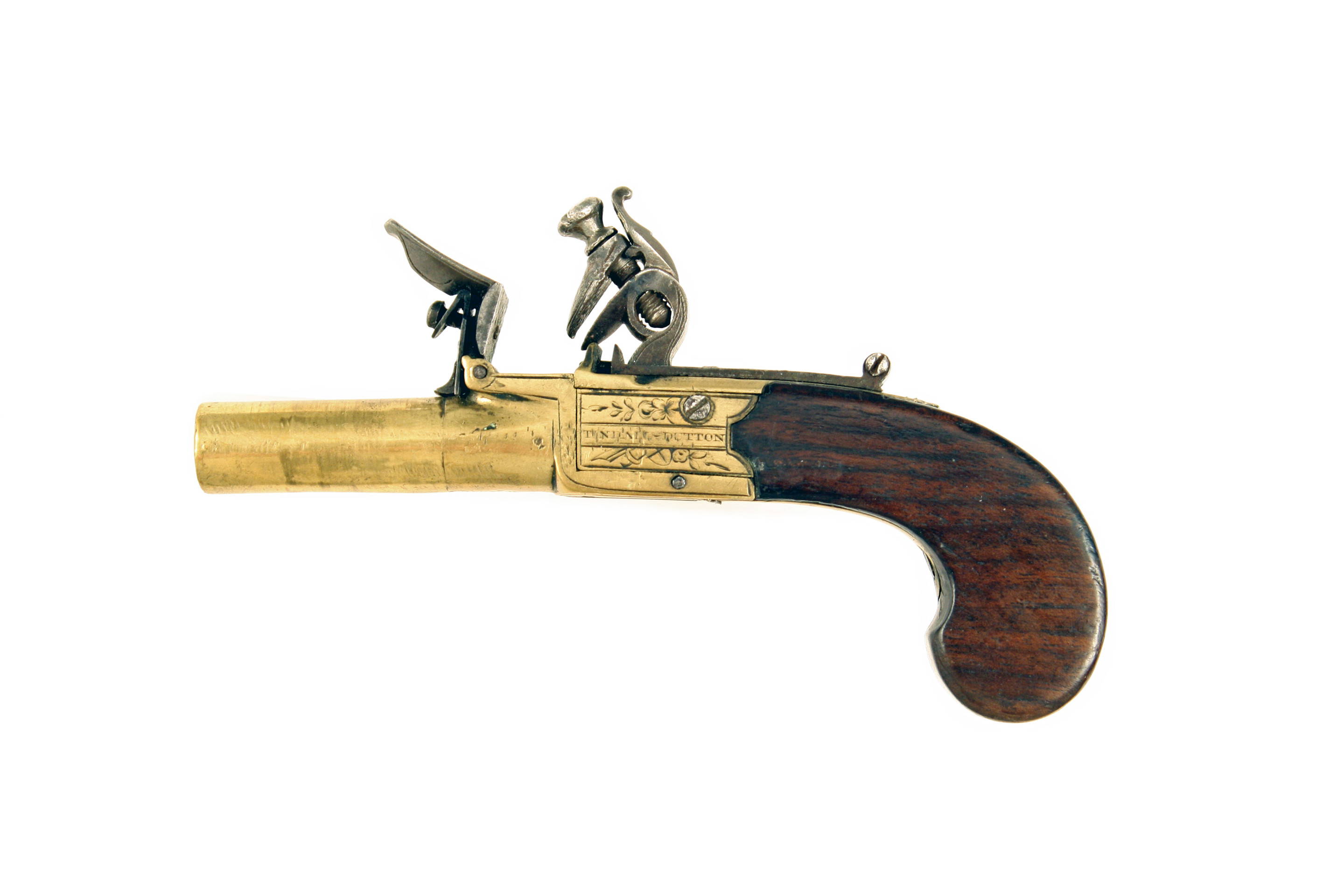 A Small Flintlock Pocket Pistol by Tindal & Dutton of London. With round turn-off barrel, stamped below with London proofs and fluer-de-lis mark, engraved box-lock action, signed ‘TINDAL & DUTTON’ surrounded by foliage to the left and ‘LONDON’ within an oval to the right, fitted with a sliding safety catch that also locks the pan, slab sided walnut butt with vacant rectangular escutcheon.