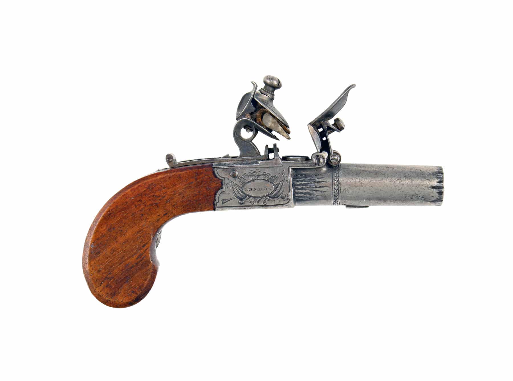 A Small Pair of D.Egg Pocket Pistols. With round turn-off barrels, decorated with geometric bands at the muzzles, geometric bands at the breeches, stamped below with London proofs, border engraved box-lock actions, decorated with star-bursts underneath the pans, signed within an oval to the left, ‘EGG’ and ‘LONDON’ to the right, sliding thumb-piece safety catches, slab sided walnut grips, blued fold down trigger guards.