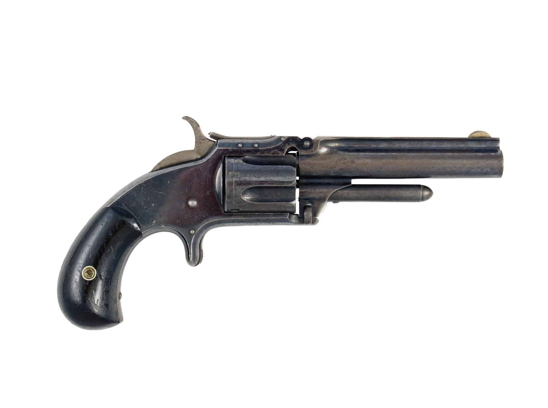 A Smith & Wesson No. 1 1/2 Five Shot Revolver. With blued round barrel with long rectangular rid along the top, stamped SMITH & WESSON SPRINGFIELD MASS. PAT. Pivoting upwards for loading, blued fluted five-shot cylinder, blued frame and back-strap, spur trigger, figured rounded grips, retaining some original finish.
