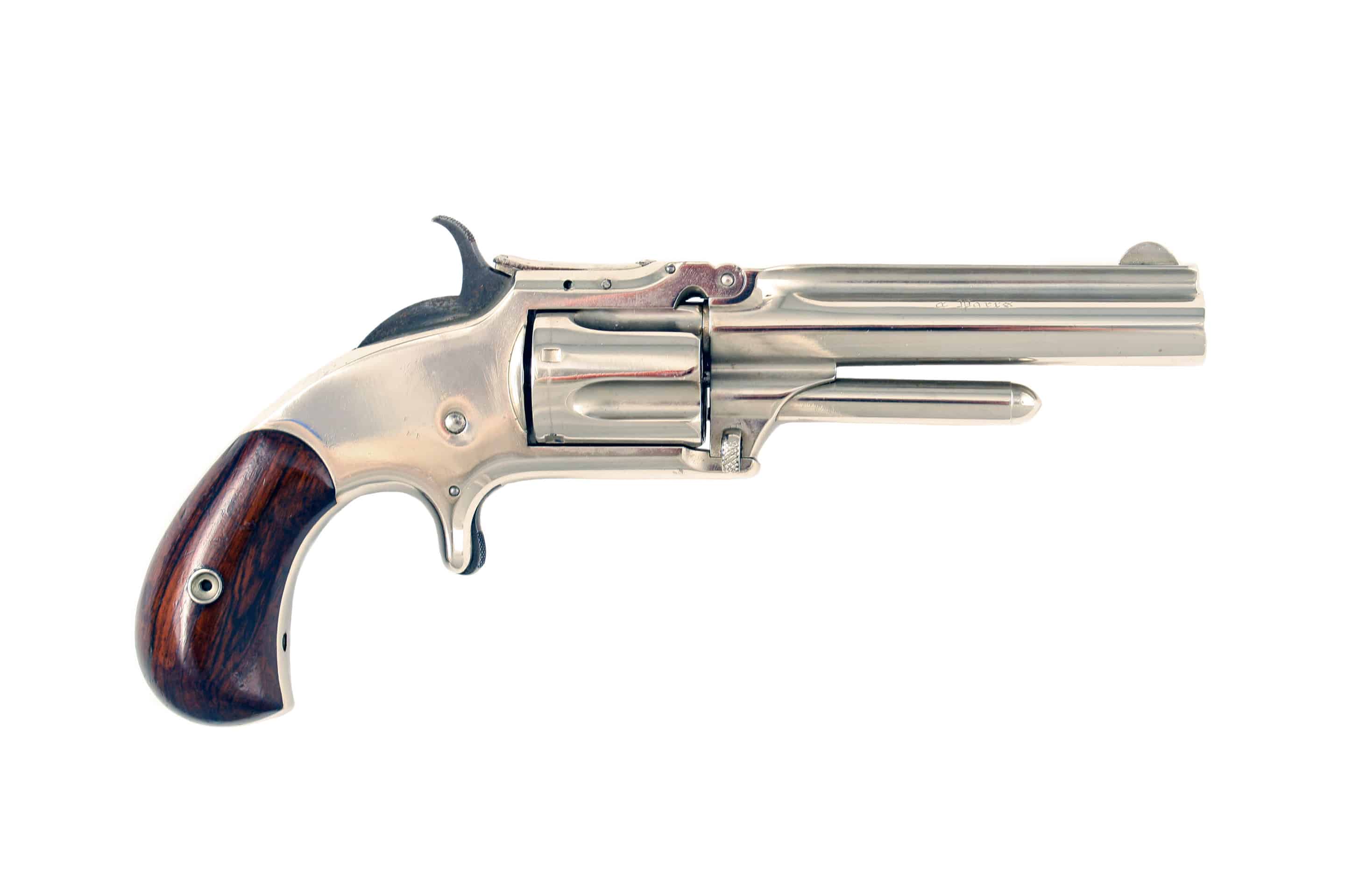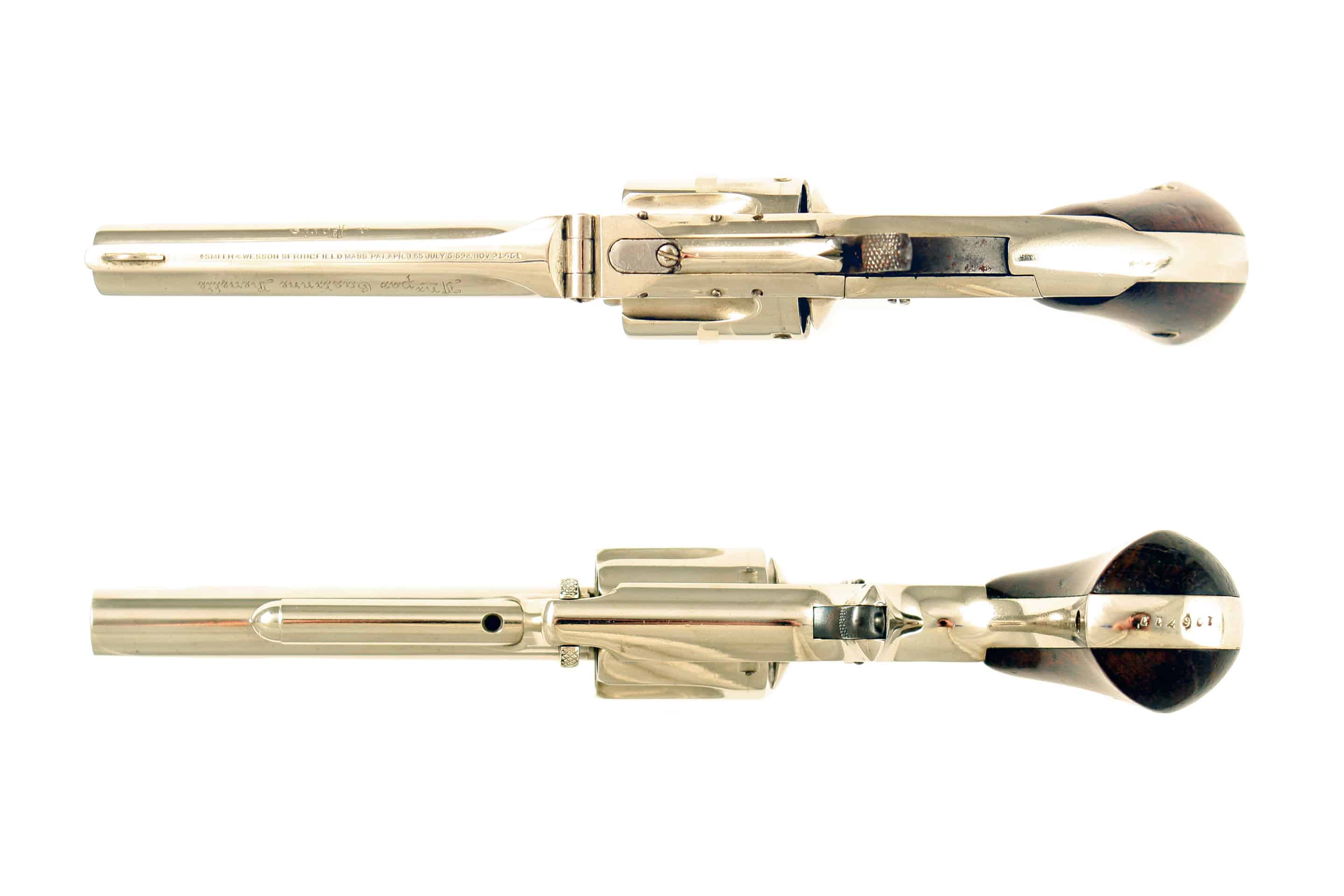 A Smith & Wesson 1 1/2 Second Issue Revolver. With barrel pivoting upwards for loading and stamped with patent dates along the sighting flat, blade-fore sight, fluted cylinder, nickel frame with cylinder-stop in the top-strap, engraved with Gastinne Renette retailers information along the barrel, spur trigger and bird’s head butt in one piece, chequered hammer, sprung release-catch and trigger, figured rounded grips, retaining all original finish.