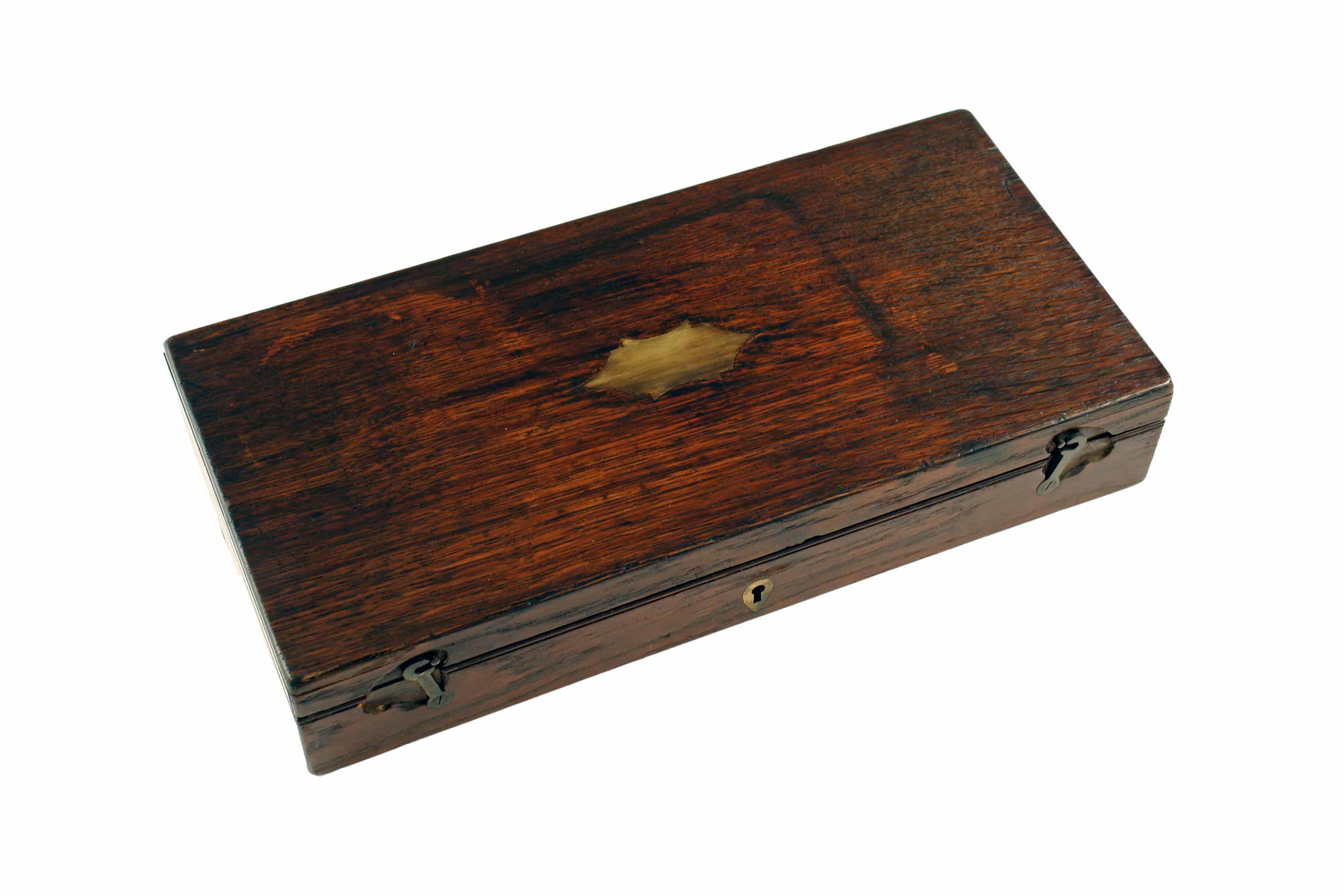 With blued octagonal sighted barrel and top-strap, the former signed in full on the top flat and engraved with a band of foliage at the muzzle, blued serial numbered cylinder, case-hardened border and scroll engraved frame with sprung plunger hammer safety-stop on the left side, blued border and scroll engraved trigger-guard, blued Westley Richards patent rack and pinion rammer, chequered figured walnut spurred butt, and butt-cap with scroll engraved hinged trap-cover retaining large amounts of original blued finish, the remainder retaining much original blued finish, Birmingham proof marks, in dark oak fitted case lined in green baize with accessories including a revolver flask, oil bottle, turn-screw, and brass double-cavity bullet mould marked ‘WR 39’, the interior of the lid with trash label of ‘Westley Richards’, the exterior of the lid with shaped brass escutcheon.