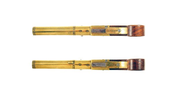 Notes: The pistols are made from gilt brass. Retaining what appears to be most of their original finish.