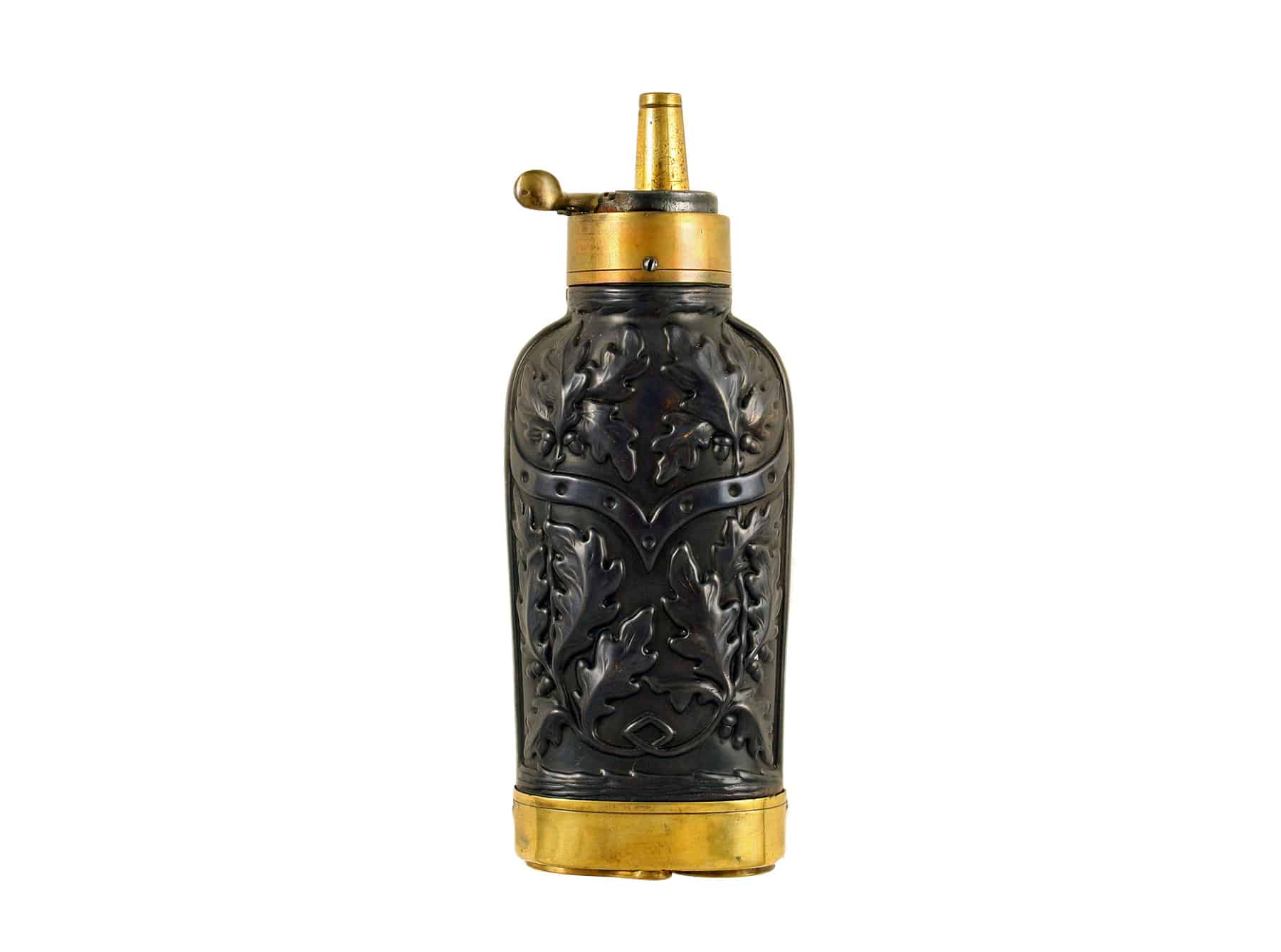 A Superb 3-Way Pistol Flask. Decorated on both sides with scrolling oak leaves, of oval section, with brass spout and two ball compartments at the base, small dent in brass at base, otherwise fine condition.