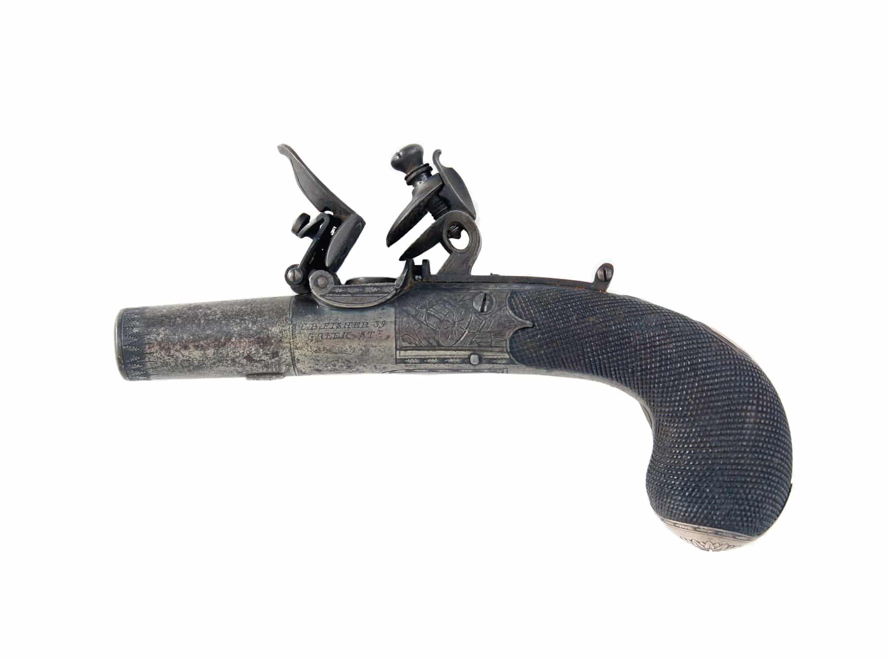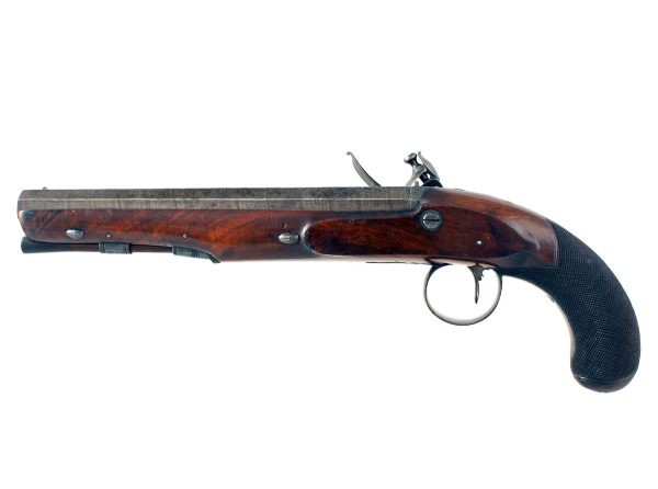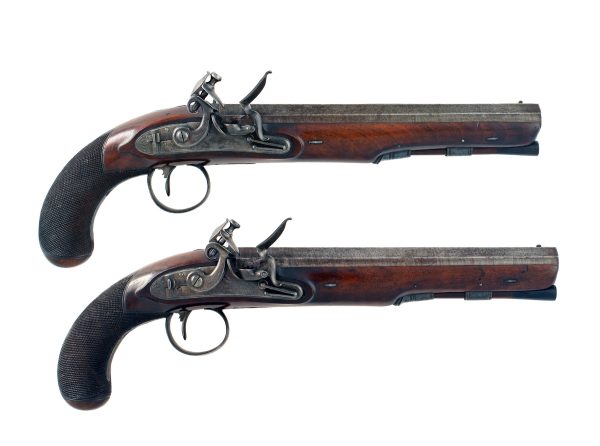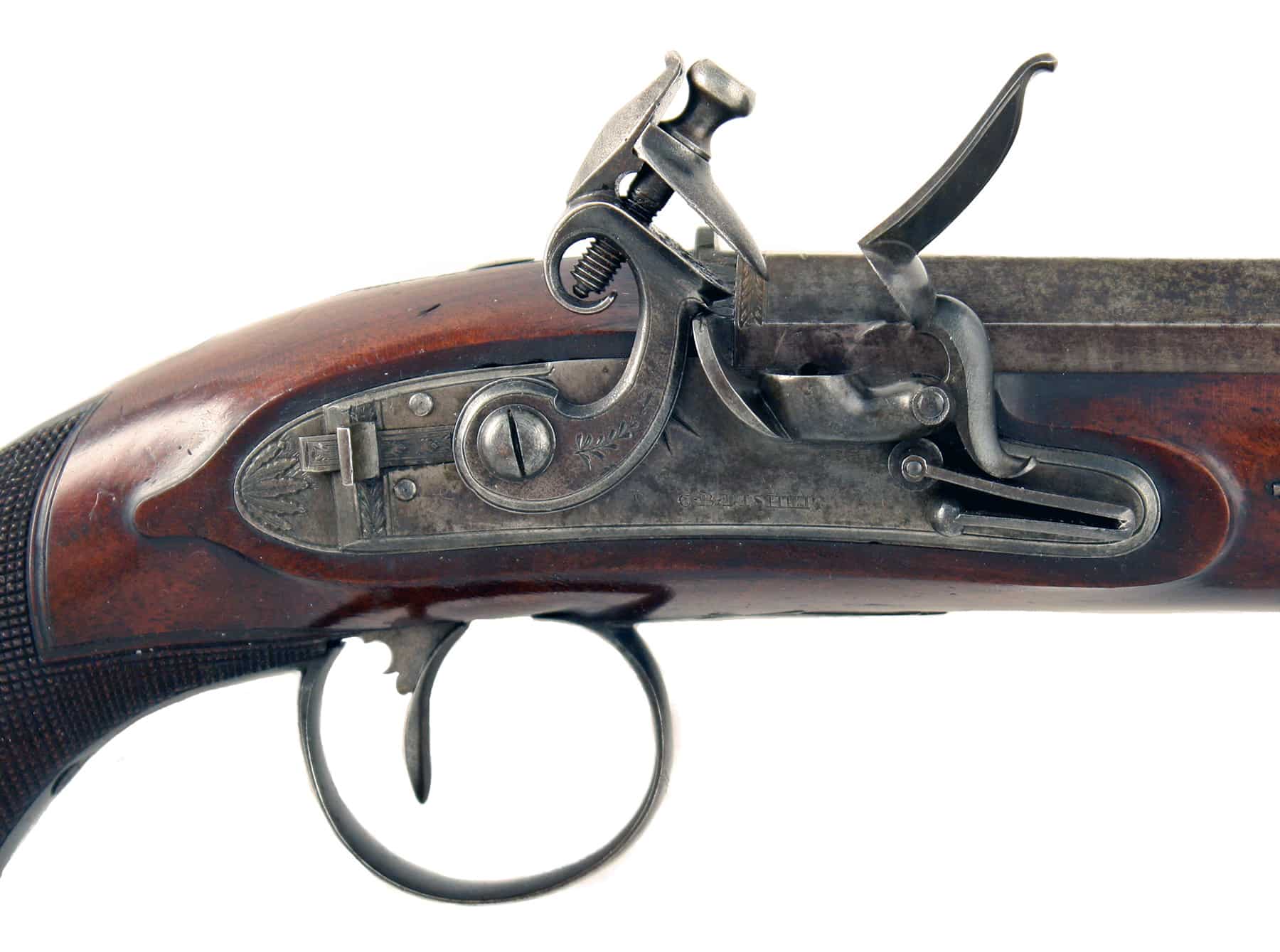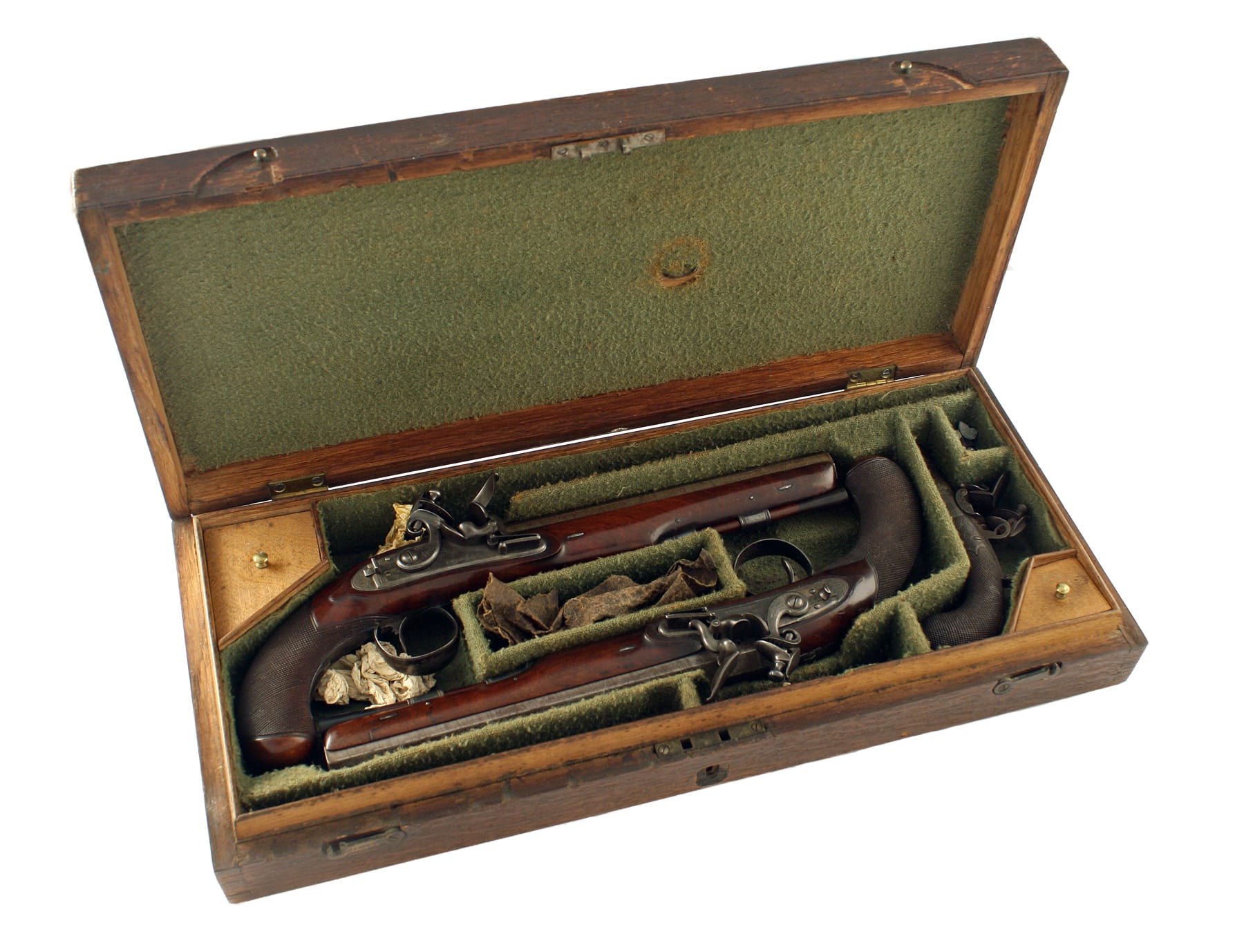A Superb Cased Set of Officers Pistols by C. B. Fisher, London. With sighted octagonal barrels, decorated with a geometric band at the breeches, sighted foliate engraved tangs, stepped bevelled locks, signed ‘C.B. FISHER’ fitted with sliding safety catches, ‘French style’ cocks, full stocked in walnut, cut with chequering at the grips, blued steel mounts comprising trigger guard decorated with a shield surrounded by foliage on the bows and pineapple finials, turned ramrod pipes and horn-tipped ramrods, both pistol retain gin a large amount of original faded finish, very crisp overall, cased with a round framed pocket pistol, with round turn-off barrel, decorated with a band at the muzzle, engraved panels decorated with stands of arms, signed C.B. Fisher on one side and Soho London on the other, fitted with a sliding safety catch, swelling chequered walnut butt, with vacant silver escutcheon and engraved silver butt cap; in original lined and fitted case with some accessories including loading rod, bullets, flints, the exterior of the lid with flush fitting carrying handle.