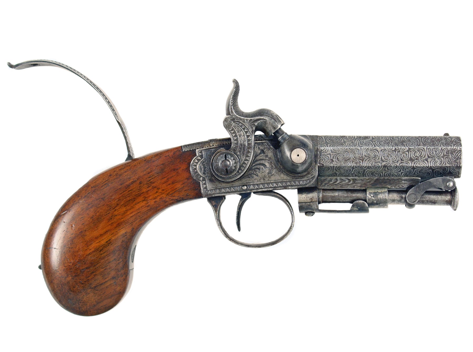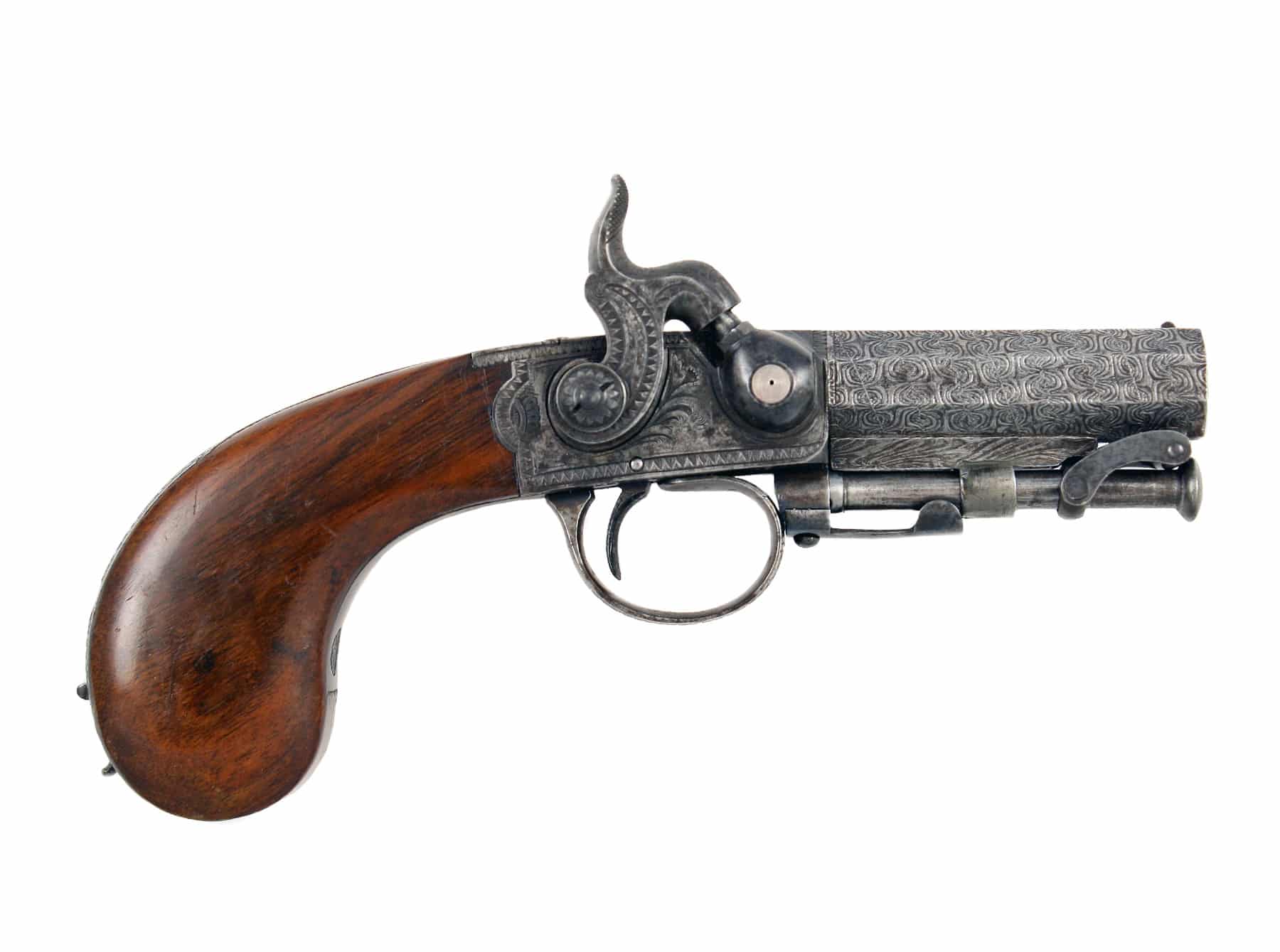 A Superb Pair of Cased 32 Bore Rigby Magazine Pistols. With etched twist octagonal sighted barrels each engraved ‘Dublin’ on the top flat, pierced platinum plugs, sighted actions finely engraved with characteristic scrollwork on hatched ground and each with three bents, swelling butts with engraved hinged covers revealing cavities fro balls and caps, engraved trigger guards and stirrup ramrods, ramrod unscrew to reveal worms: in original blue velvet lined and fitted case with accessories in eluding unusual screw-top powder flask, bullet mould and oil bottle, etc, the lid with trade label.