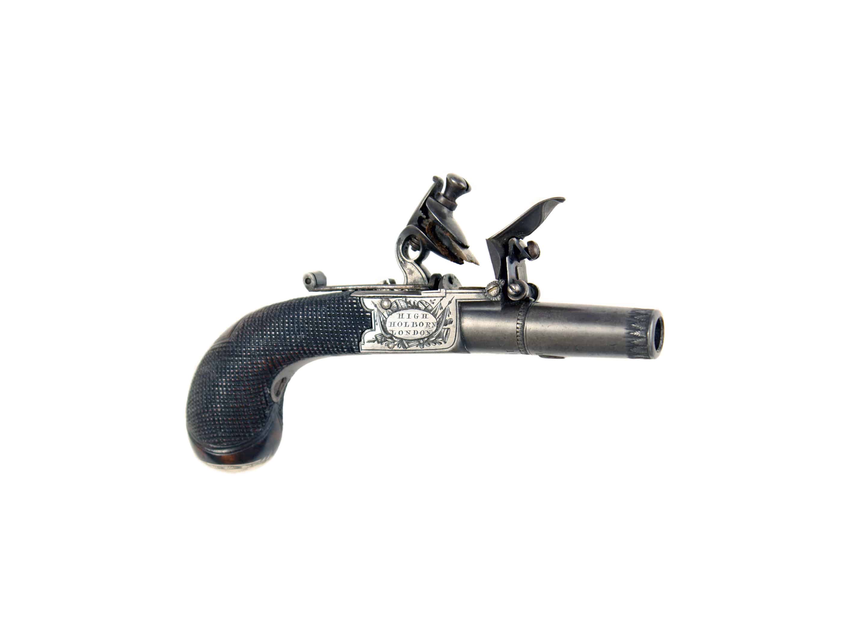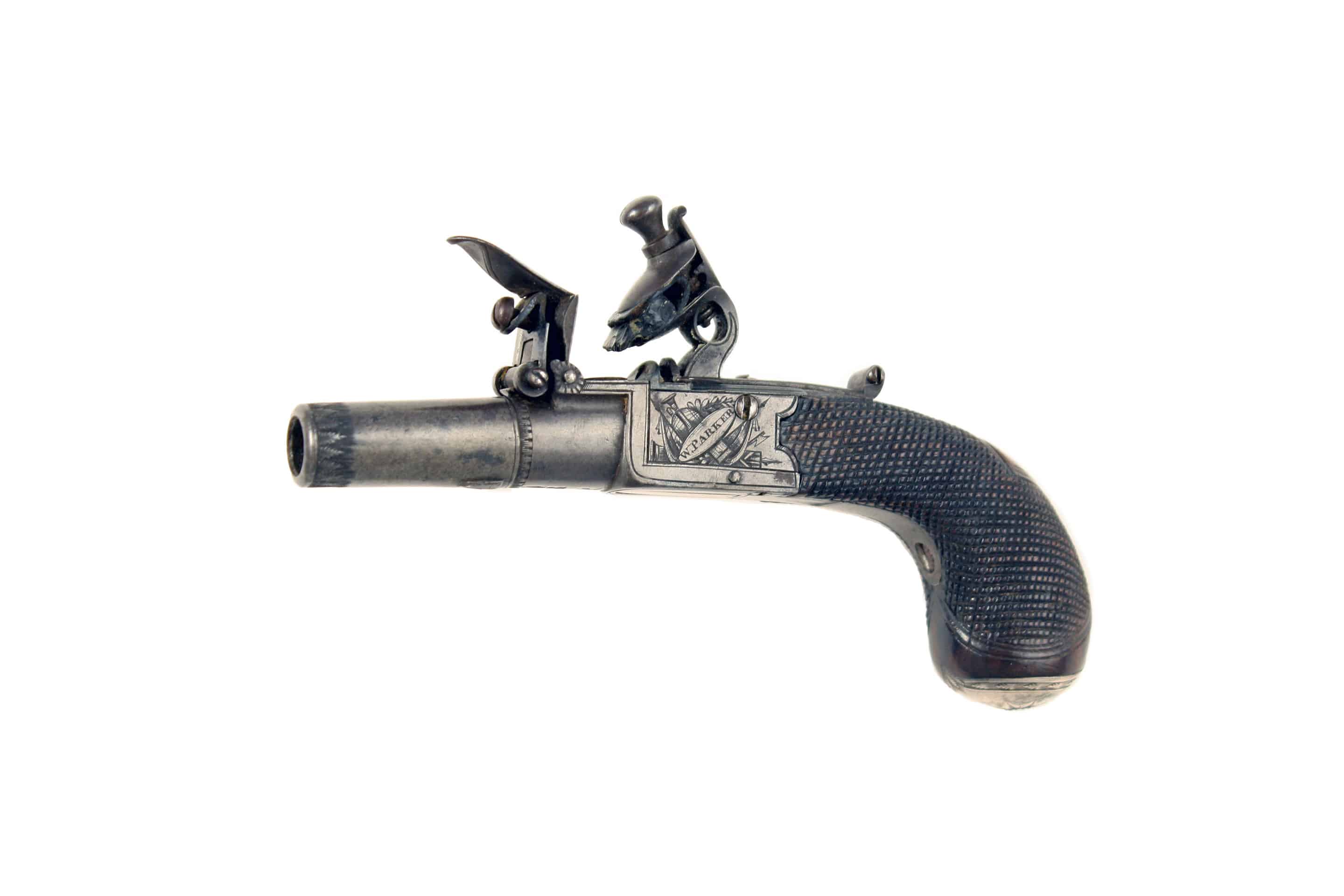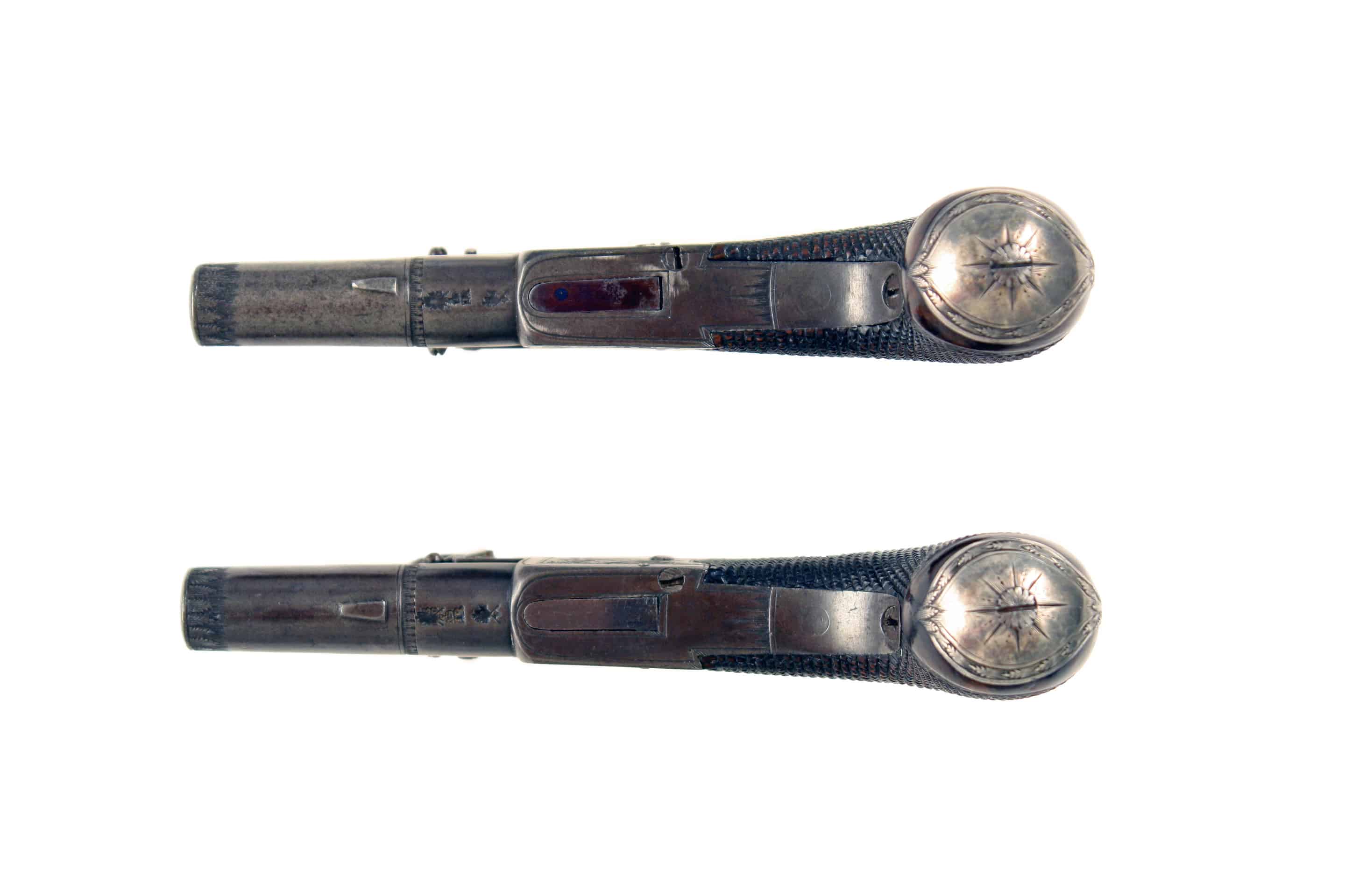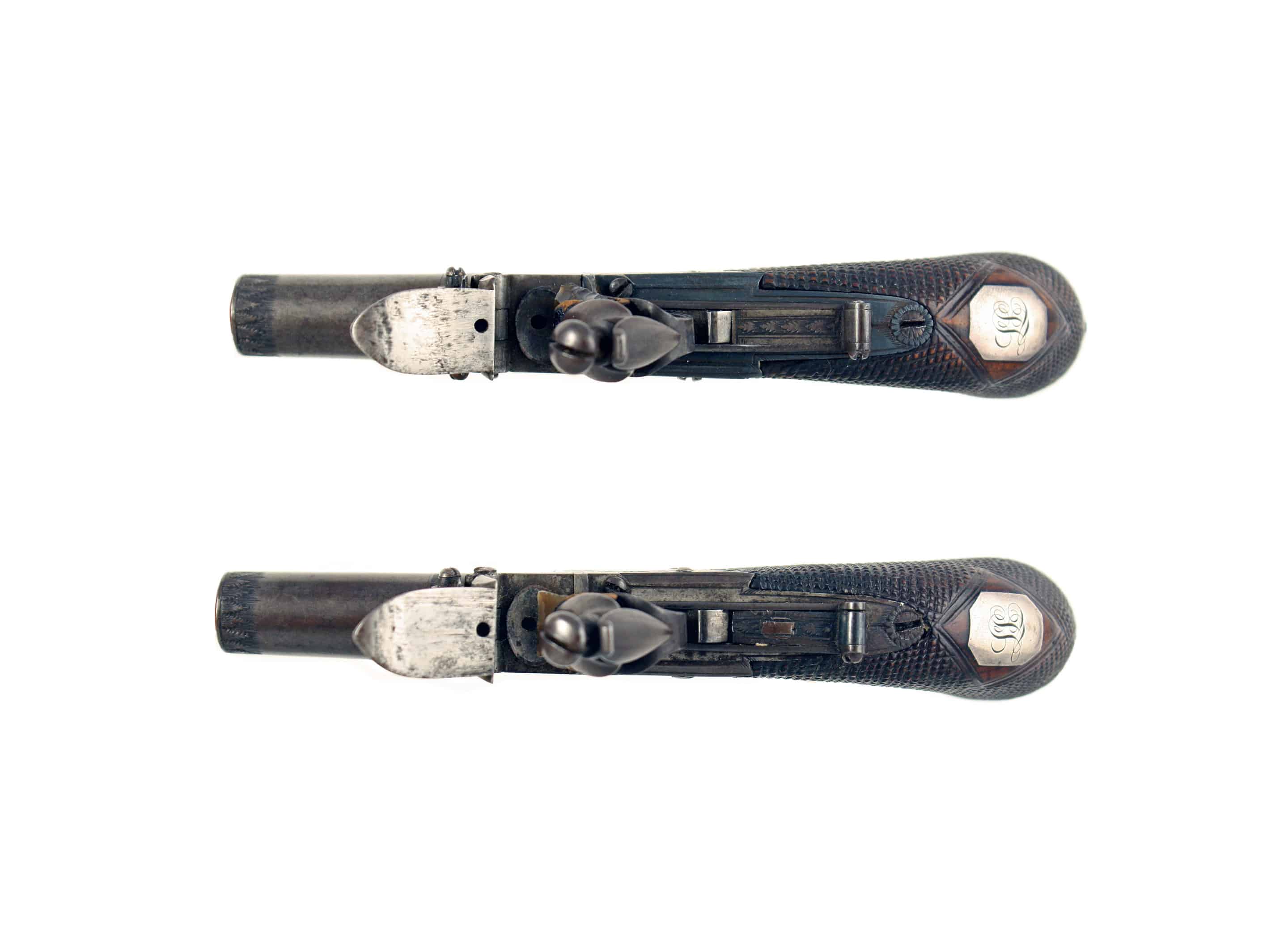 A Superb Pair of Small Flintlock Pocket Pistols by W. Parker, London. With round turn-off barrels, decorated with a foliate band at the muzzles and at the breeches, border engraved box-lock actions, signed ‘W.PARKER’ within an oval surrounded by stands of arms to the left and; ‘HIGH HOLBORN LONDON’ within and oval surrounded by stands of arms to the right, fitted with sliding safety catches that also lock the pans (one has an old reaper – see photographs) chequered swelling butts with rectangular escutcheons engraved with the original owners initials, ‘L.L.’ and with border engraved silver buttons caps, fold down triggers. In beautiful condition overall.