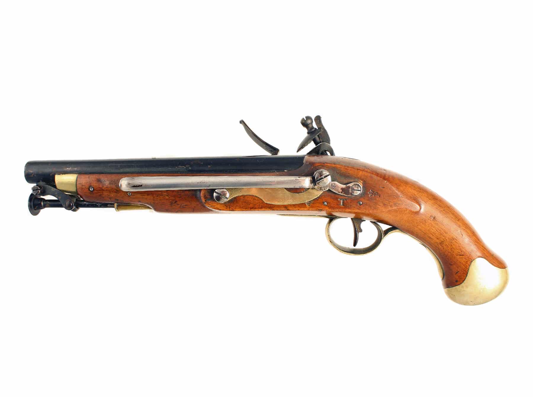 An Untouched William IV Flintlock Sea Service Pistol. With round barrel stamped with London proof marks and arsenal marks, flat border engraved lock stamped with WR beneath a crown, regulation full stock impressed with numerous assembly and arsenal marks, plain brass mounts comprising of side plate, trigger guard and original stirrup ramrod, fitted with steel belt hook. Retaining original munitions blacking. Very scarce to find them in this condition.